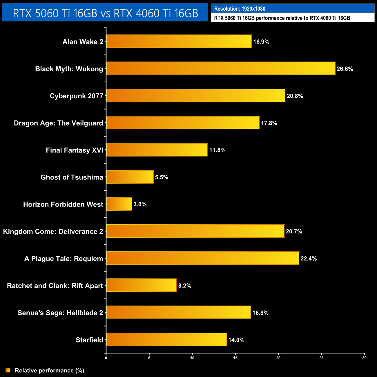 Here we take a closer look at the uplift over the 4060 Ti 16GB. At 1080p, the 5060 Ti 16GB is anywhere from 3-27% faster, quite the spread!