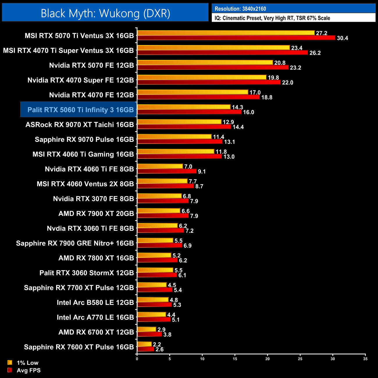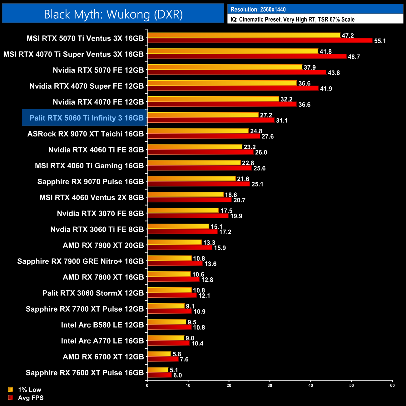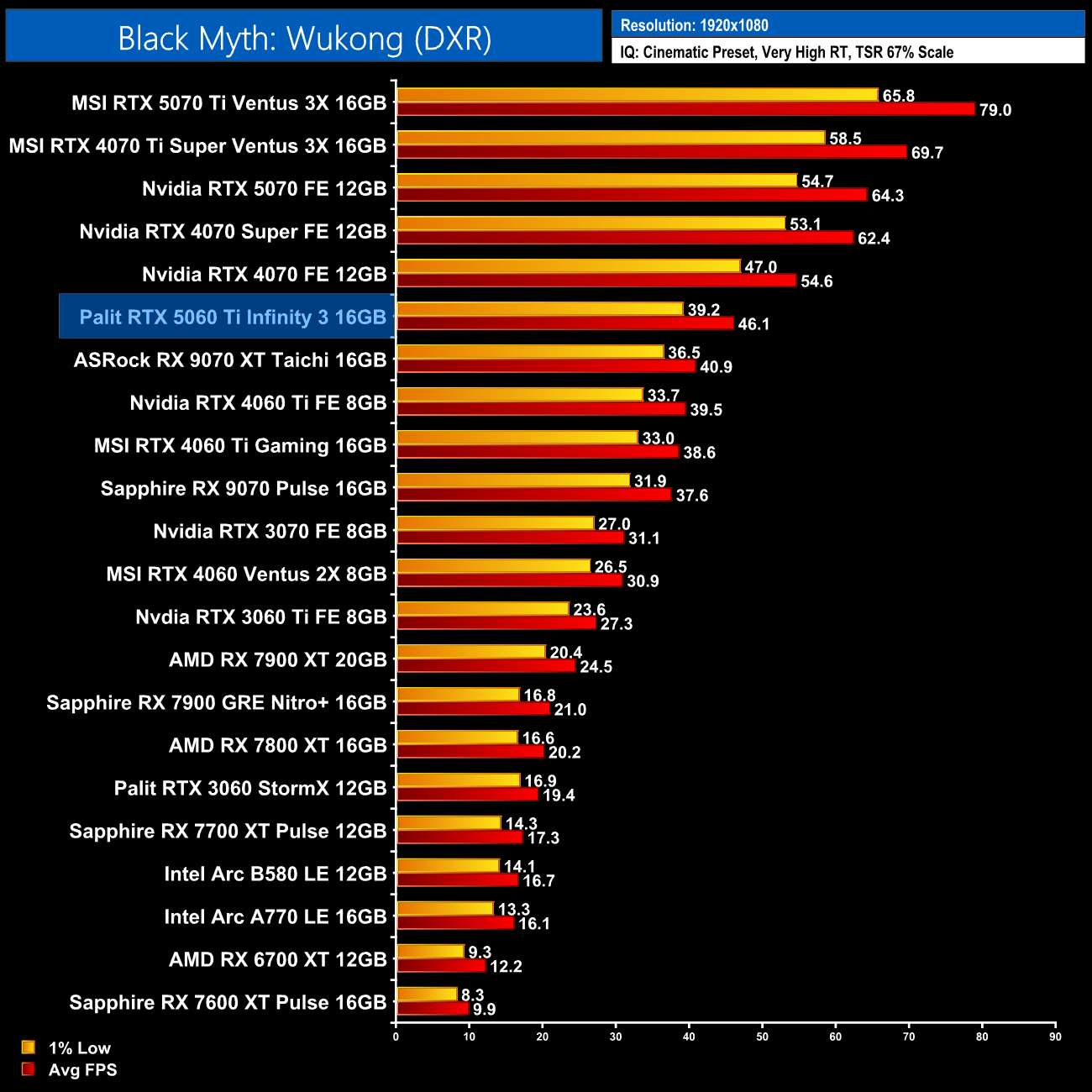 Black Myth: Wukong is similarly punishing as it also uses path tracing, this time the 5060 Ti 16GB is faster than even AMD's RX 9070 XT. It's also 22% ahead of the 4060 Ti 16GB.