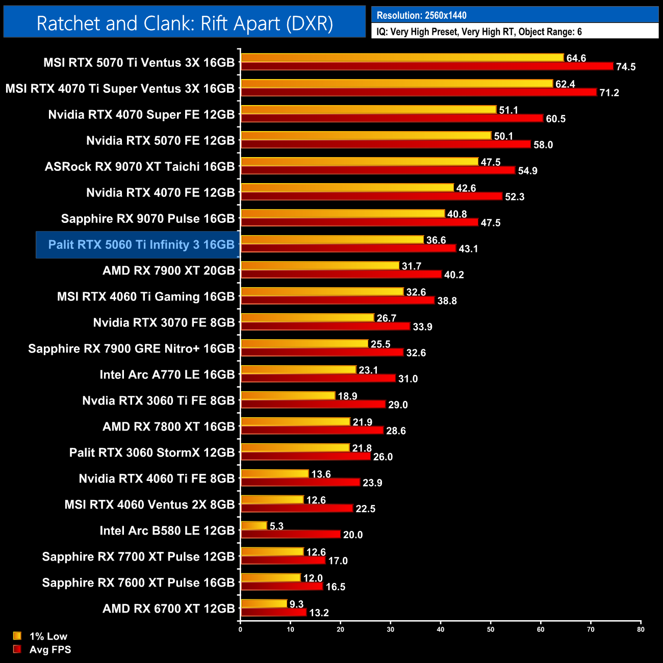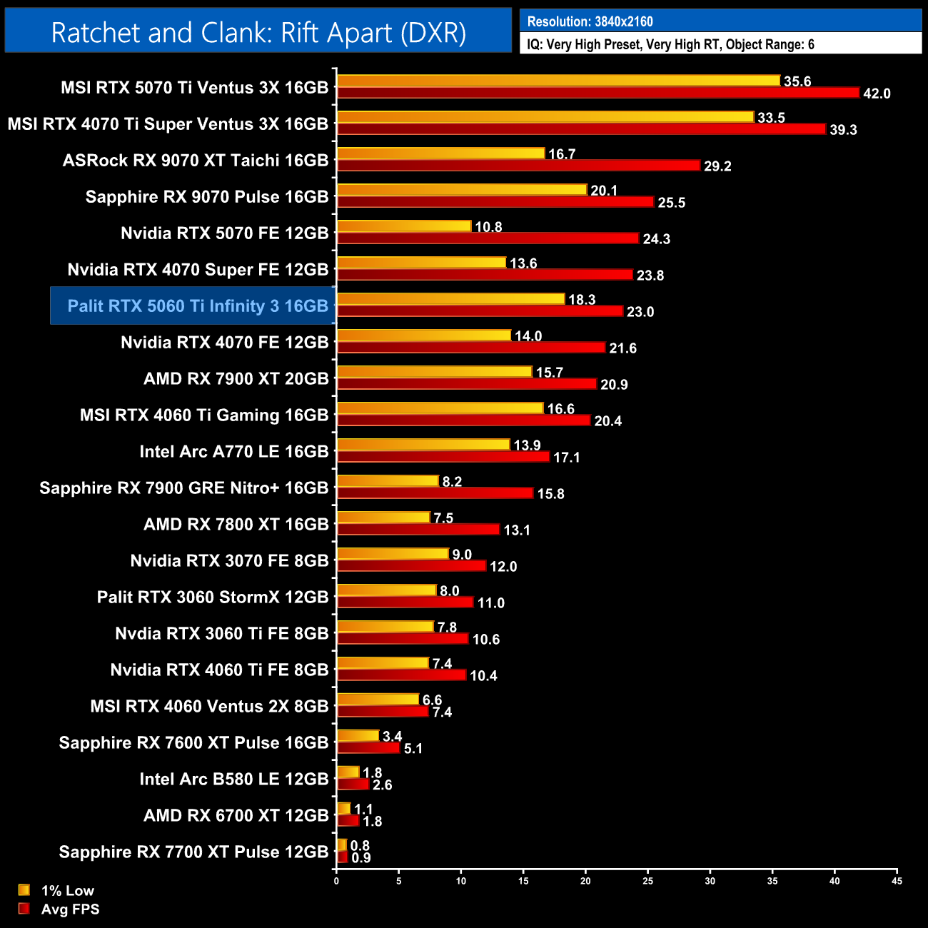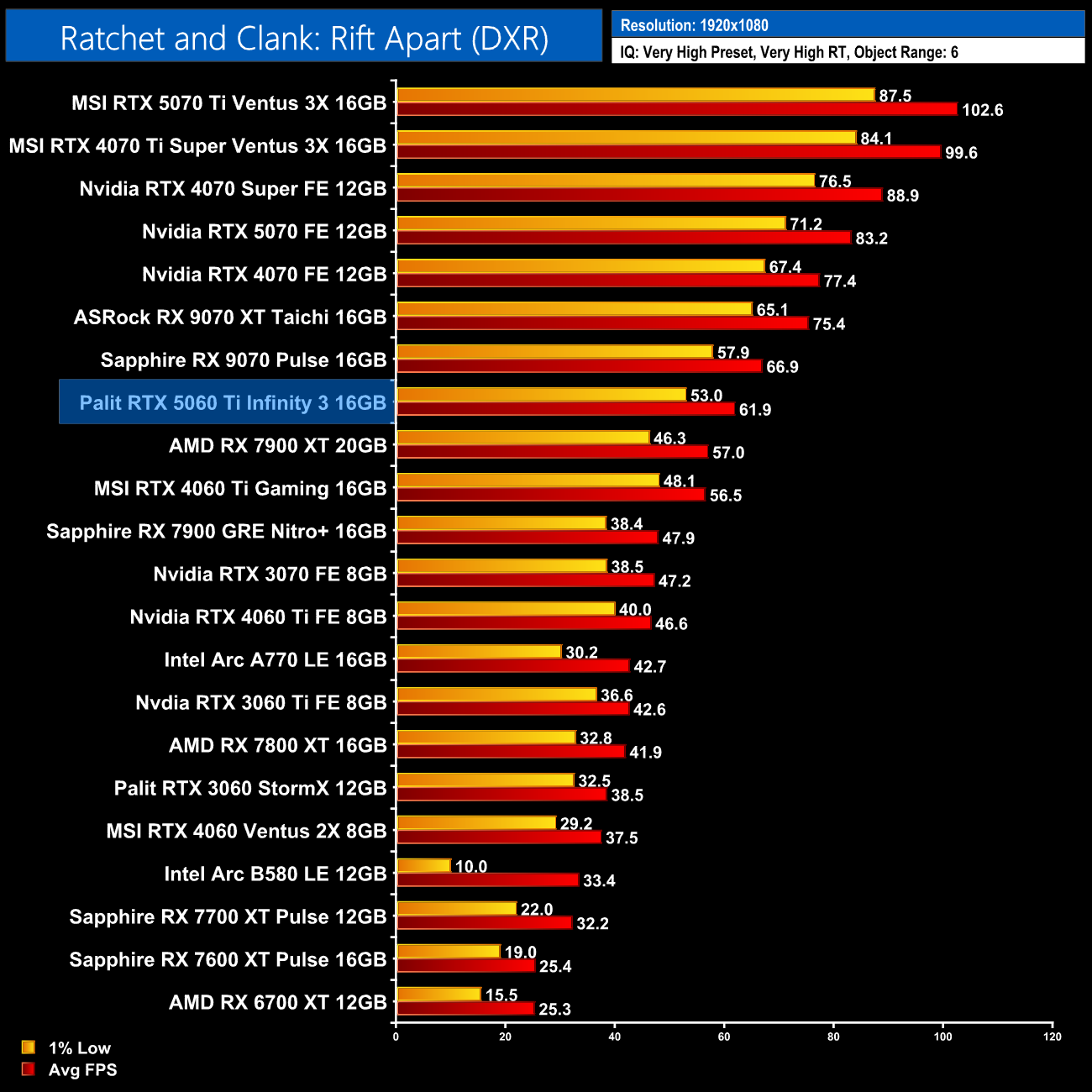 Ratchet and Clank does scale much better on Nvidia hardware with RT enabled – as evidence by the 5060 Ti 16GB coming within touching distance of the RX 9070, hitting 62fps on average.
