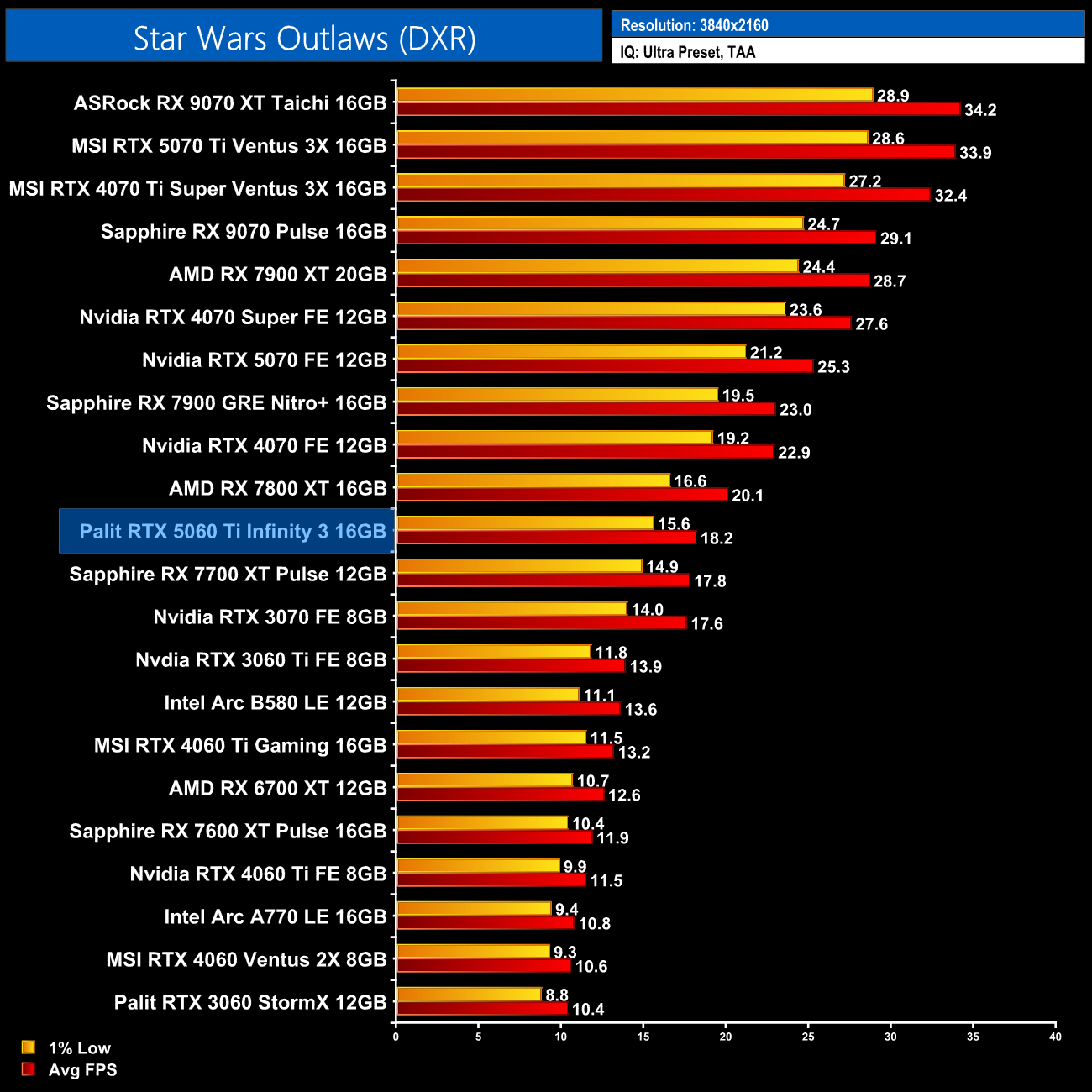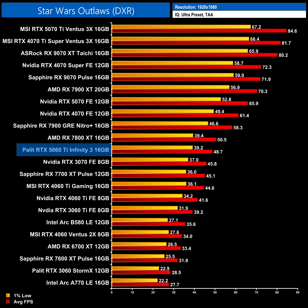 Lastly we come to Star Wars Outlaws, where the 5060 Ti 16GB delivers 49fps, putting it on par with the RX 7800 XT and marking an 11% improvement over its predecessor.