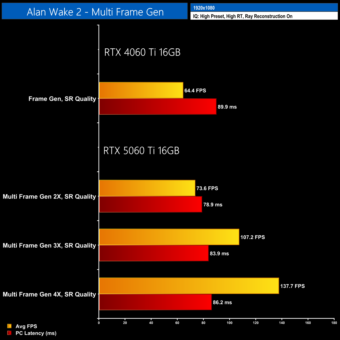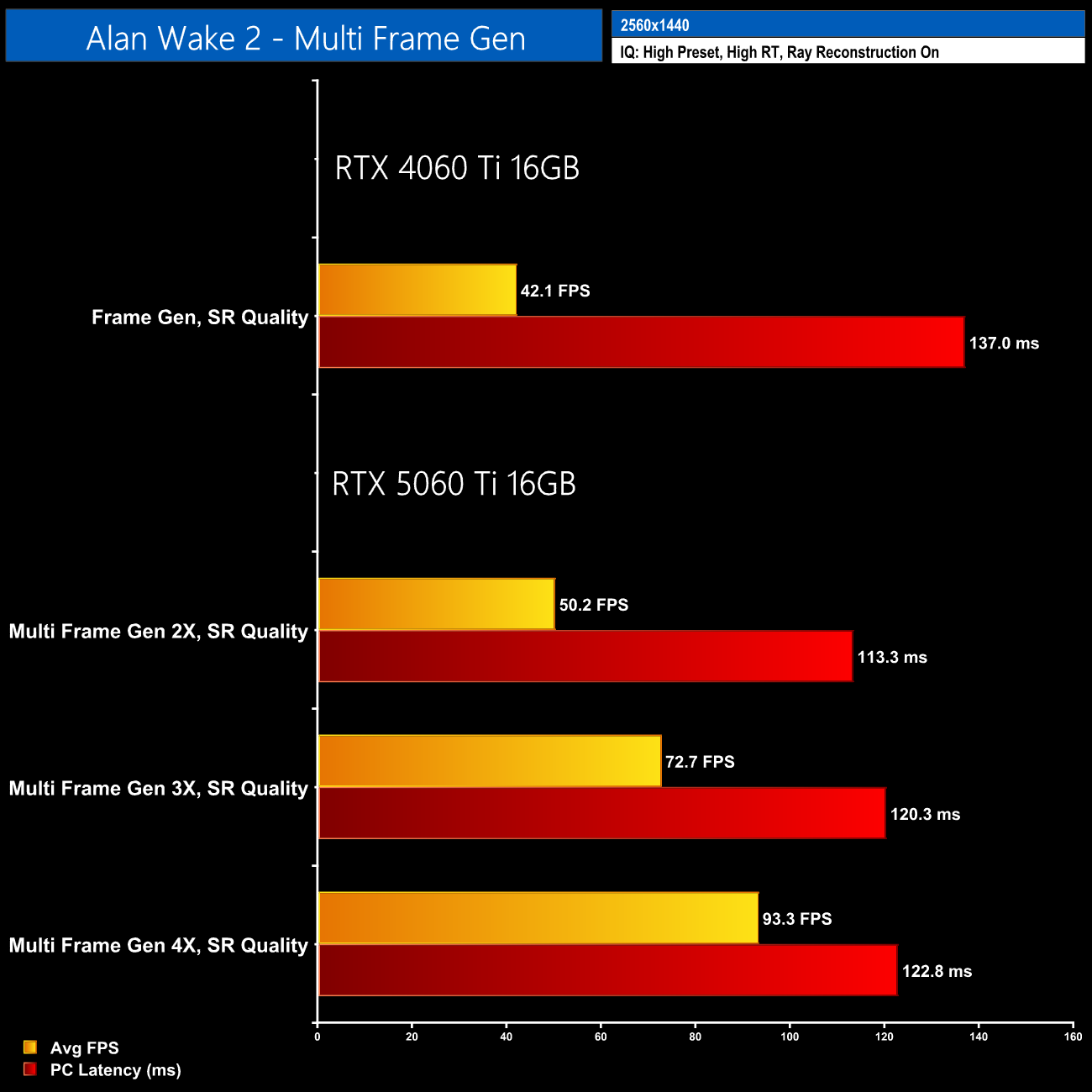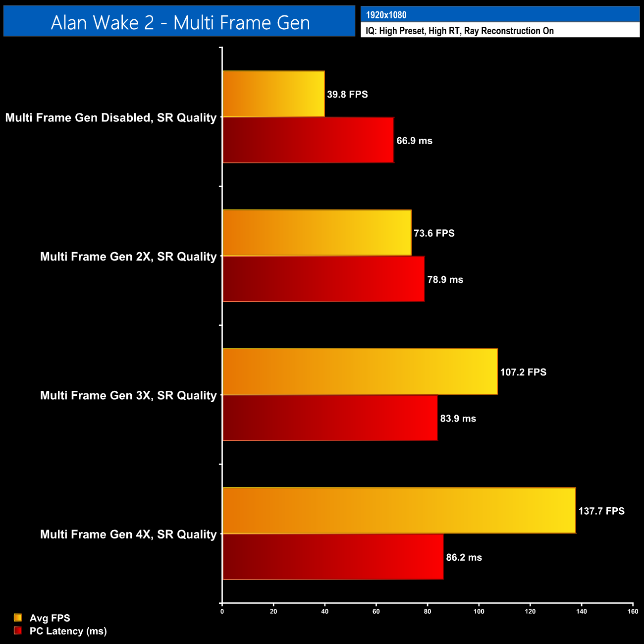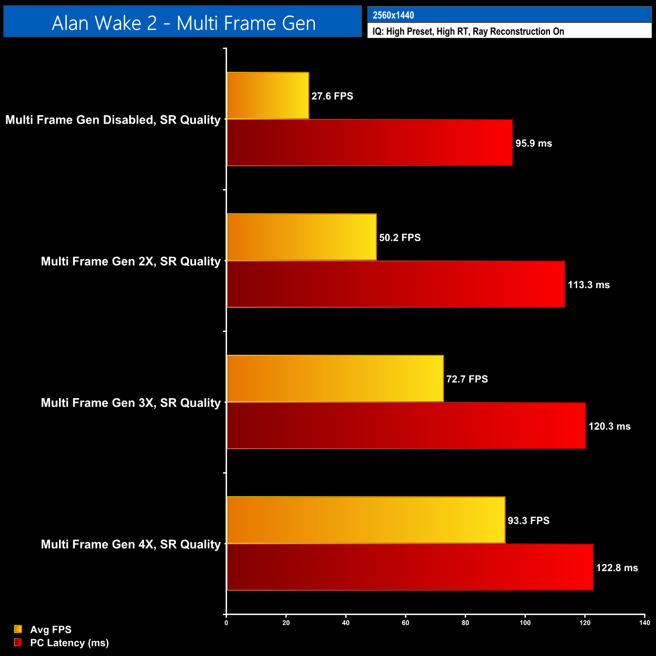 The same goes in Alan Wake 2 – 1440p with path tracing is just too much for this calibre of GPU, even with DLSS Quality, so when you add MFG on top, the latency increases to over 120ms.