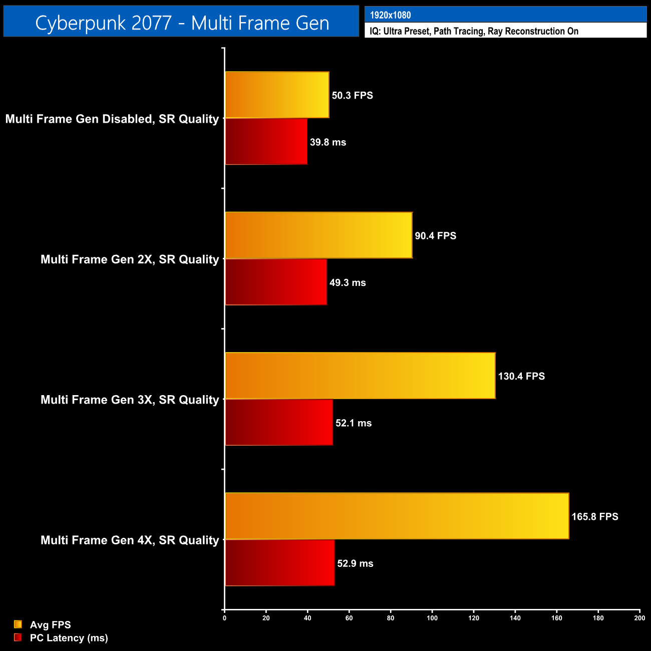 1080p is a much more realistic use case for MFG, as the base frame rate will be that much higher – here we topped out at 53ms of latency, with 42 ‘real' frames being rendered using MFG 4X, which is more playable.