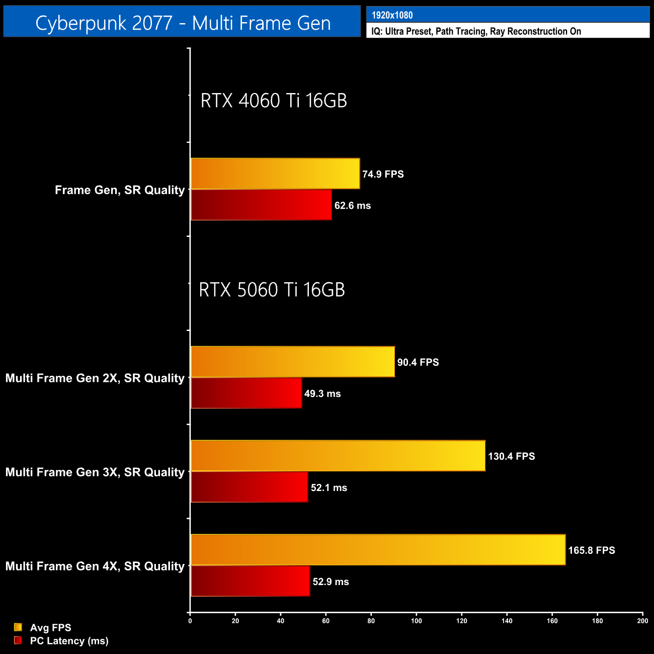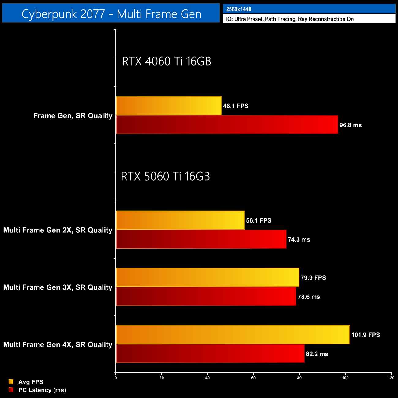 In regards to DLSS 4 Multi Frame Generation, I do want to point out what I believe to be some misleading marketing from Nvidia. The announcement presentation for the RTX 5060 Ti 16GB showed frame rates and latency for the GPU running Cyberpunk 2077 at 1440p, DLSS Quality mode, but with path tracing enabled. Using MFG 4X, Nvidia claimed 108fps and 81ms latency, and my own numbers actually aren't too far off that.