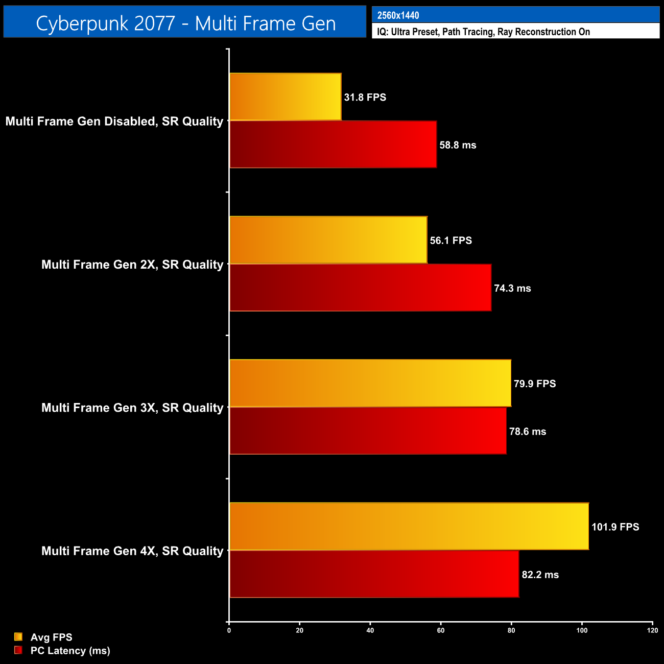 However, the numbers taken in isolation really lack context, and I do not think playing path traced games at 1440p with MFG 4X is a good idea on this GPU. For one, latency is silly high given the starting base frame rate is so low – given we averaged 102fps using MFG 4X, simple maths tells us only 26 of those frames were traditionally rendered, so that is a very low frame rate to start from.