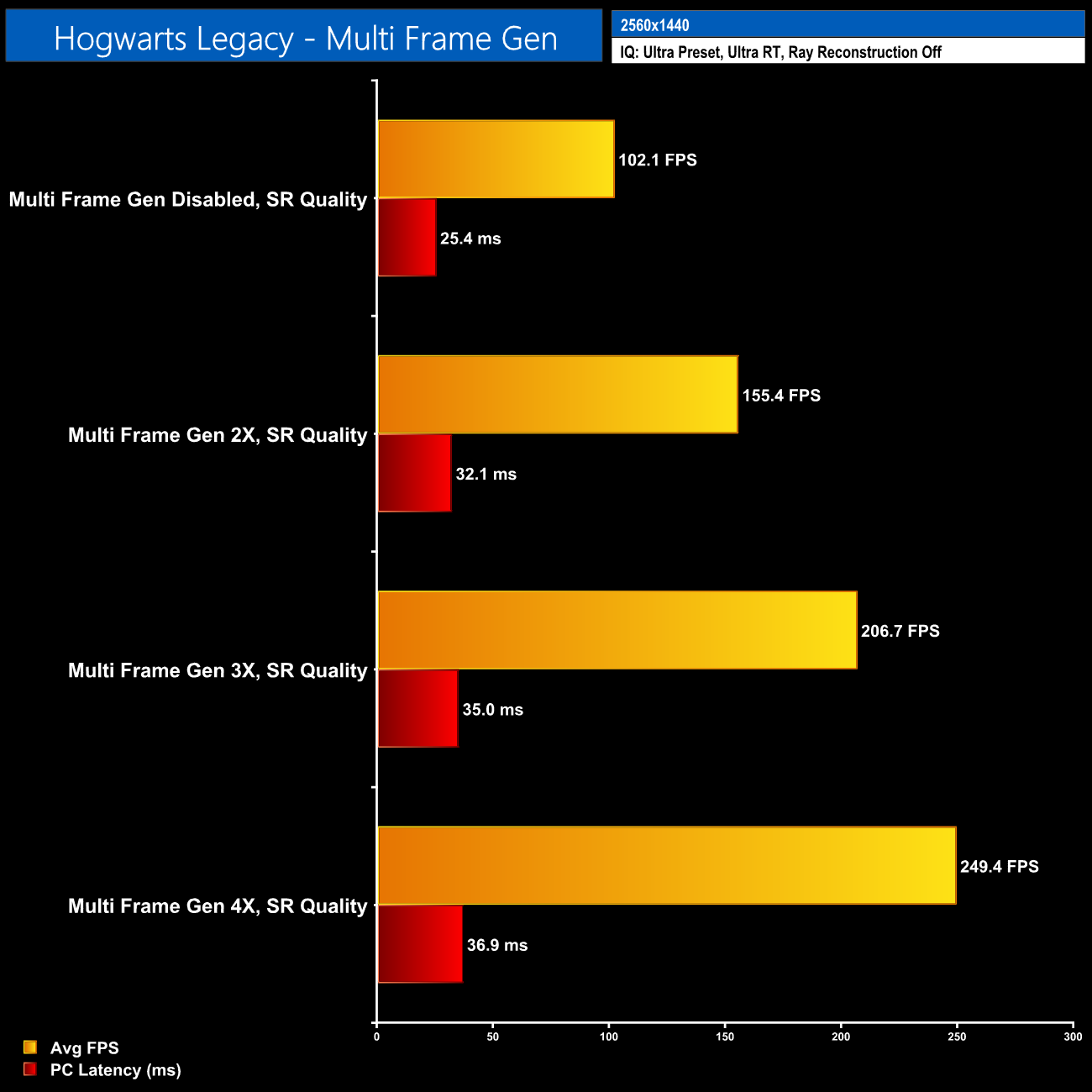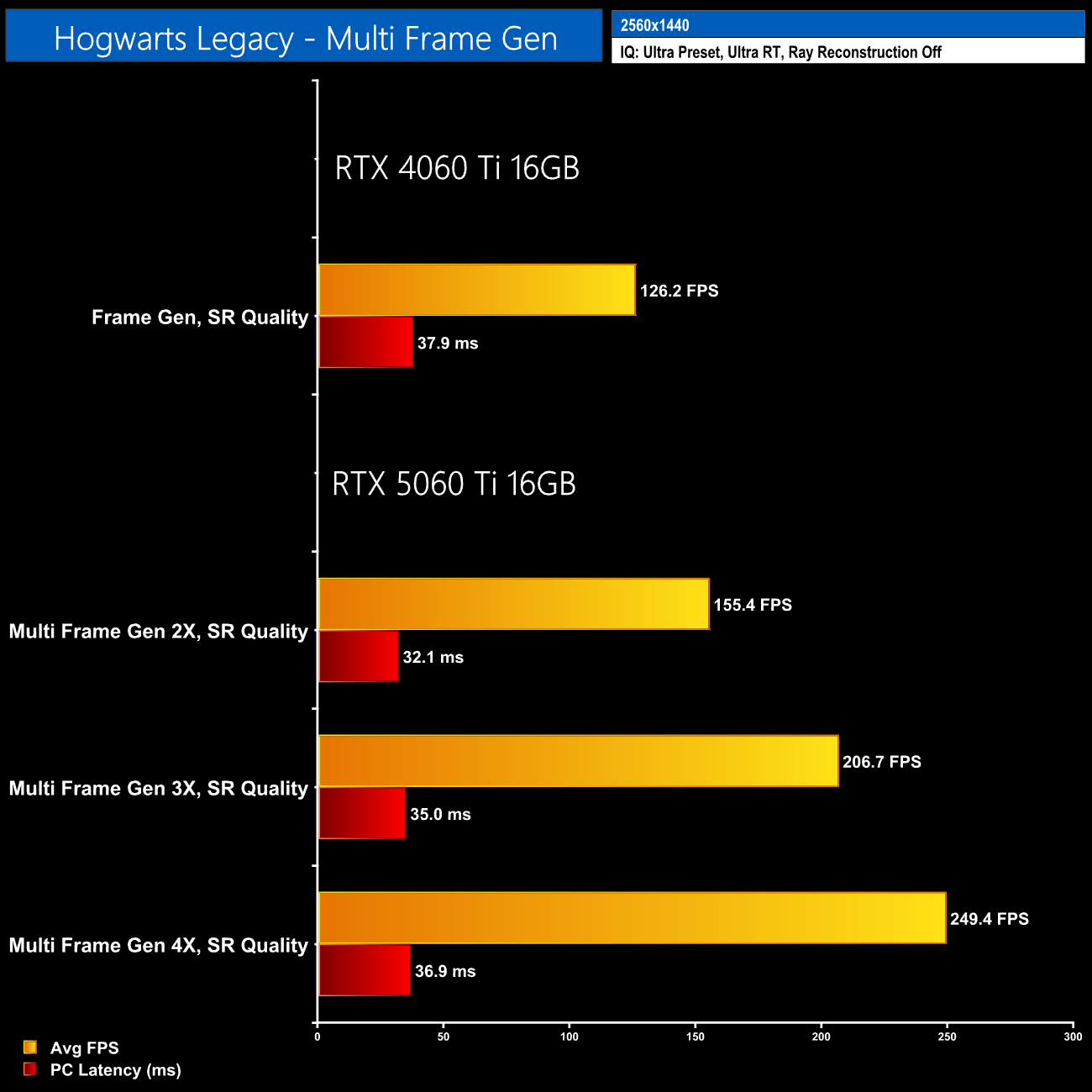 Of course, some games are much easier to run, such as Hogwarts Legacy, where even with everything maxed out at 1440p, you'll get a good experience on the 5060 Ti 16GB. Here we have a starting frame rate of 102fps before enabling MFG, so latency never really becomes a problem. That's something to keep in mind with MFG – it is a technology I quite like and use often for my personal gaming sessions. But you have to be realistic with the starting frame rate, otherwise latency becomes a real issue, as does the visual quality.