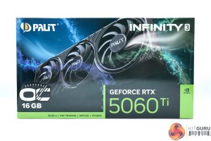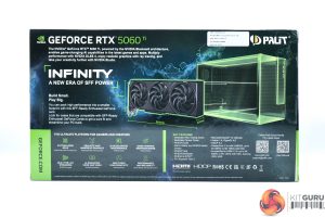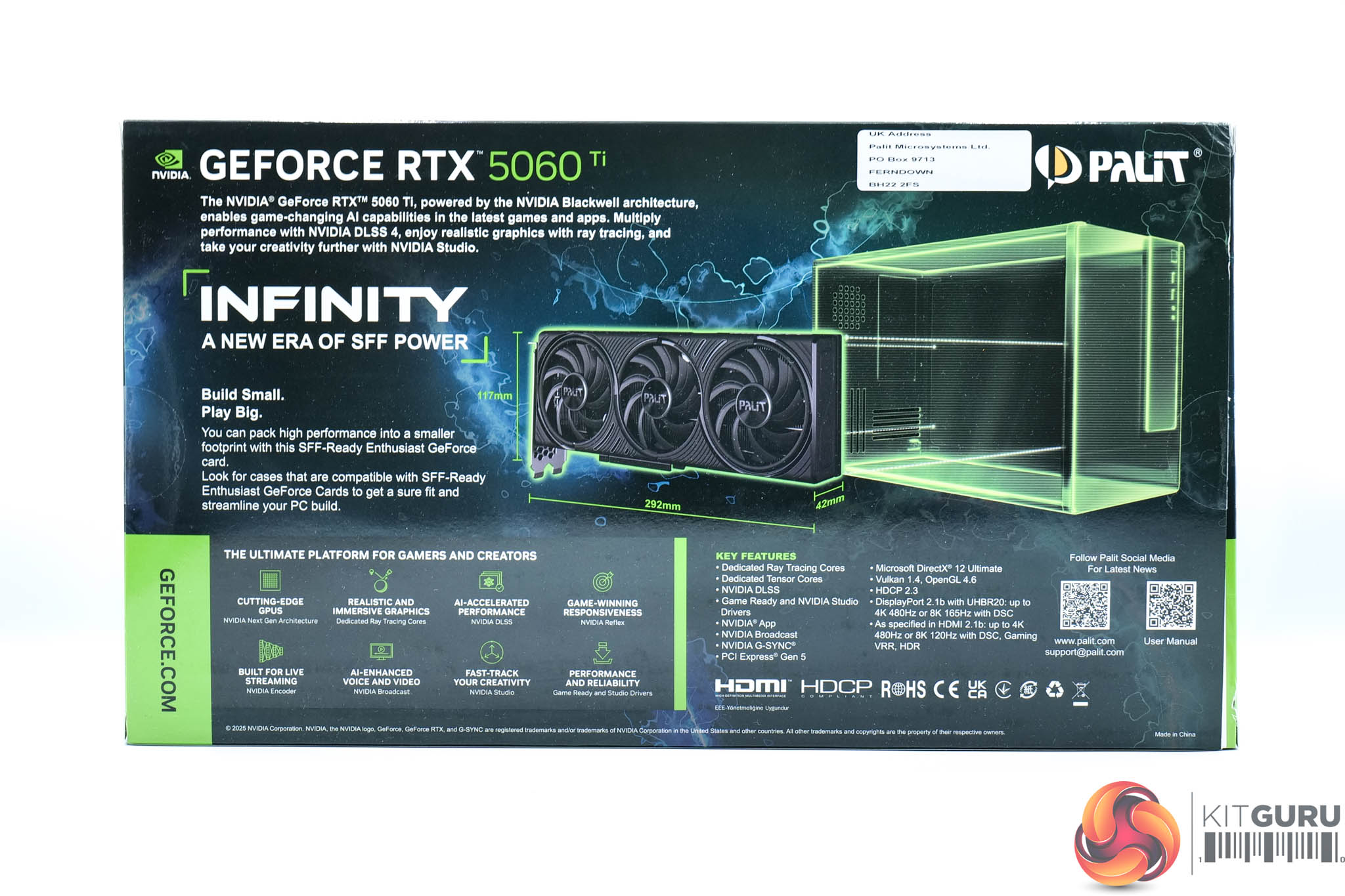 Palit's RTX 5060 Ti Infinity 3 ships in a dark box, with an image of the card taking up most of the front. Palit highlights a few key specs and features on the back of the card, as well as the fact that the Infinity 3 is a certified ‘SFF-Ready Enthusiast GeForce' card, something Nvidia introduced last year.