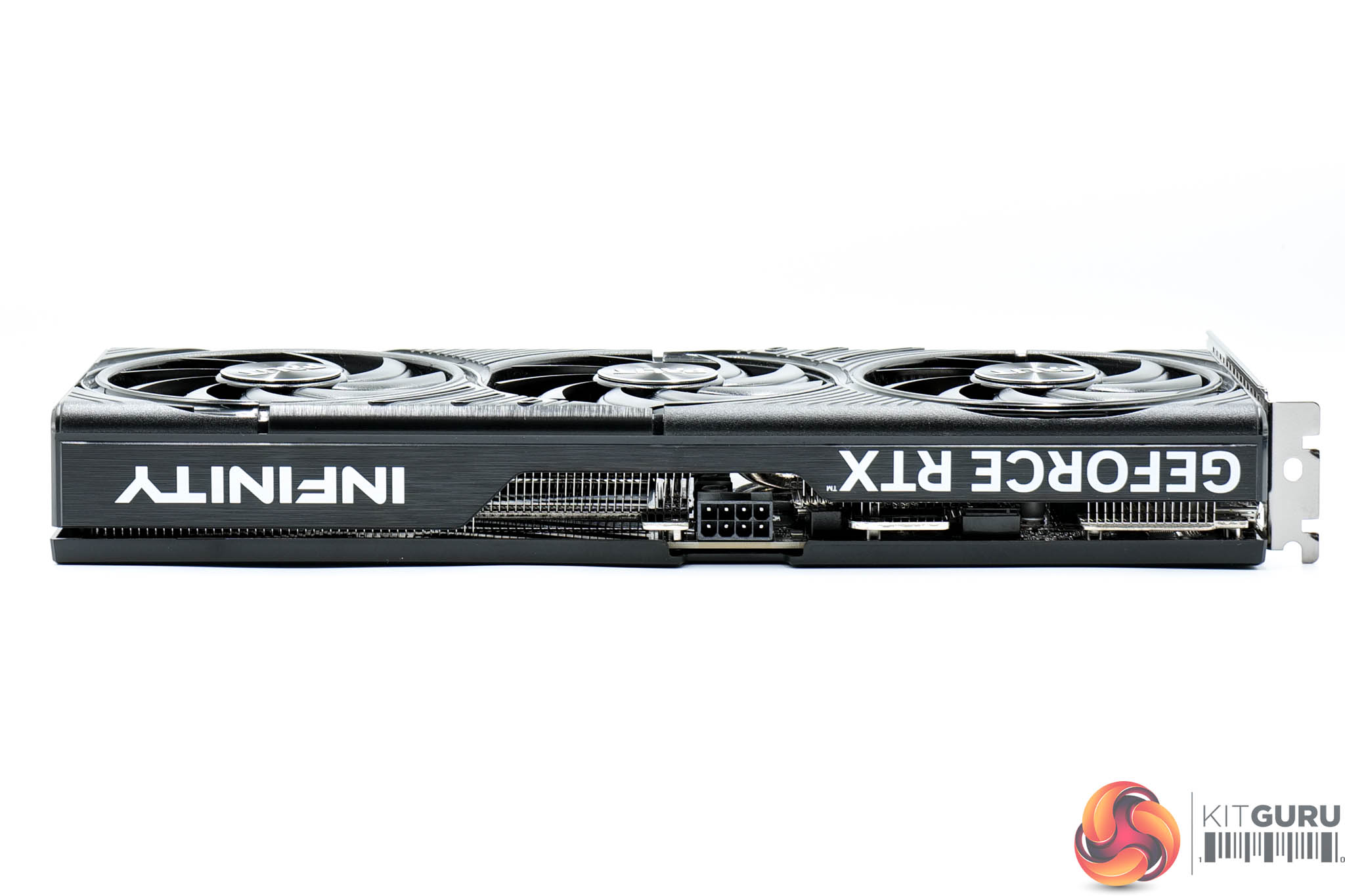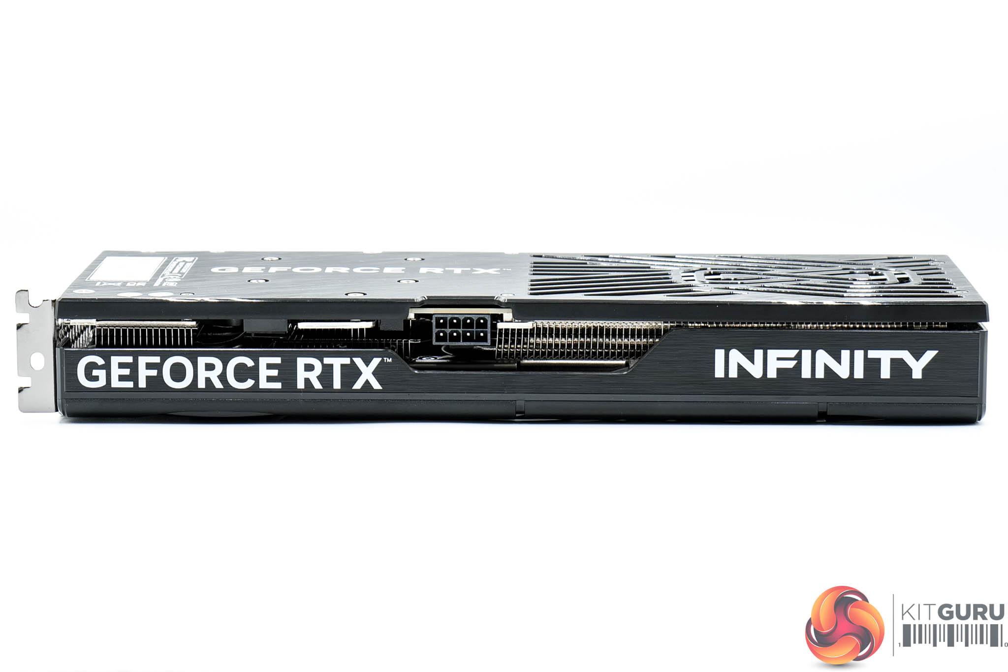 The front side of the card is home to the GeForce RTX and Infinity logos, both of which are printed in white. There's no RGB lighting anywhere on the card.