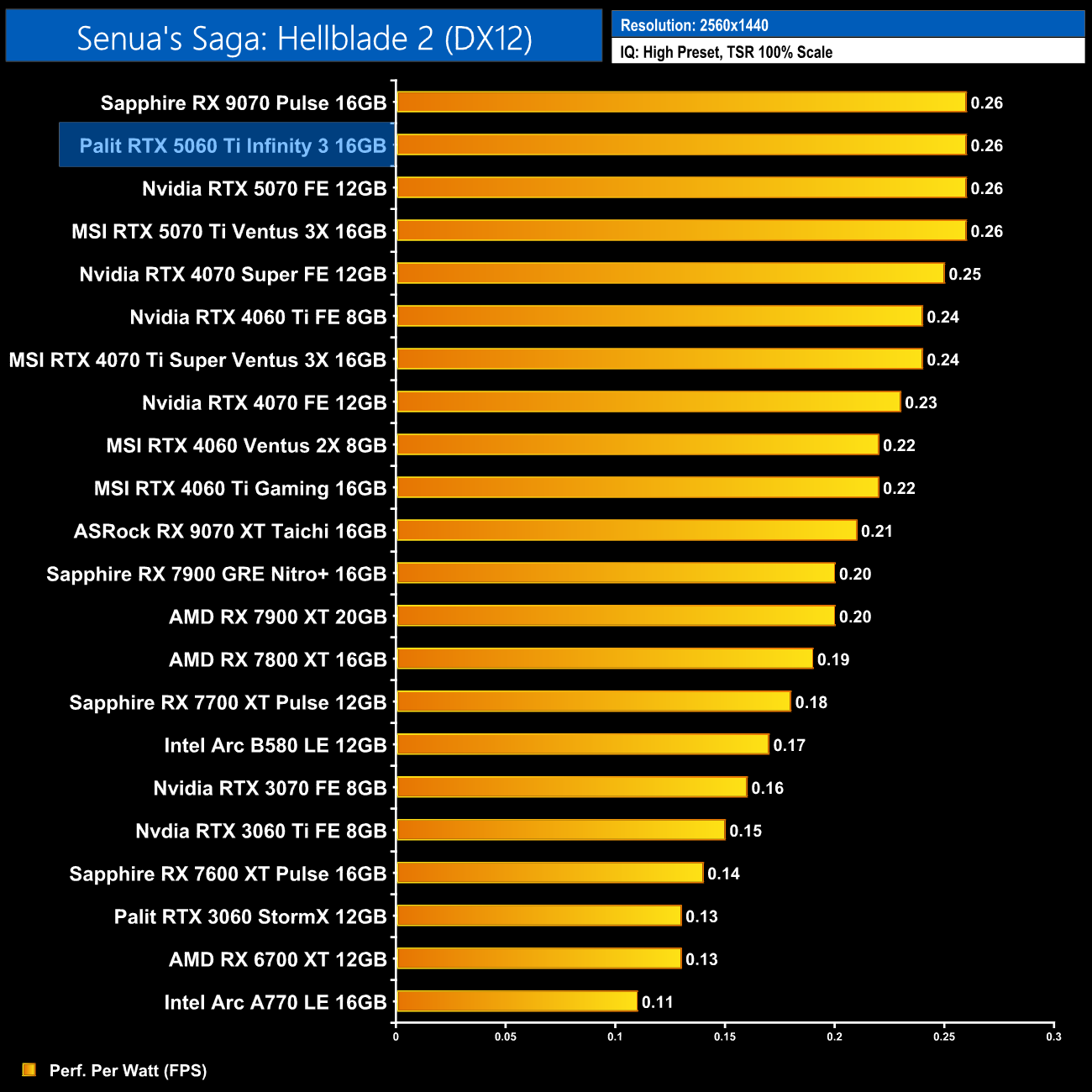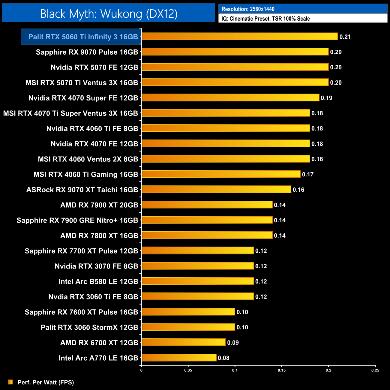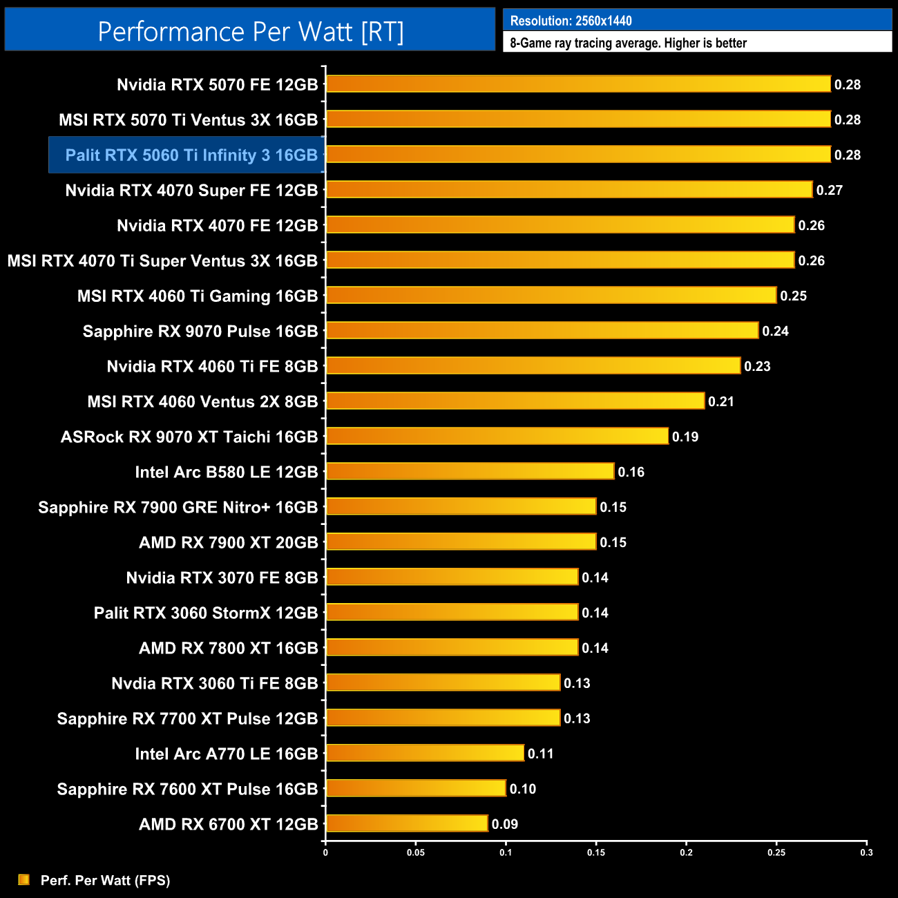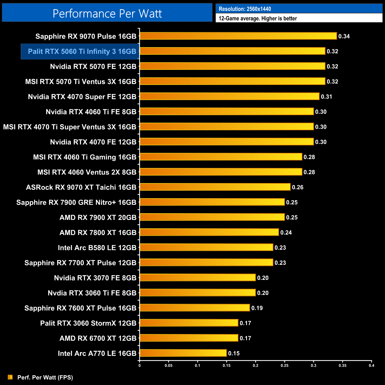 At 1440p the RX 9070 comes on a bit stronger and claims the top spot, but the 5060 Ti 16GB is only just behind. It also delivers a 14% gain in performance per Watt over the 4060 Ti 16GB.
