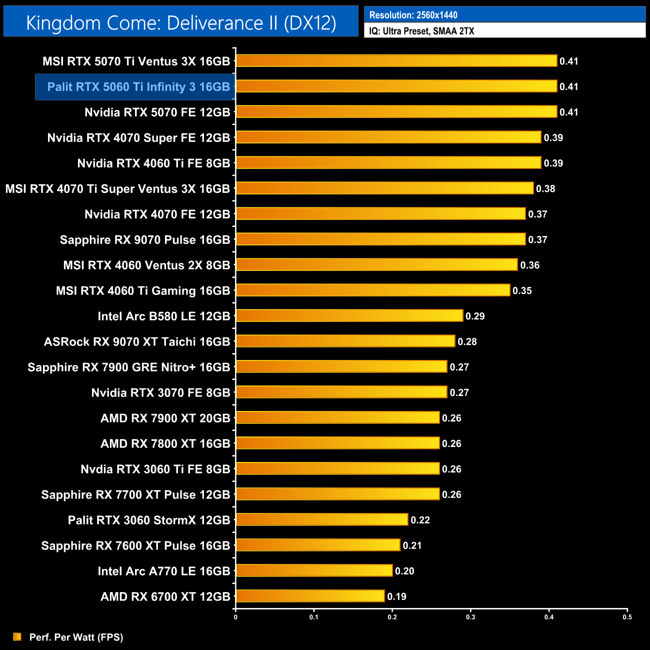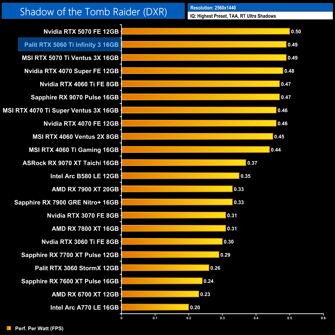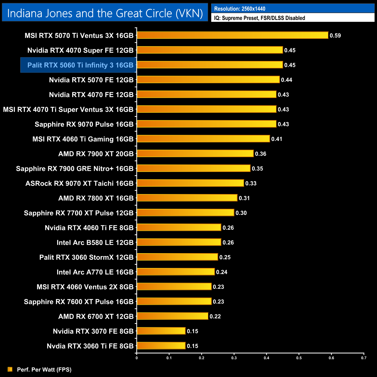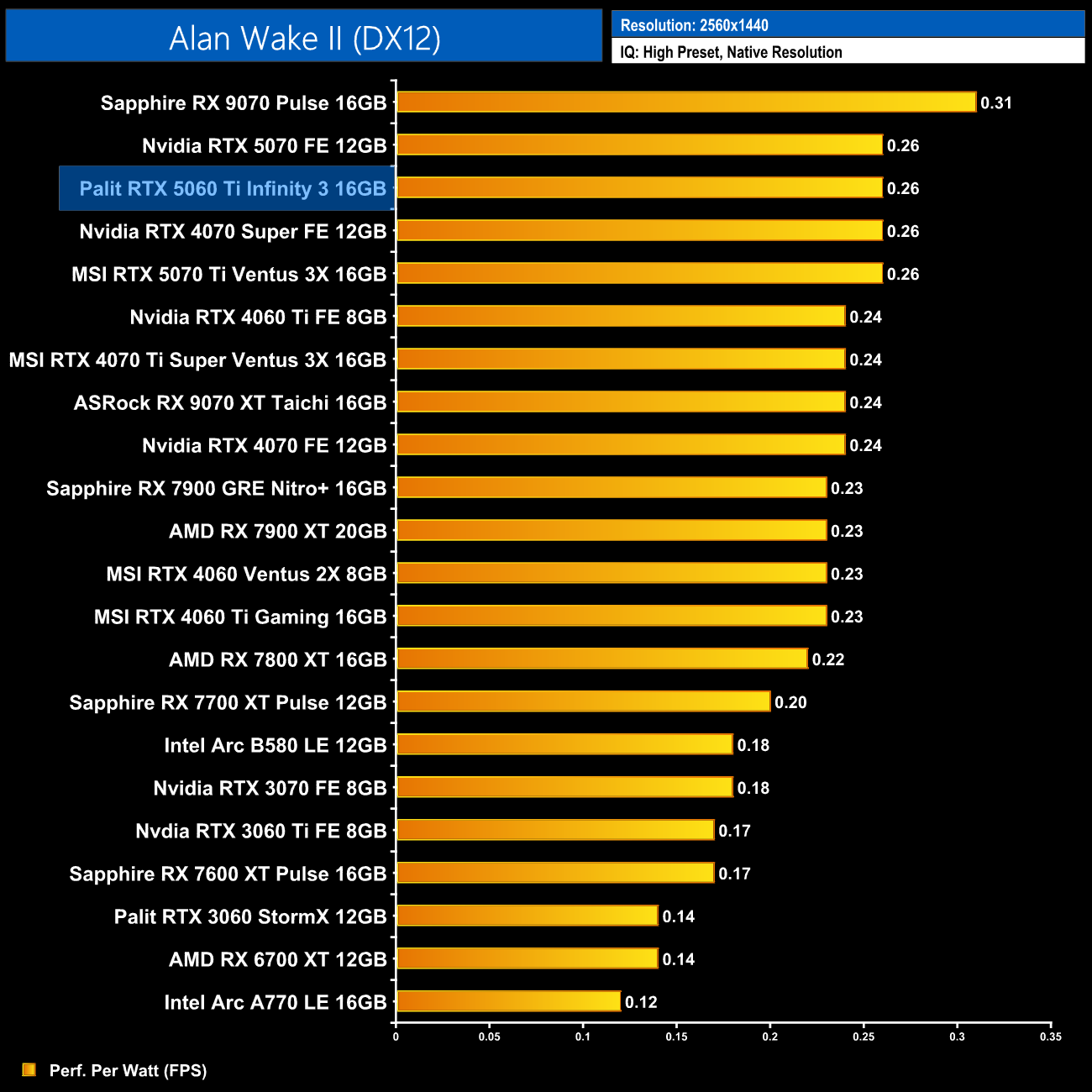 At 1440p the RX 9070 comes on a bit stronger and claims the top spot, but the 5060 Ti 16GB is only just behind. It also delivers a 14% gain in performance per Watt over the 4060 Ti 16GB.