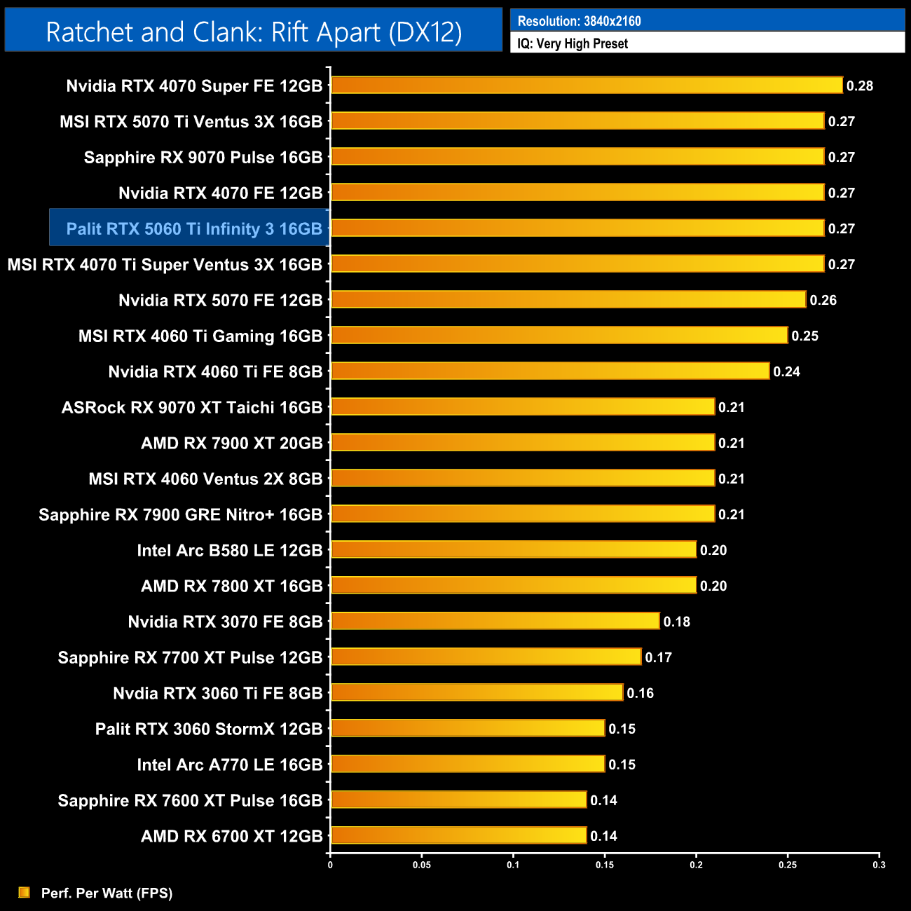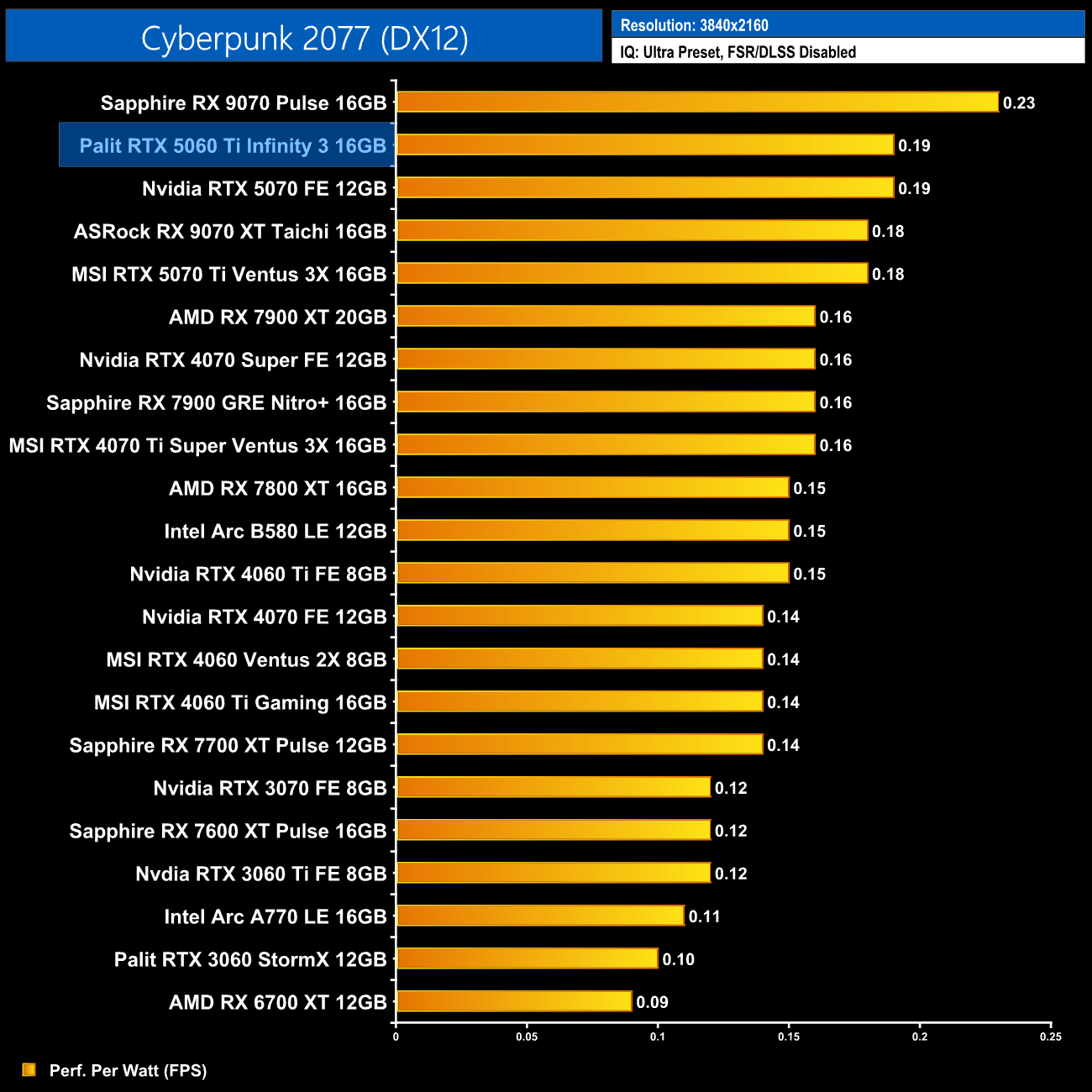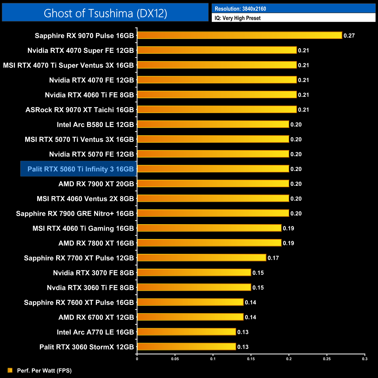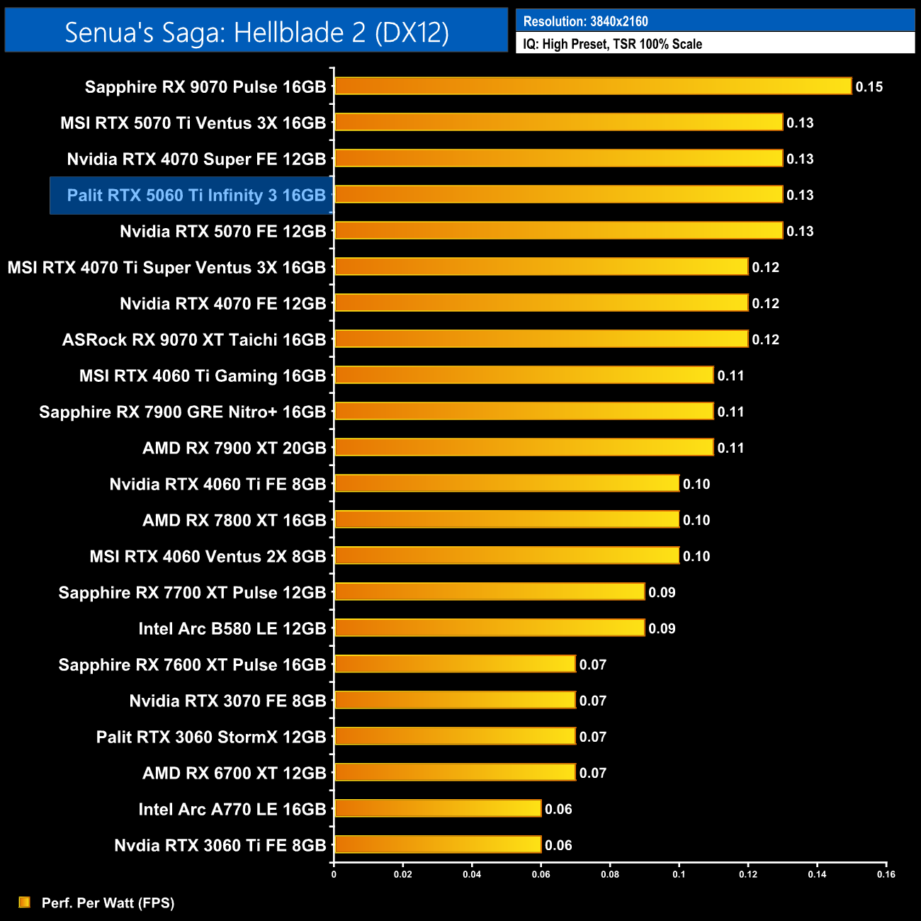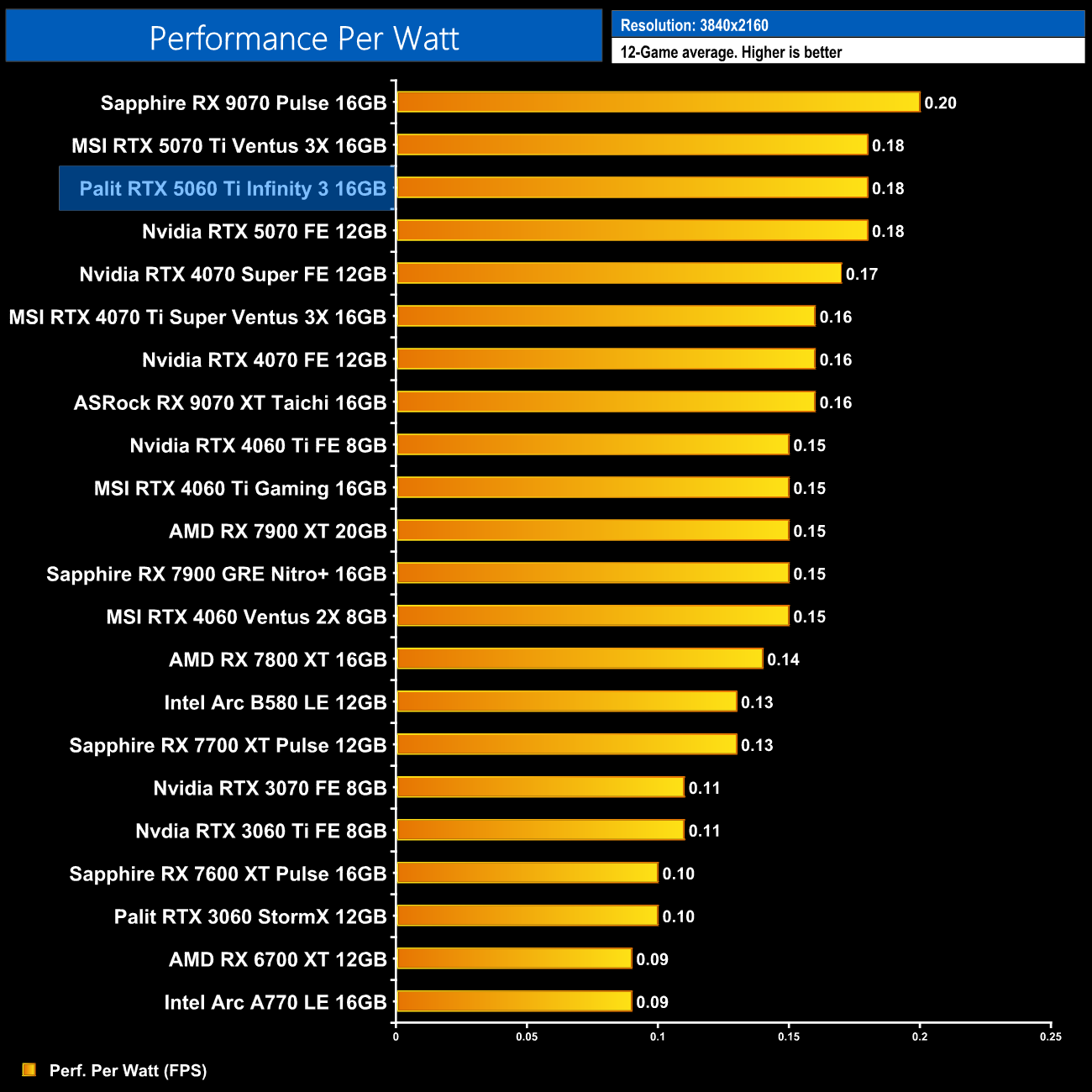 Using the graphics card-only power draw figures presented earlier in the review, here we present performance per Watt on a per-game basis for all twelve games we tested at 2160p (4K).