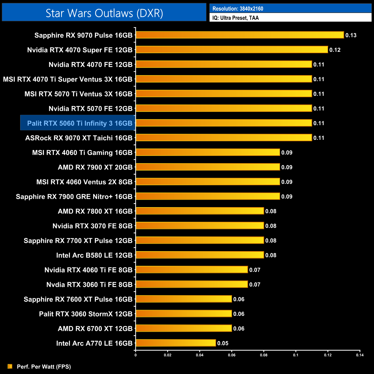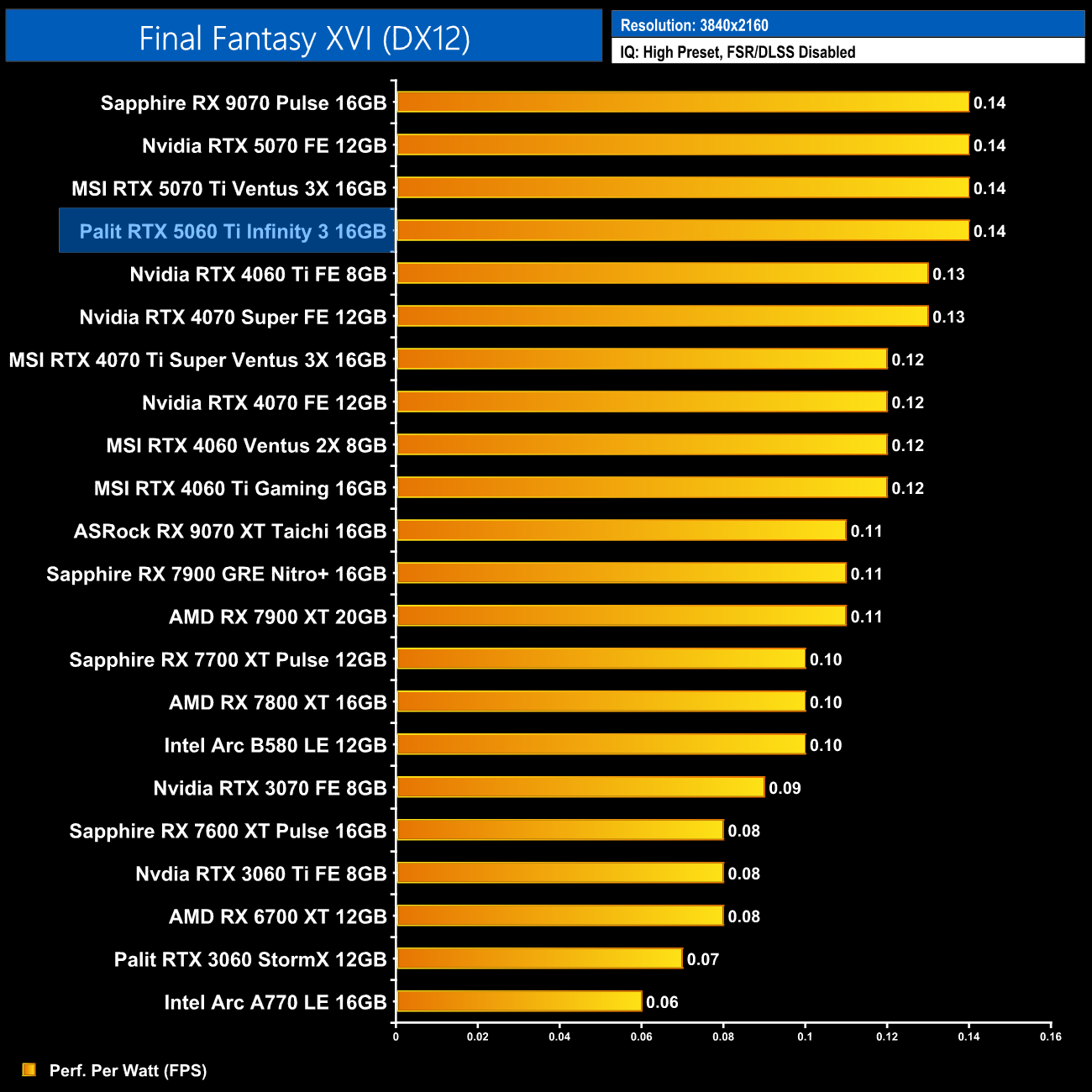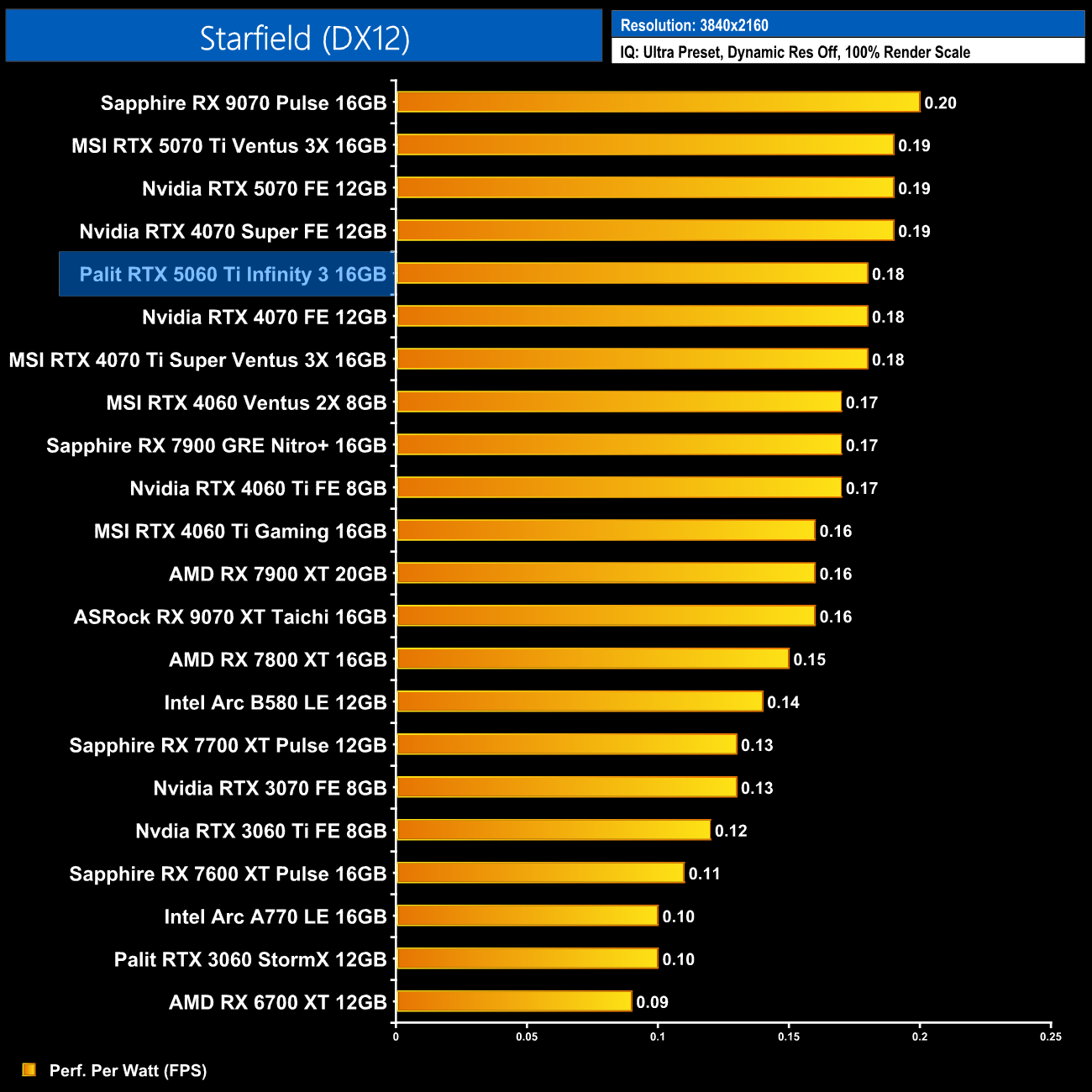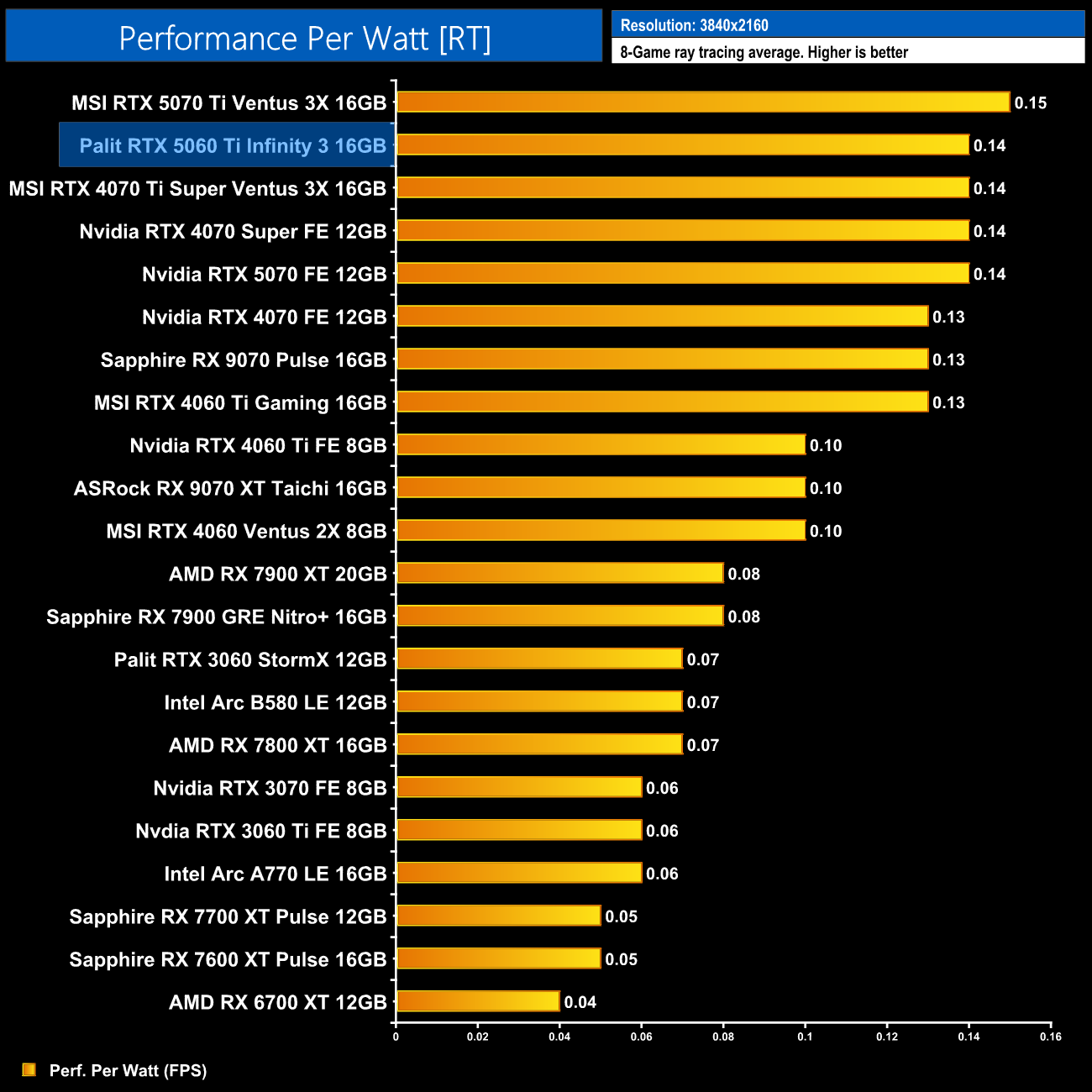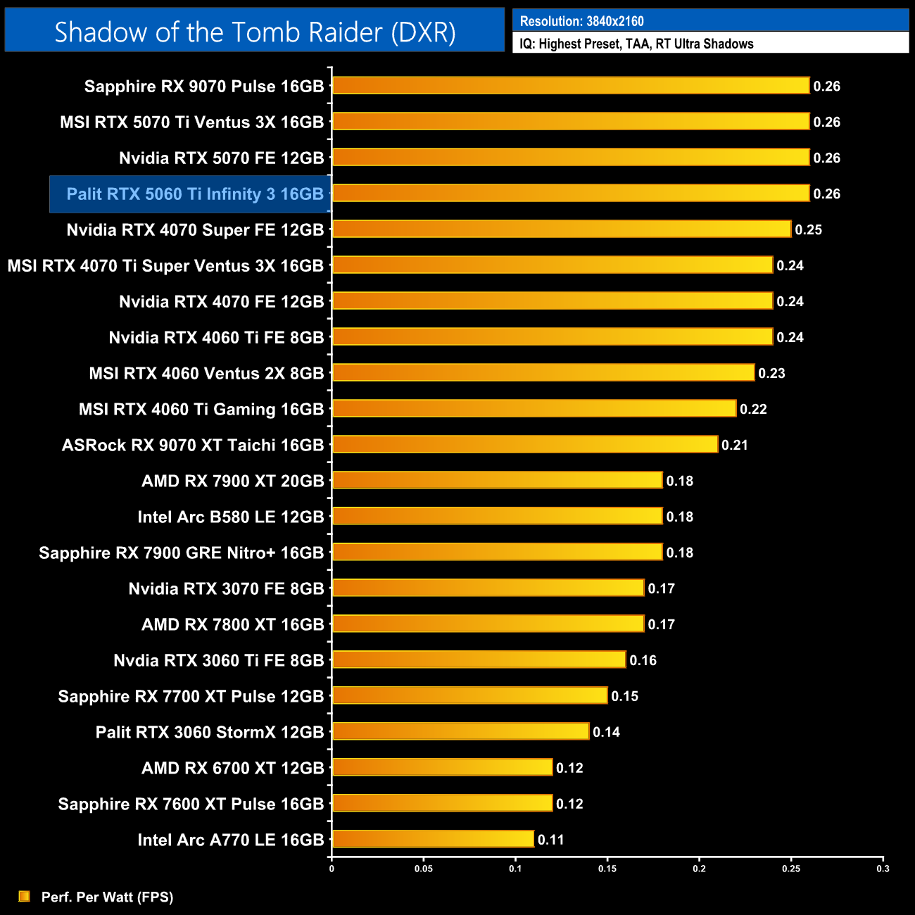Using the graphics card-only power draw figures presented earlier in the review, here we present performance per Watt on a per-game basis for all twelve games we tested at 2160p (4K).