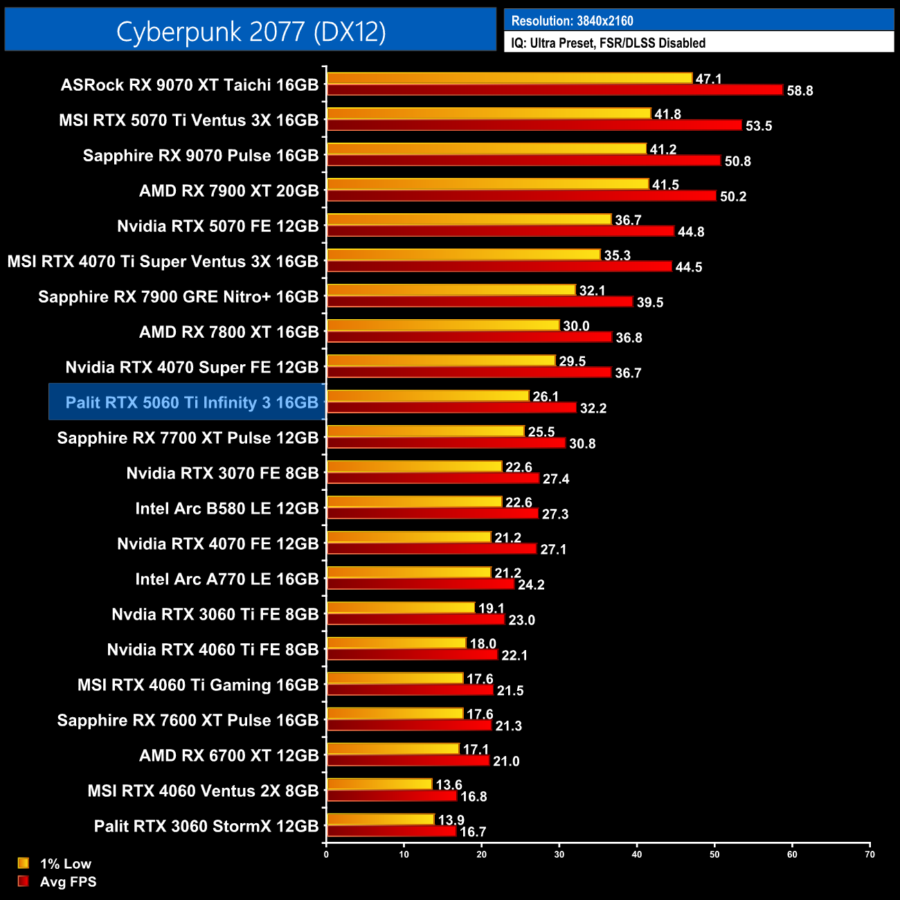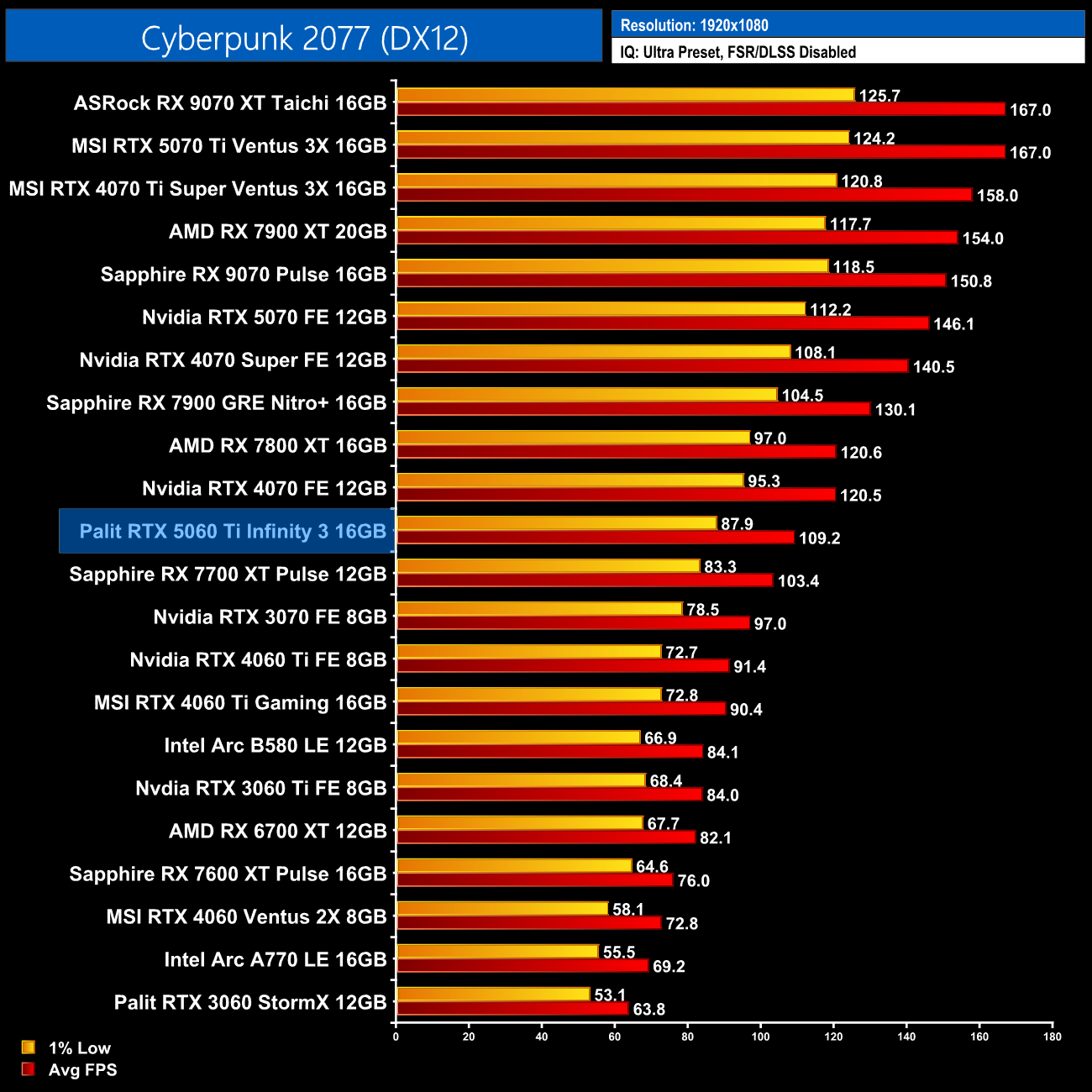As for Cyberpunk, we're looking at just under 110fps on average, putting the 5060 Ti 16GB just 6% ahead of the RX 7700 XT, while it's 21% faster than its direct predecessor.