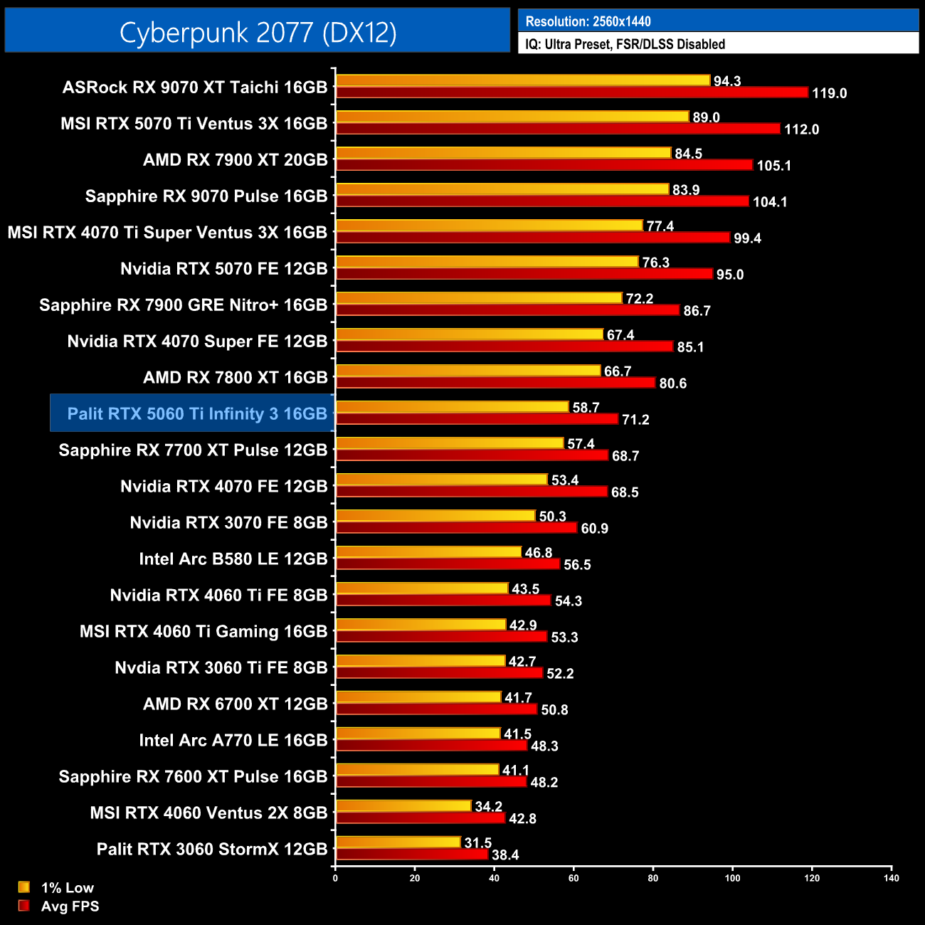 Up at 1440p, it extends its lead over the 4060 Ti 16GB to 34%, and we know from prior reviews that the REDengine seems to scale particularly well with the Blackwell architecture. Versus the 7700 XT though, it's just 4% faster.