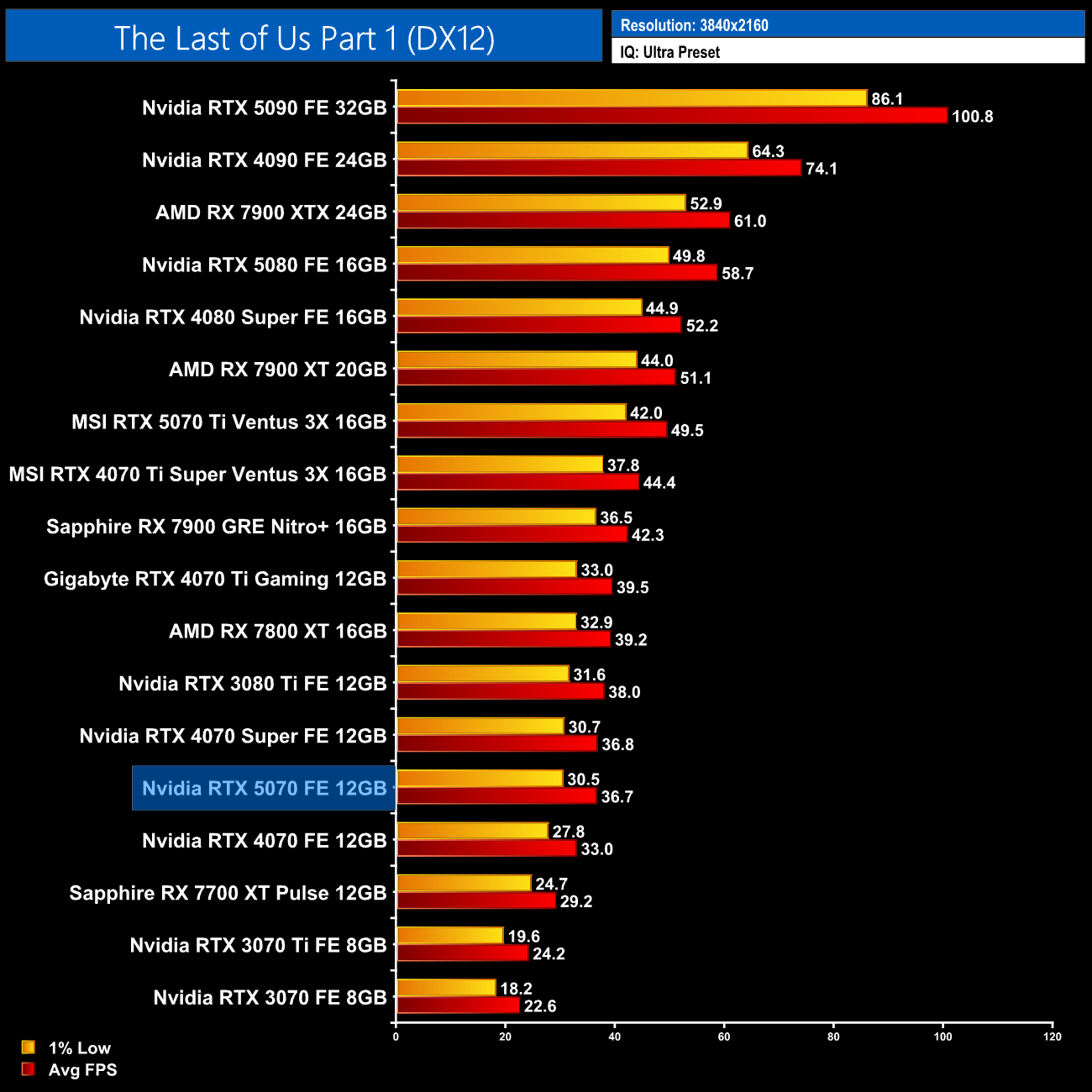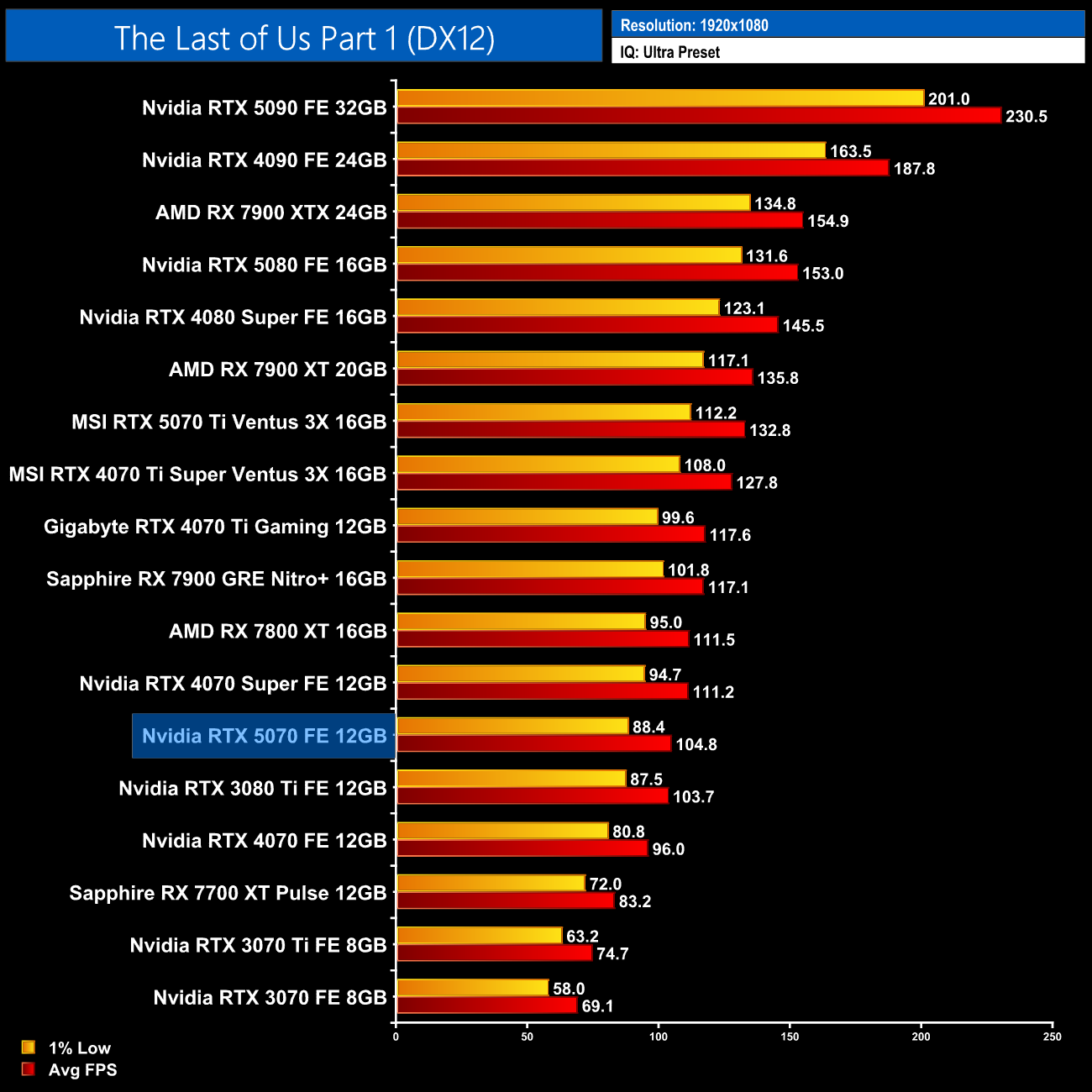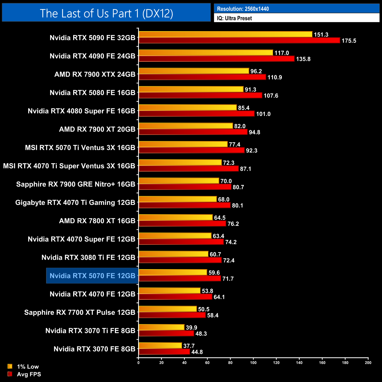 Moving onto TLOUP1, this is another title where the RTX 5070 falls just short of the RTX 4070 Super, coming in 3% slower at 1440p.