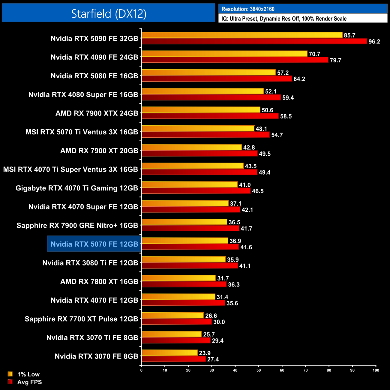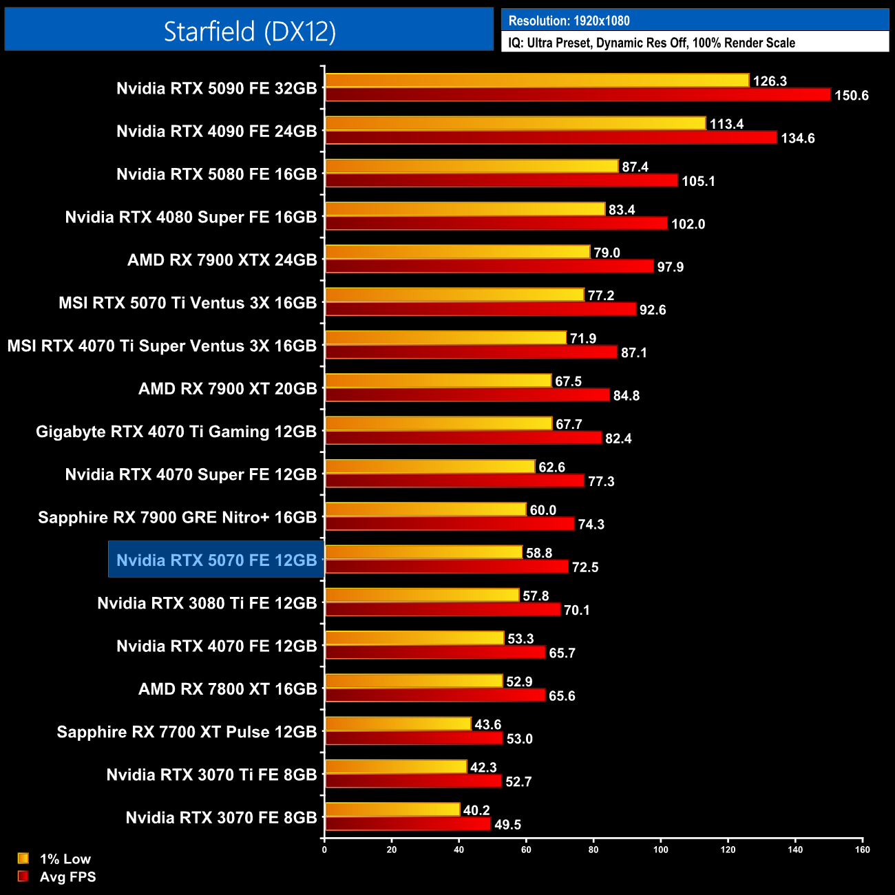 As for Starfield, at 1440p the RTX 5070 loses out to the 4070 Super by a 5% margin, while it's on par with the 7900 GRE.