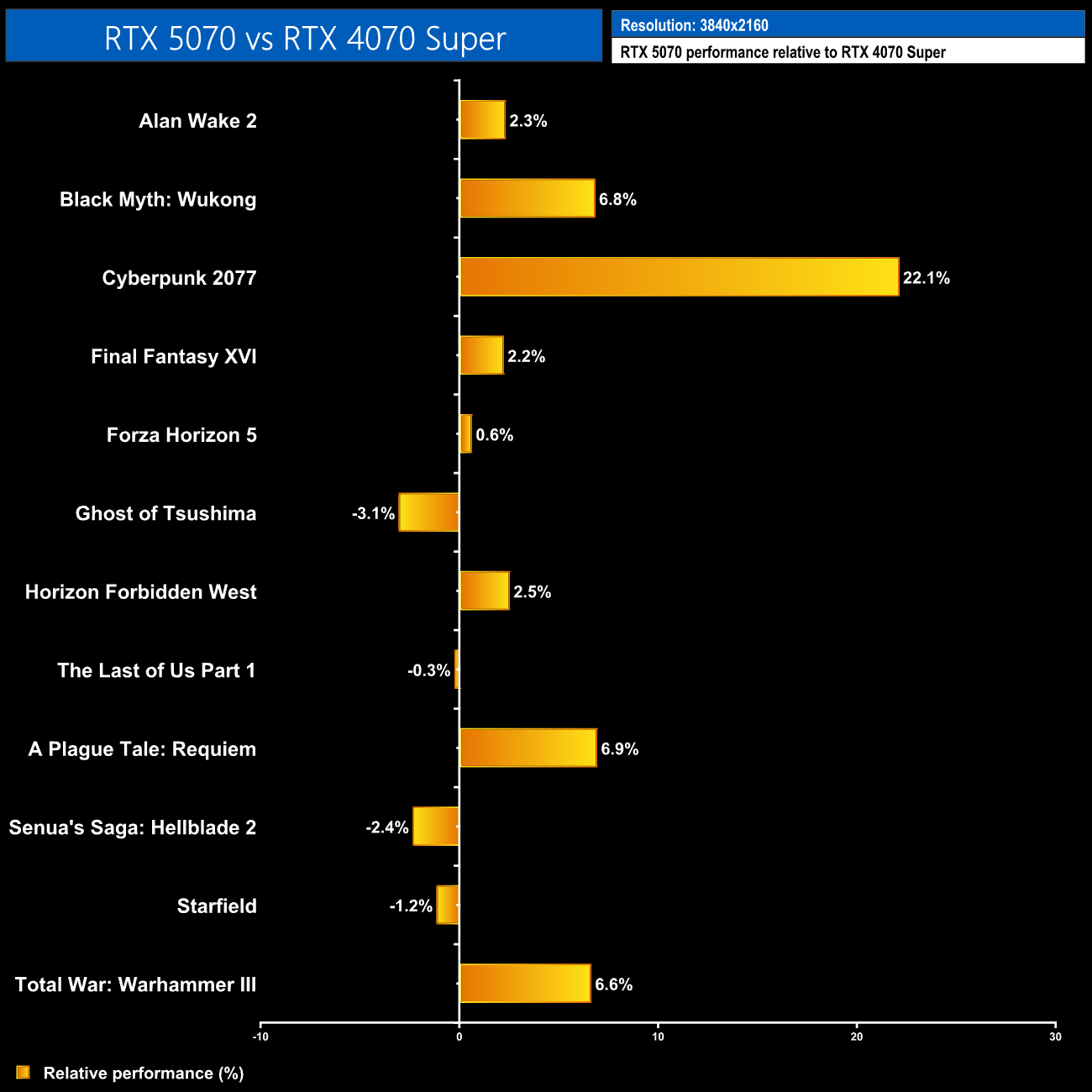 At 4K, we can see a similar story, with just a 3% gain over the 4070 Super, which works out as a 21% uplift versus the vanilla 4070. It's now 21% slower than the 5070 Ti, with a 60% gain over the RTX 3070.