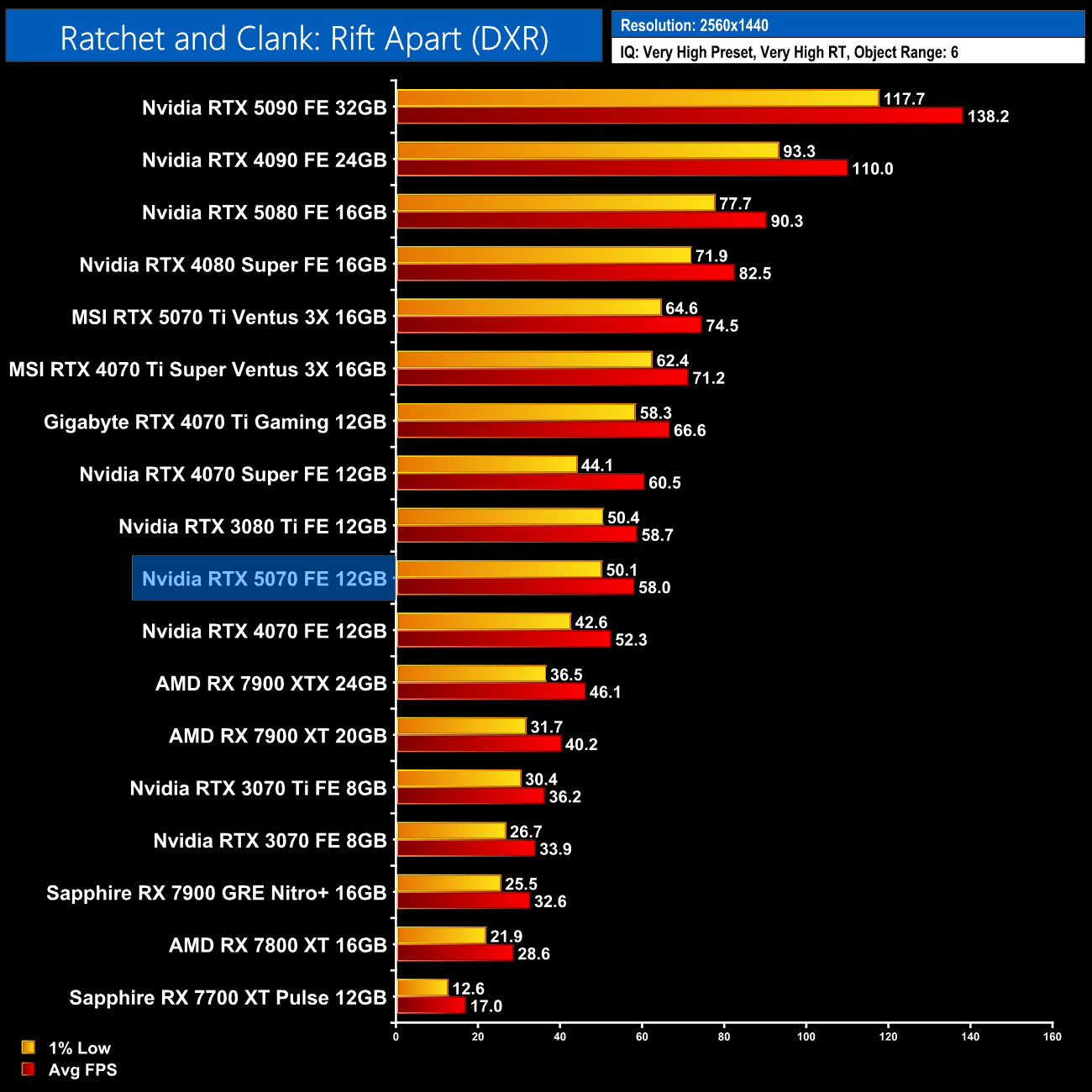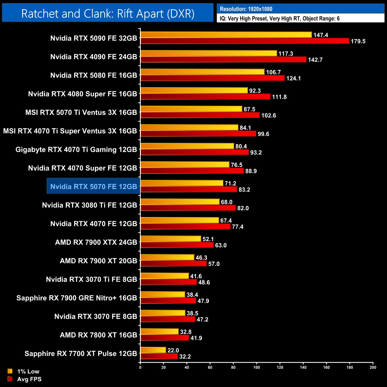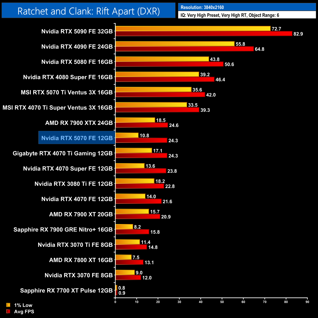 Ratchet and Clank is more of the same, the 4070 Super is nominally faster in terms of its averages but the 5070 does have better 1% lows. The 5070 also comes in 26% faster than the 7900 XTX, illustrating the clear gulf in ray tracing performance between AMD and Nvidia.