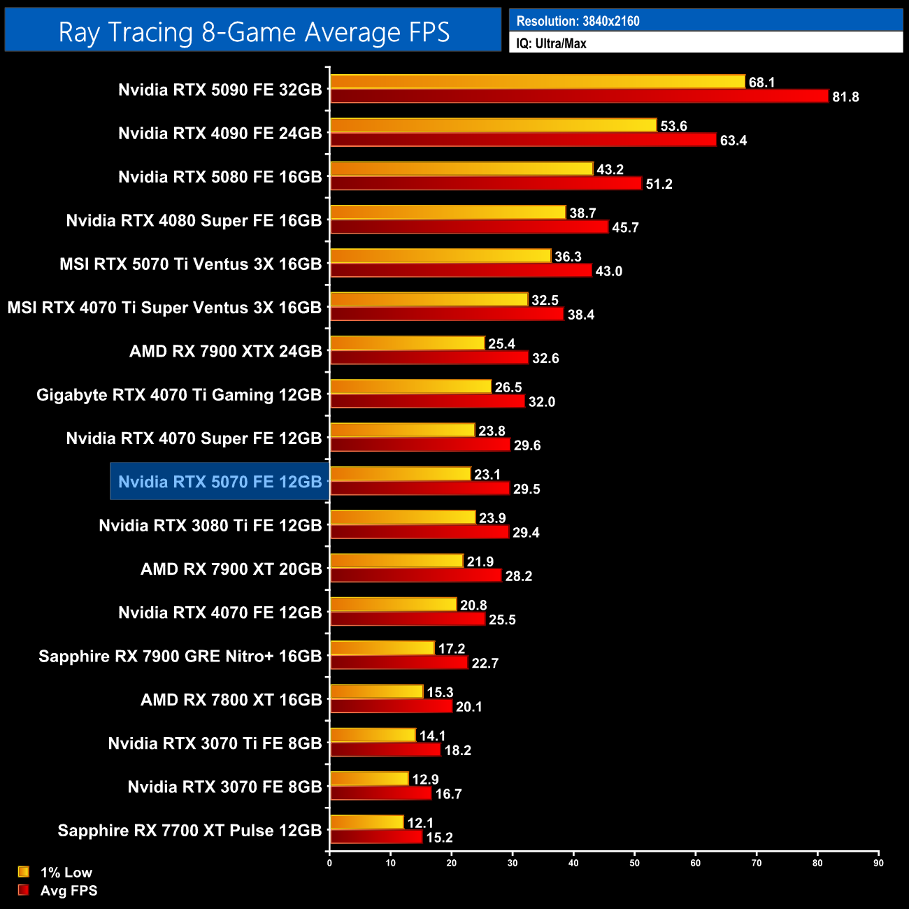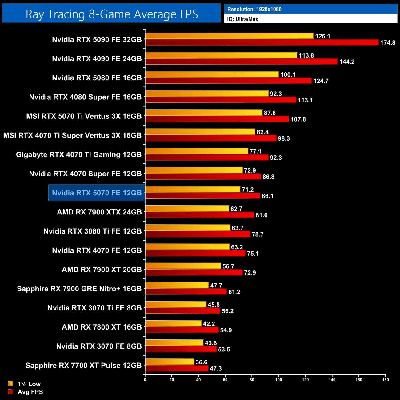 Over the eight RT games tested, performance is a wash between the 5070 and 4070 Super at 1440p. That also means the new Blackwell GPU is just as fast as AMD's RX 7900 XTX for ray tracing, while it offers a 72% uplift over the RTX 3070.