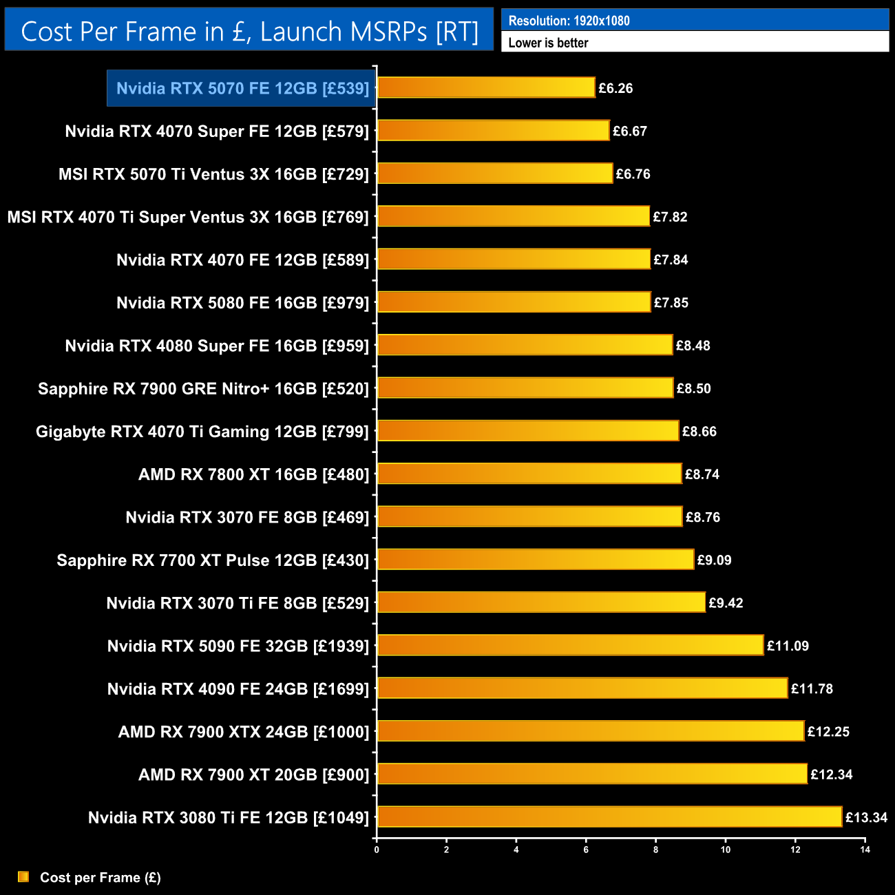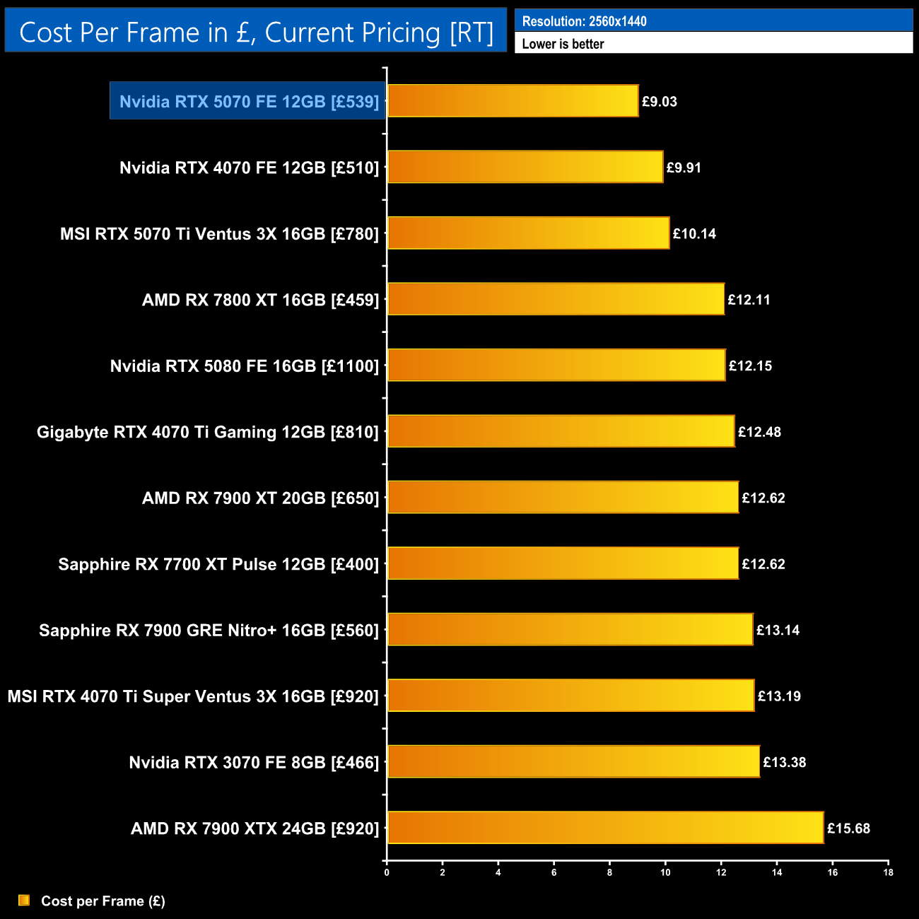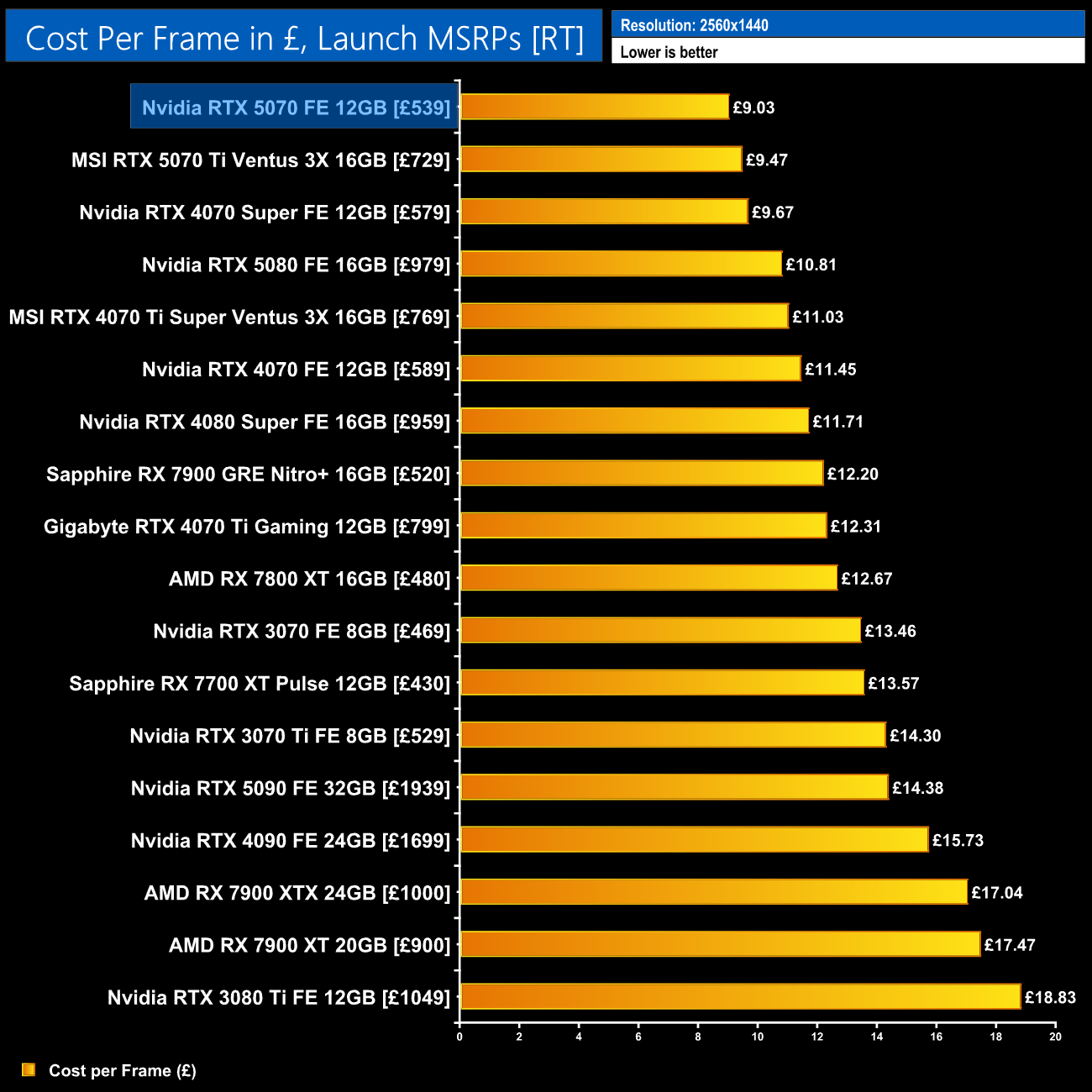 That's enough for the RTX 5070 to take top spot in our cost per frame chart at 1440p, though it offers just 7% better value than the 4070 Super when looking at the MSRP data.