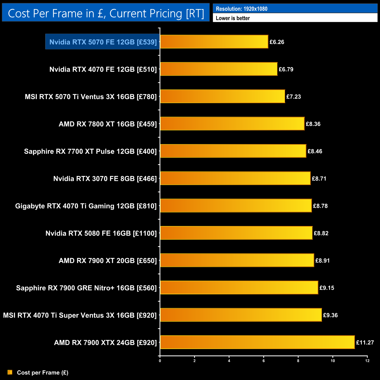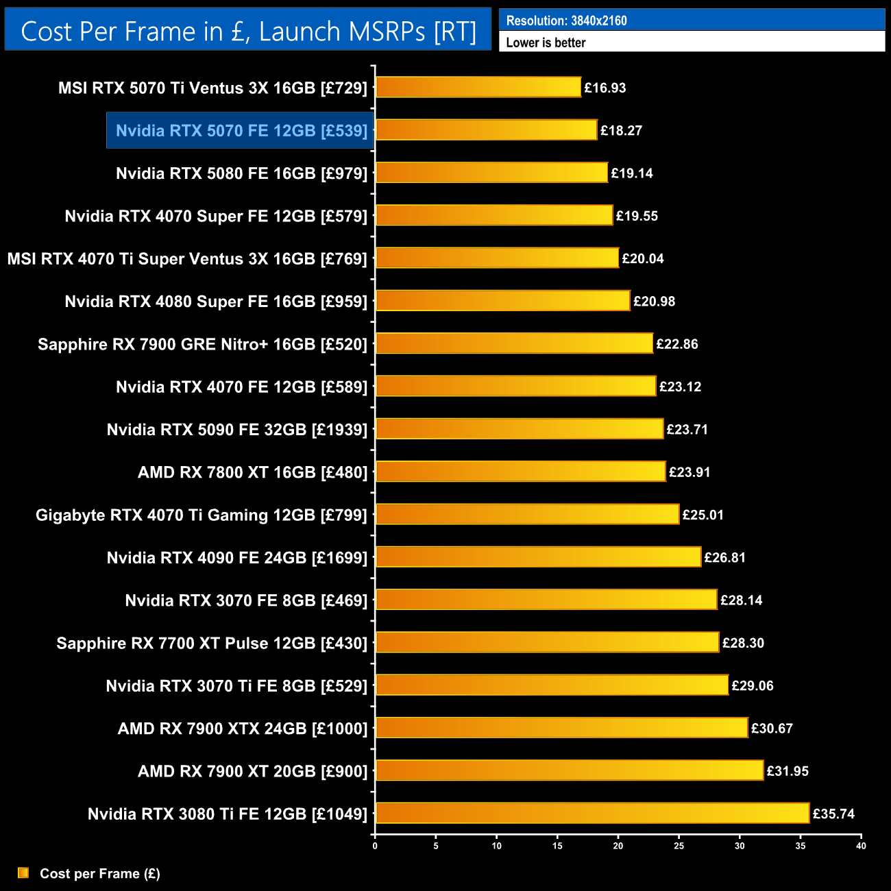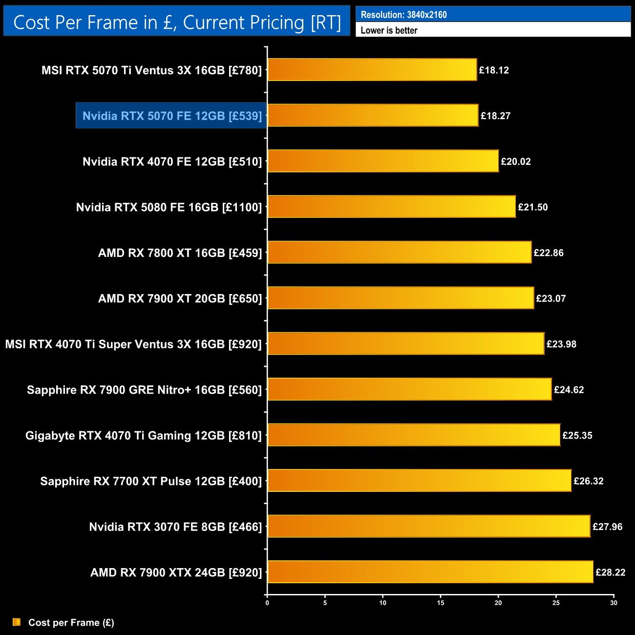 Given so many 40 series GPUs are now out of stock, the next best thing based on current retail pricing is the original RTX 4070, which we found for £510. As a reminder this data does assume the RTX 5070 will be available at MSRP, something we remain skeptical of…