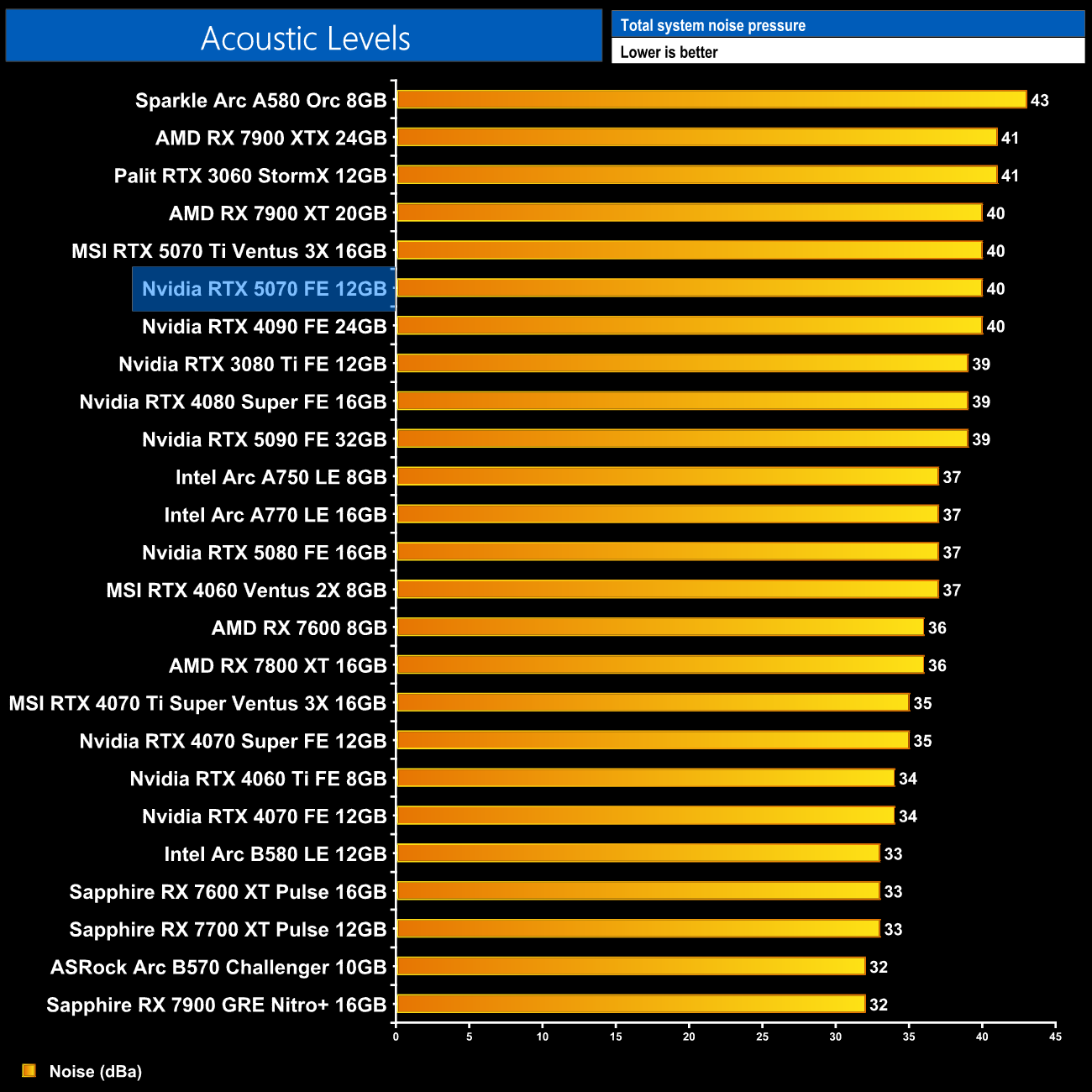 Unfortunately, the RTX 5070 Founders Edition isn't the quietest card going. In my testing, the fans spun up to 47%, or just under 2400rpm, producing 40dBa of noise. That makes it louder than even the RTX 5090 FE – clearly, decision to shrink the card and replace the vapour chamber results in a much weaker cooler, even when dealing with just 250W, so noise levels are higher to compensate.