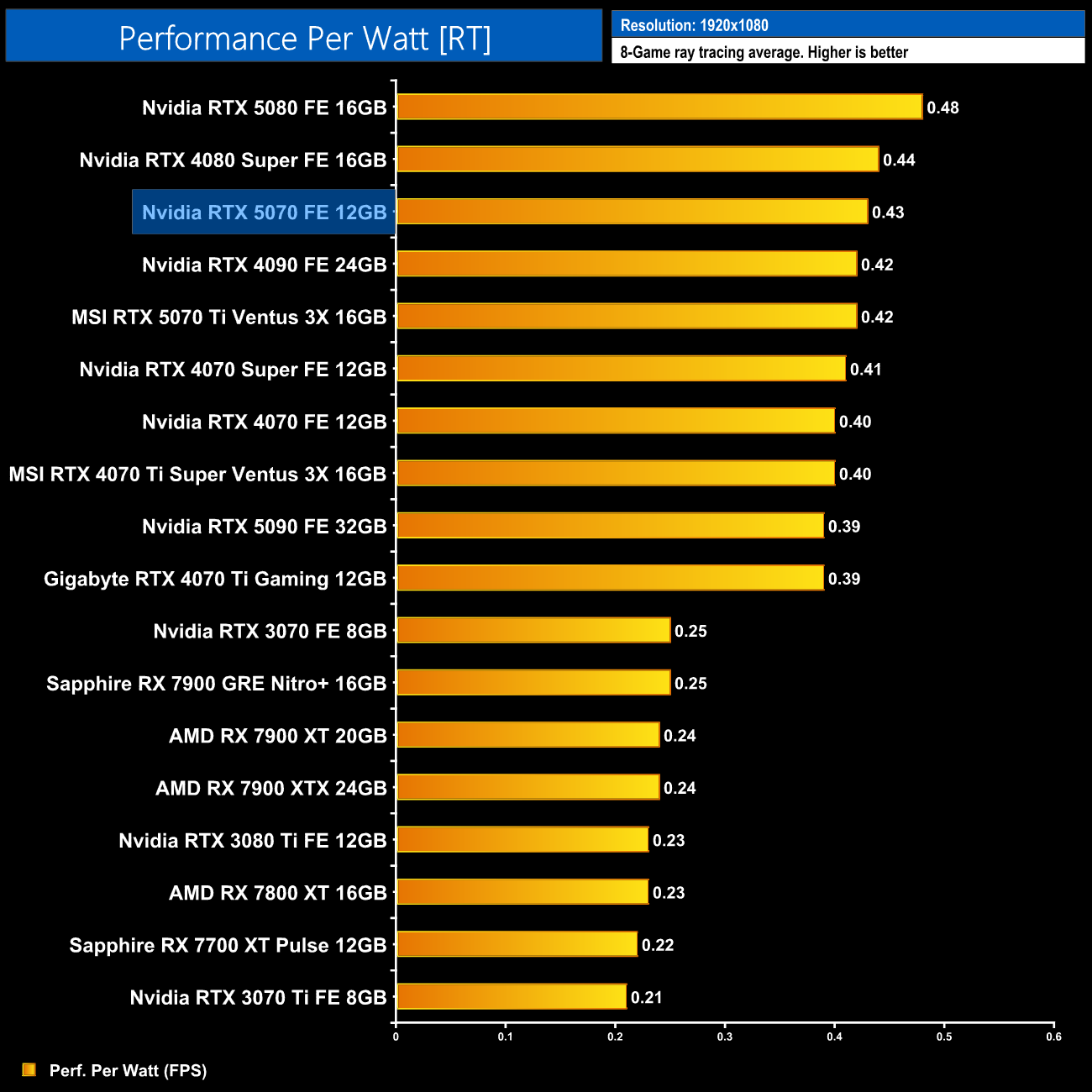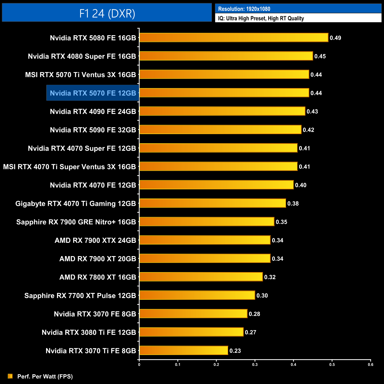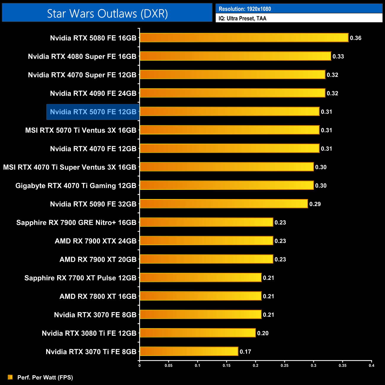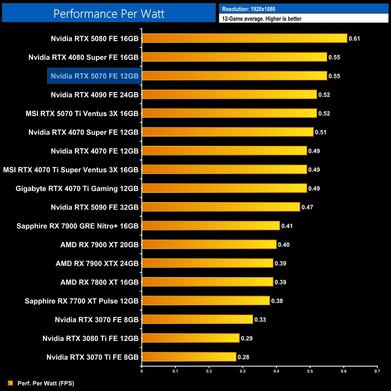 In terms of efficiency, at 1080p the RTX 5070 is tied second with the RTX 4080 Super, meaning it still lags behind the RTX 5080, while it's an 8% improvement over the 4070 Super.