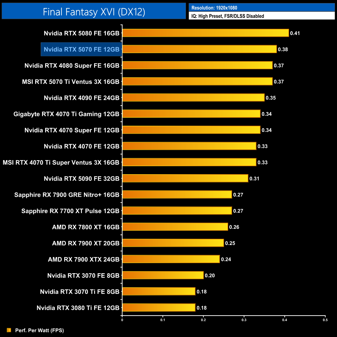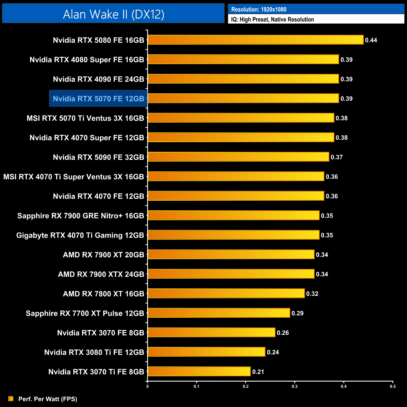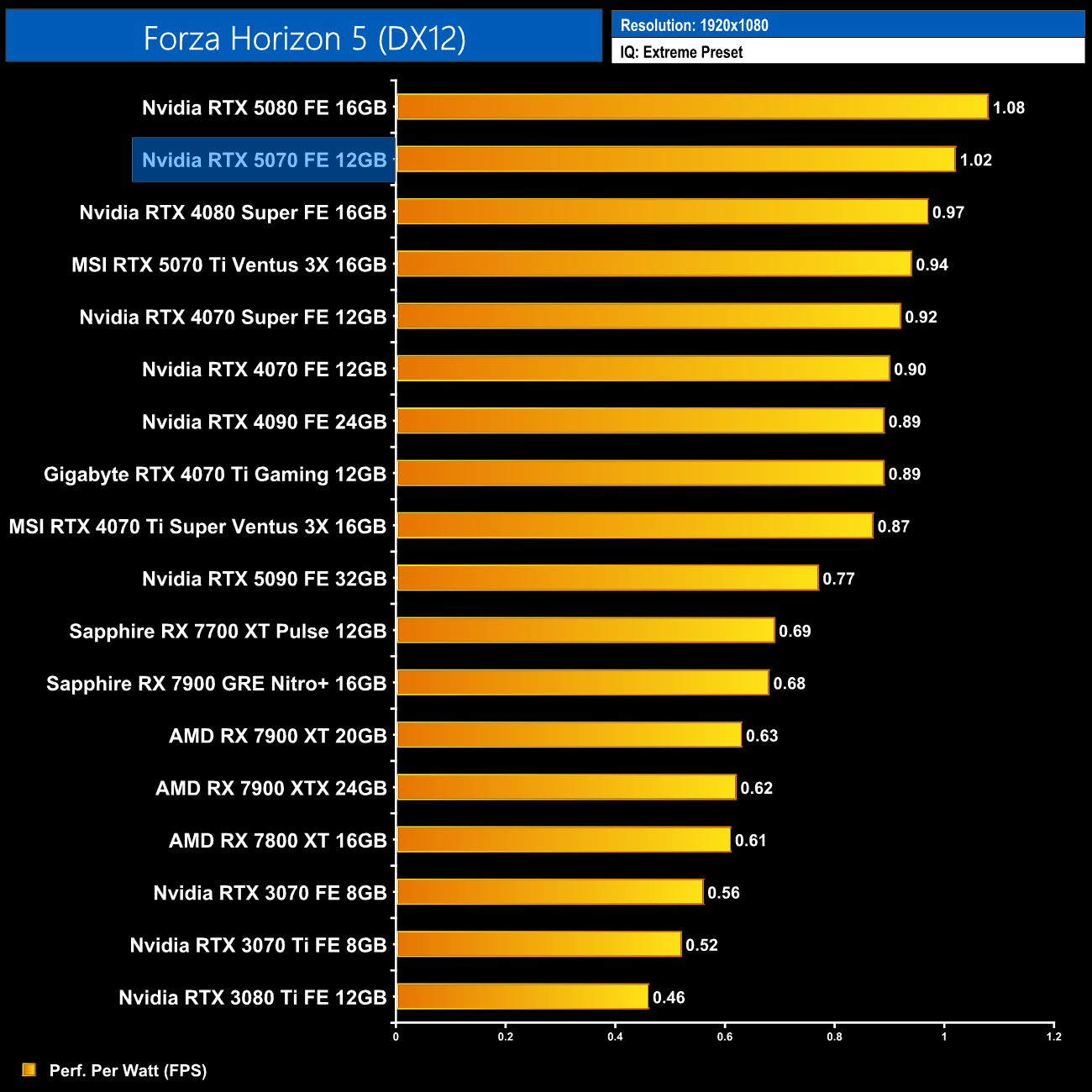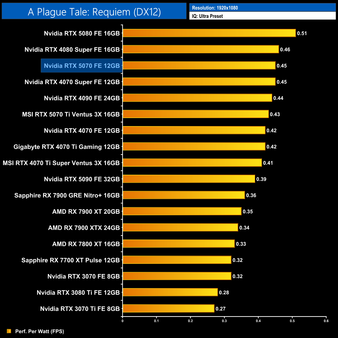 In terms of efficiency, at 1080p the RTX 5070 is tied second with the RTX 4080 Super, meaning it still lags behind the RTX 5080, while it's an 8% improvement over the 4070 Super.