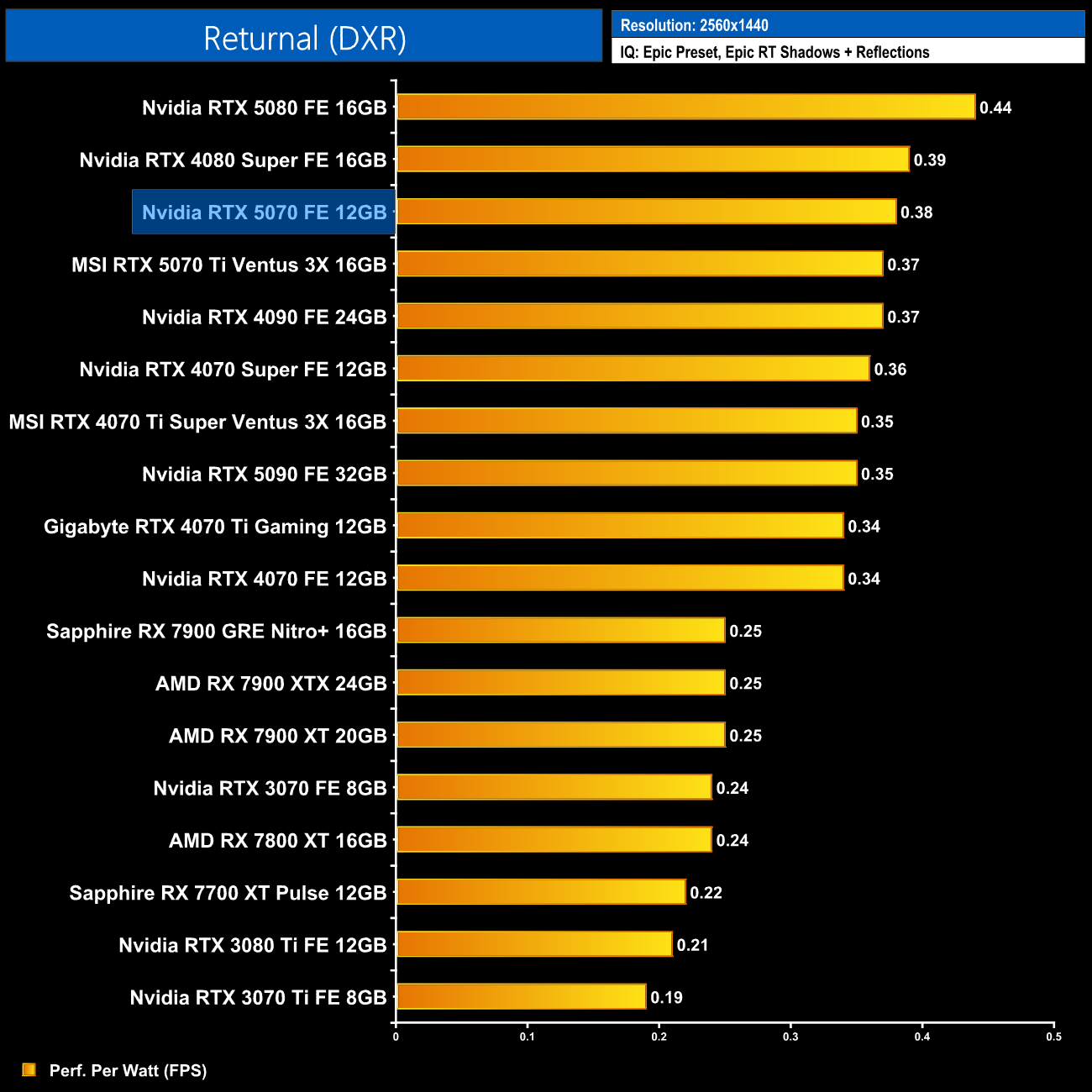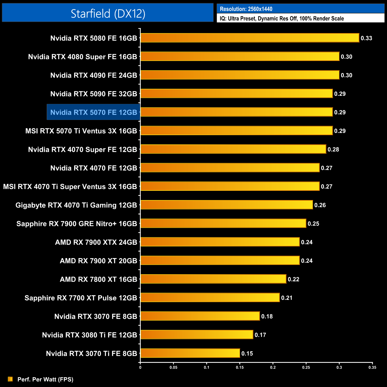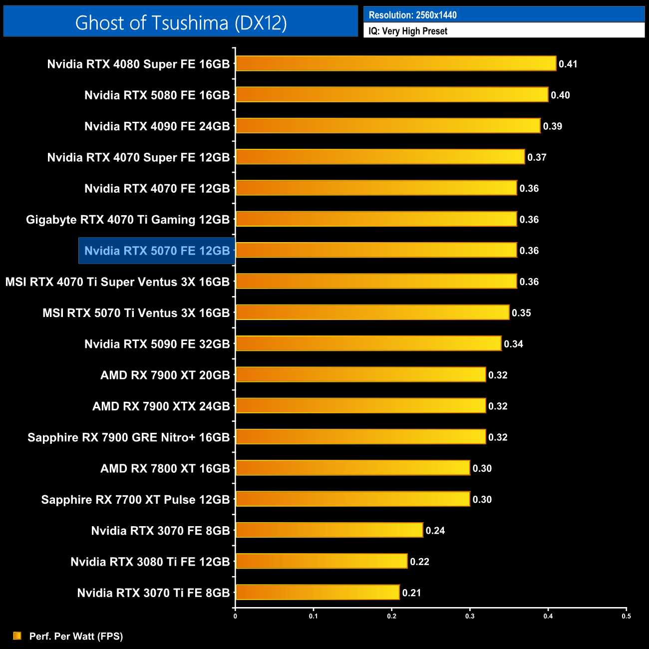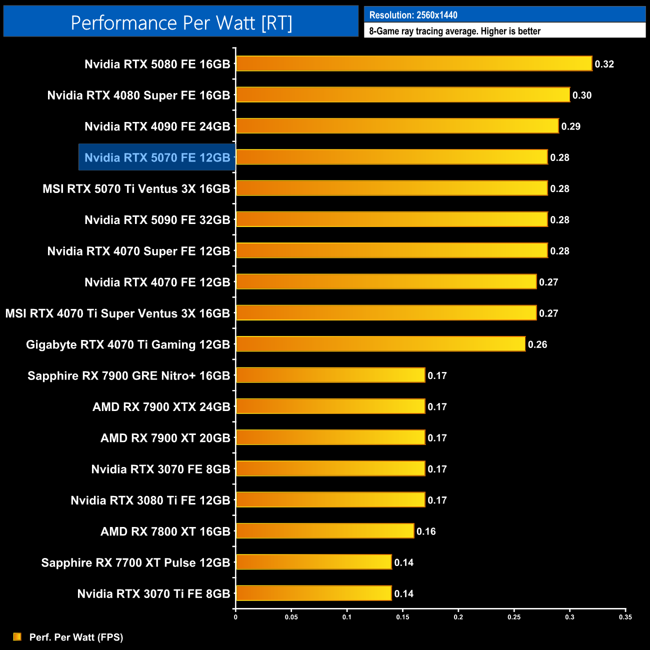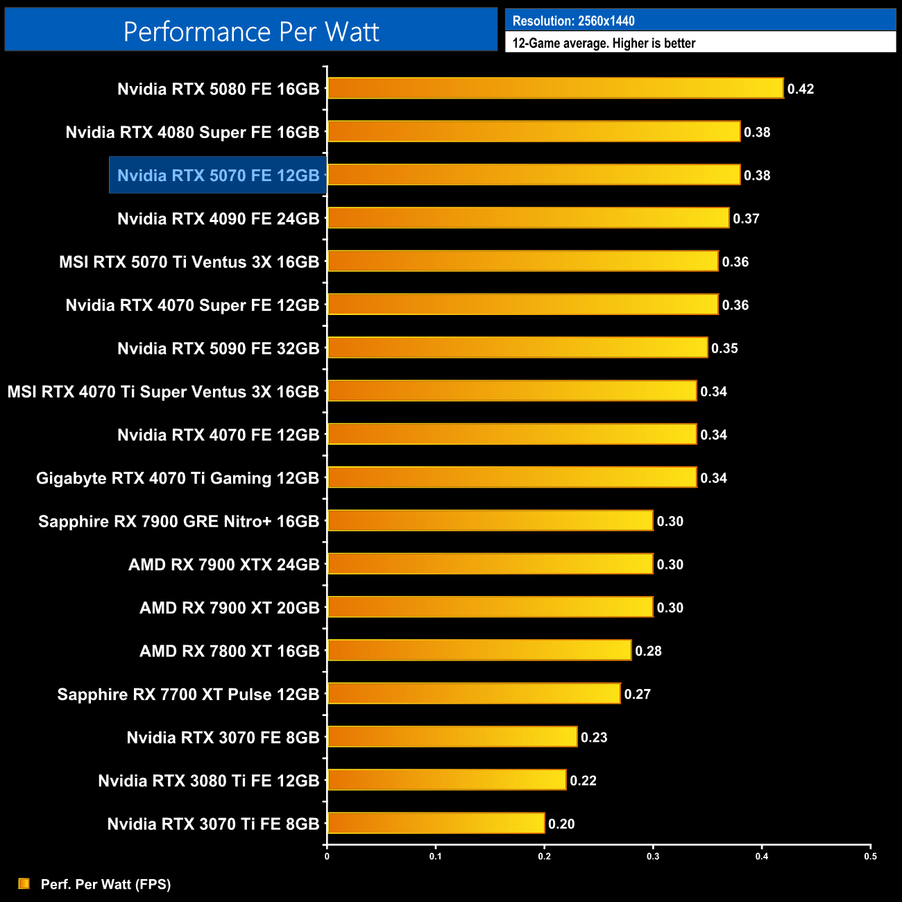 At 1440p, overall efficiency is still tied with the RTX 4080 Super, but remains 10% behind the RTX 5080. Compared to the 4070 Super, that means we're looking at performance per watt that is just 6% higher from this new GPU.