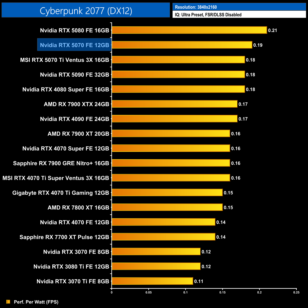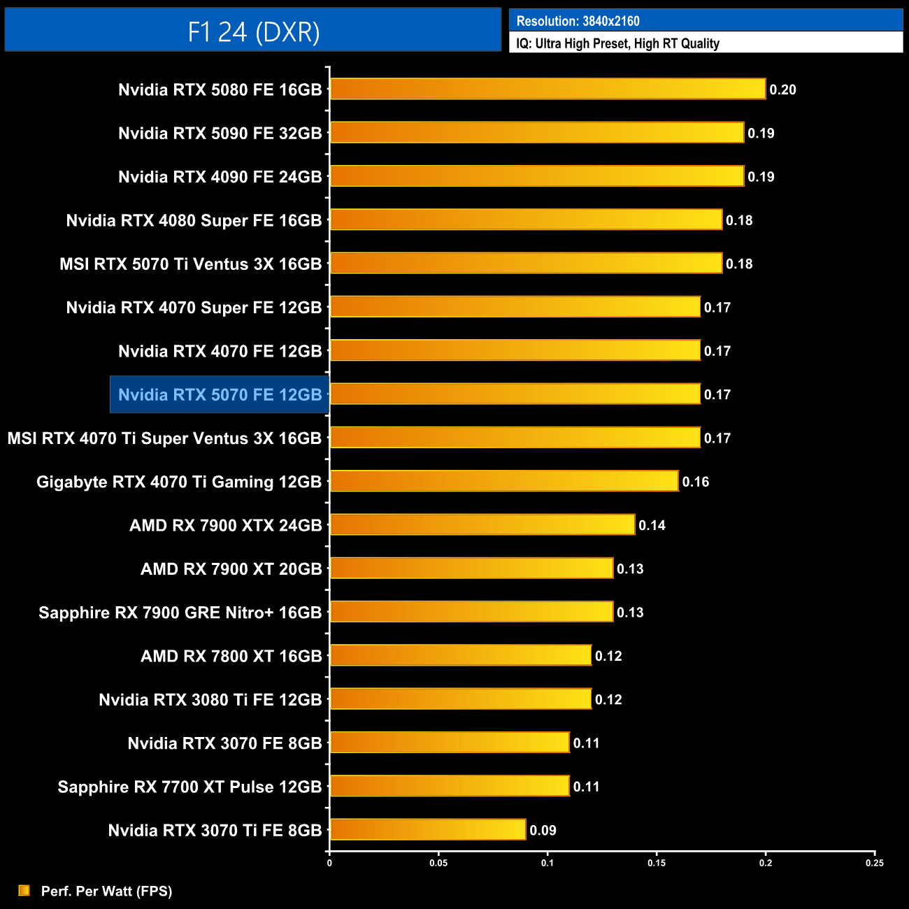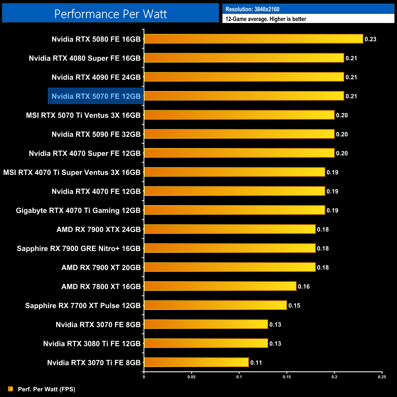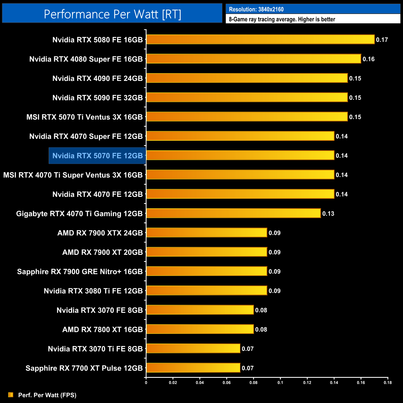 Lastly, 4K is really more of the same, with the 5080 still leading the way, while the 5070 a is mere 5% more efficient than the 4070 Super.