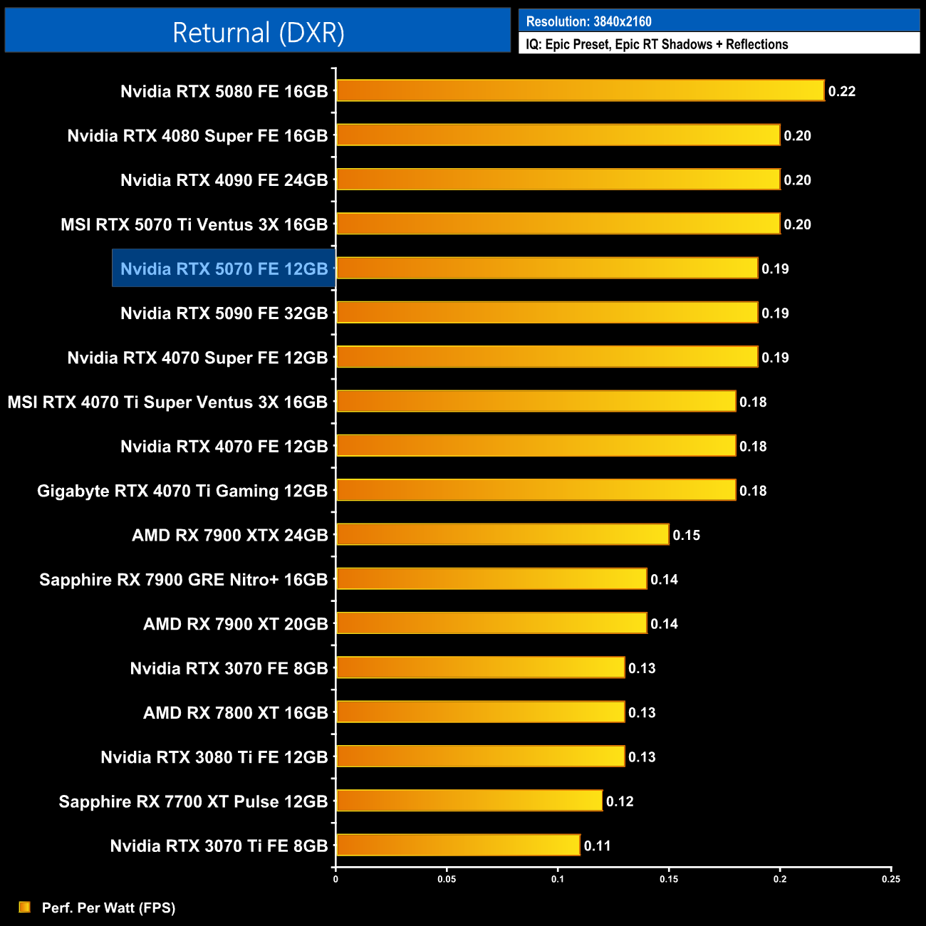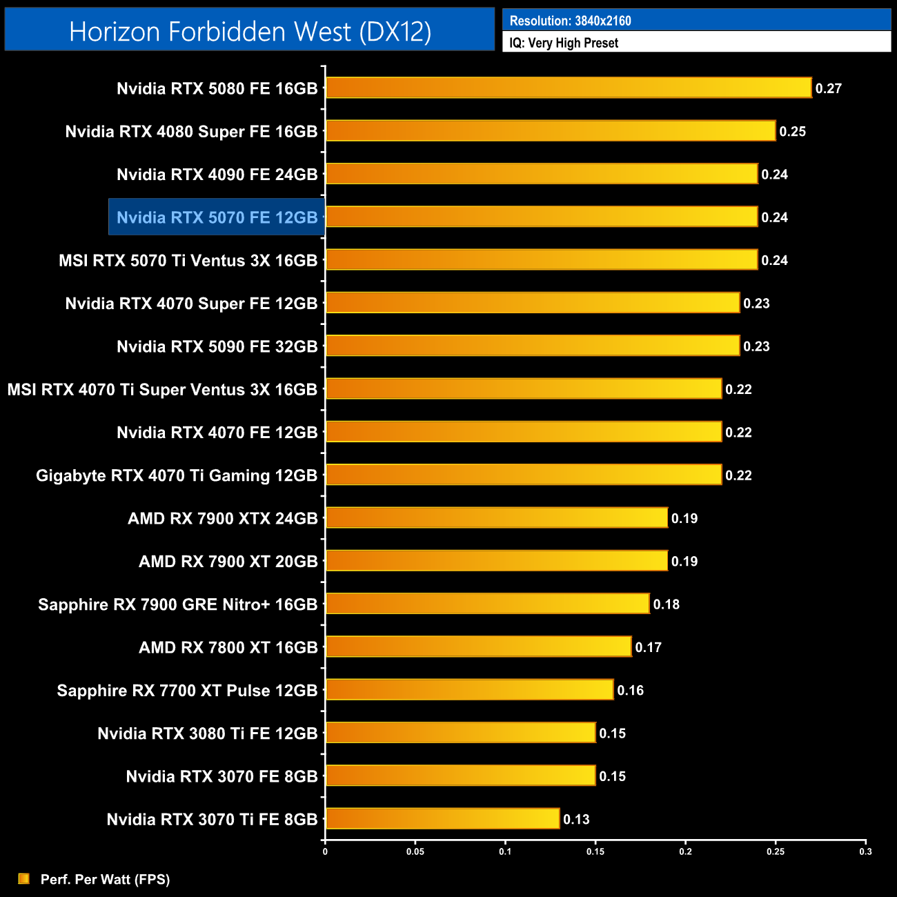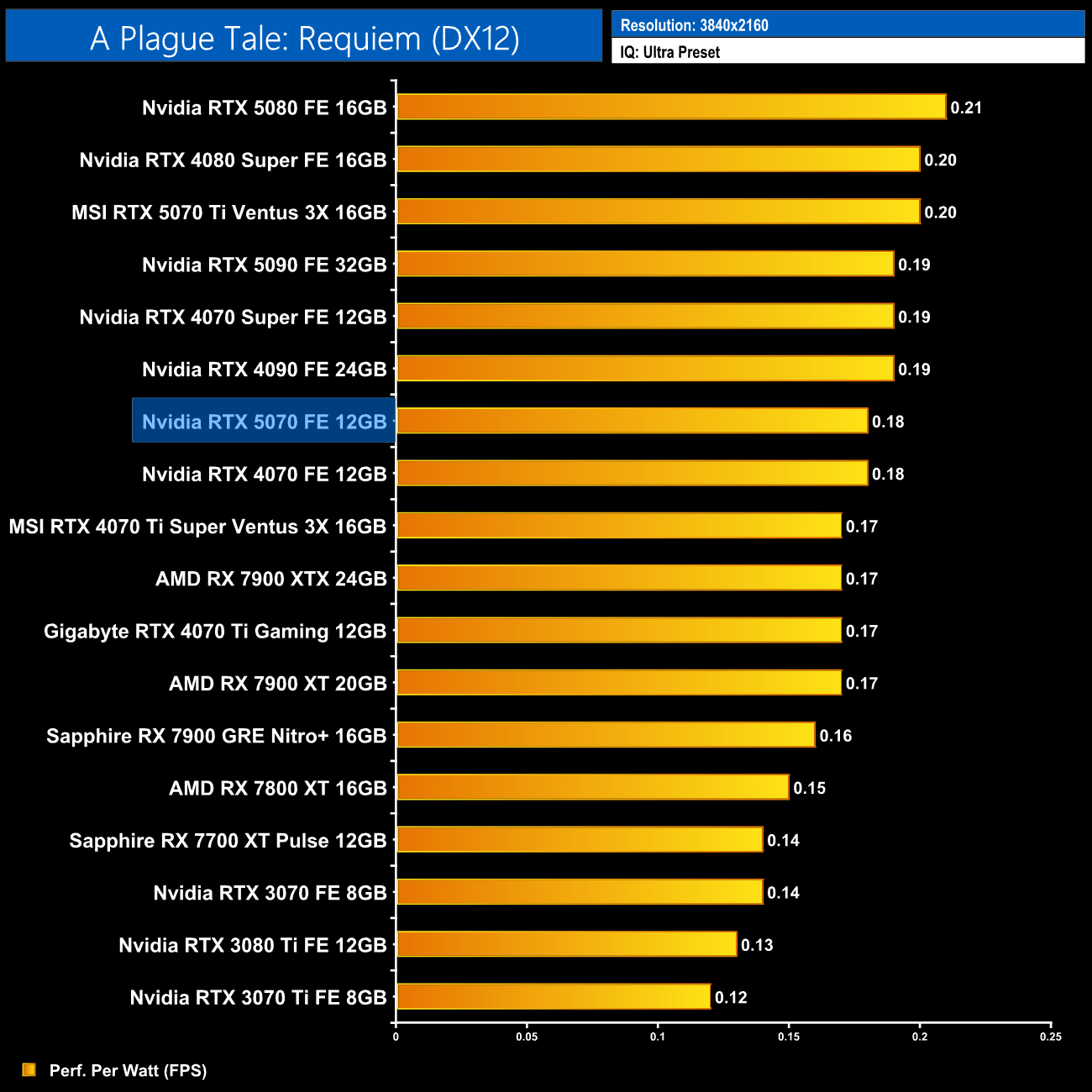 Lastly, 4K is really more of the same, with the 5080 still leading the way, while the 5070 a is mere 5% more efficient than the 4070 Super.