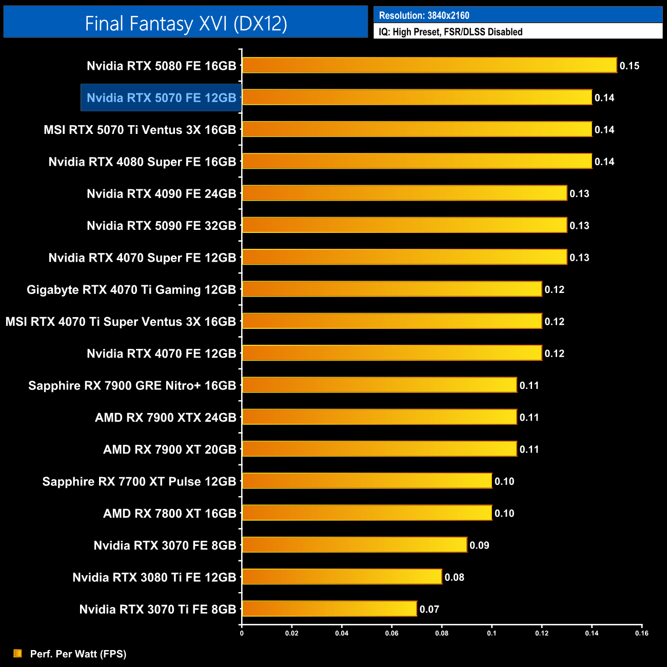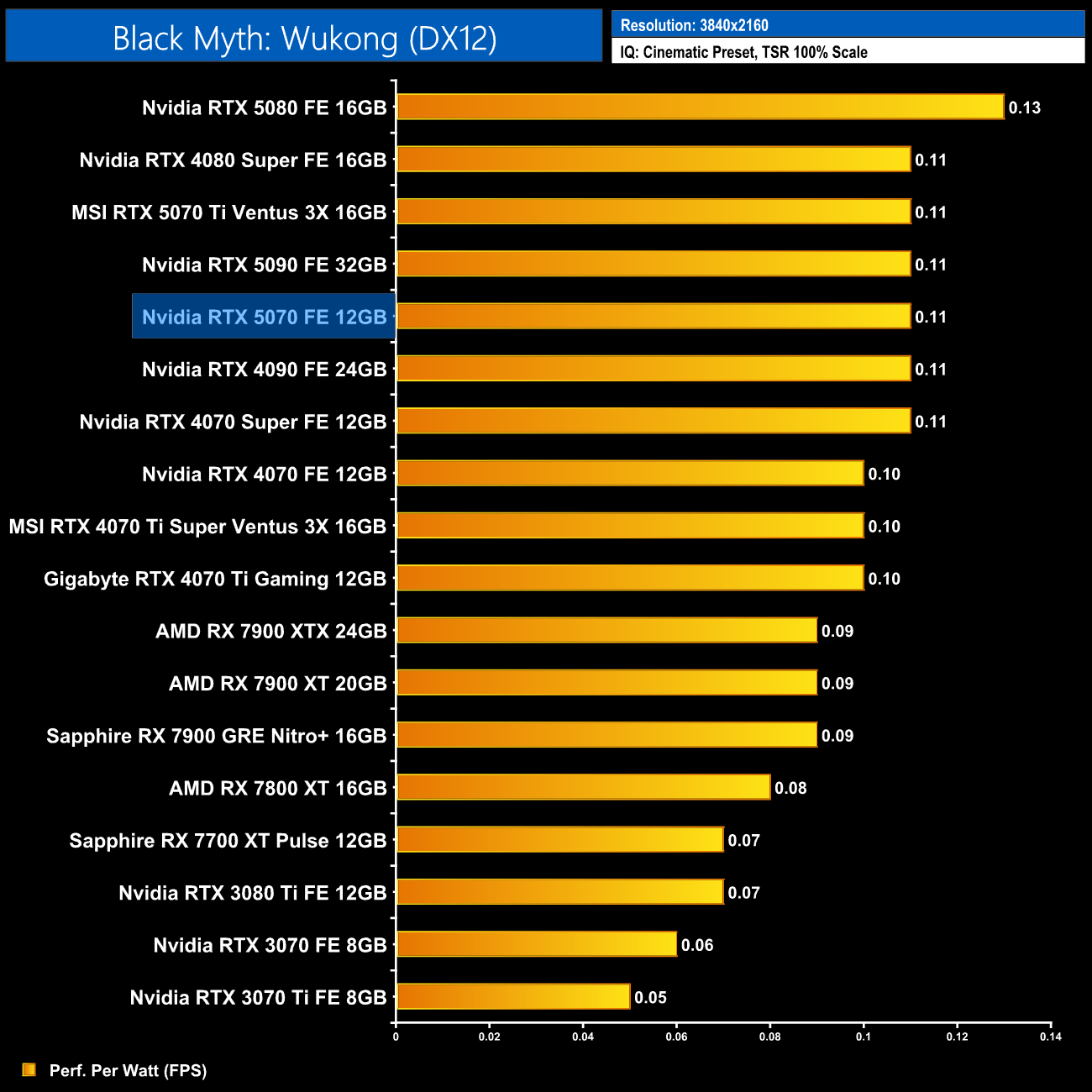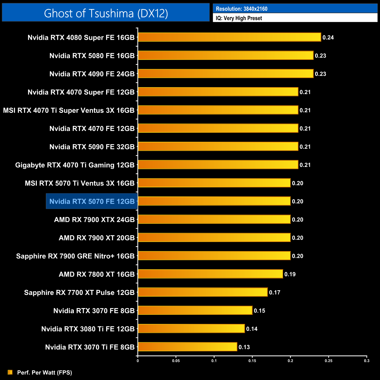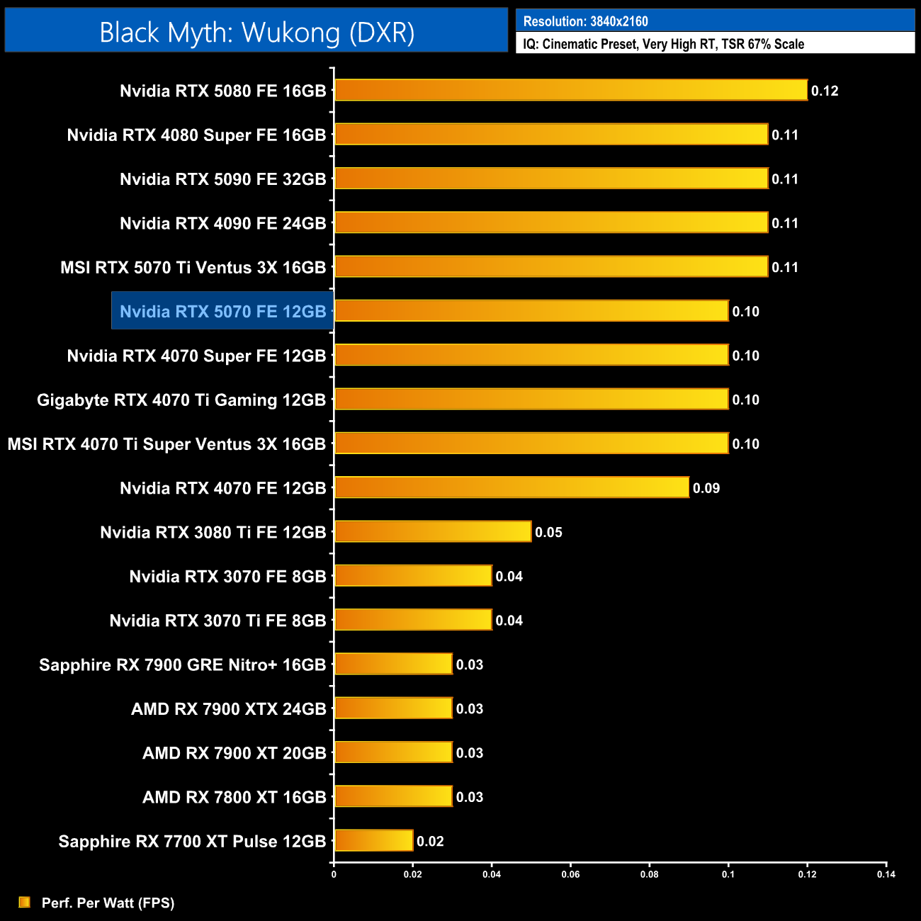 Lastly, 4K is really more of the same, with the 5080 still leading the way, while the 5070 a is mere 5% more efficient than the 4070 Super.