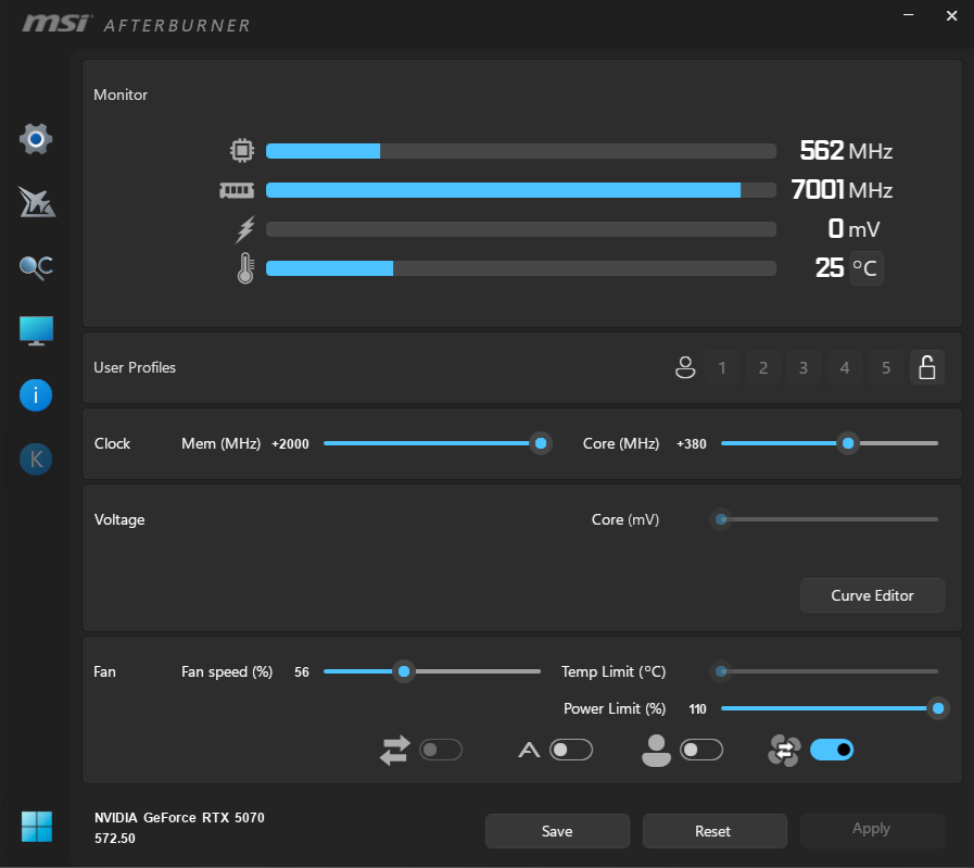 As with all 50 series GPUs I have tested so far, I was able to maximise the memory slider at +2000MHz. Nvidia allows a 10% power increase, and I also added 380MHz to the GPU core.