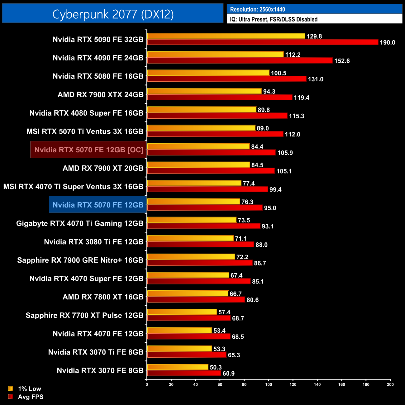 This overclock netted us some decent gains, in line with the 5070 Ti and 5080, given frame rates increased by 11% in Cyberpunk and then by 10% in the other two games tested. It's certainly more than we would have come to expect based on how things have been going over the last two years.