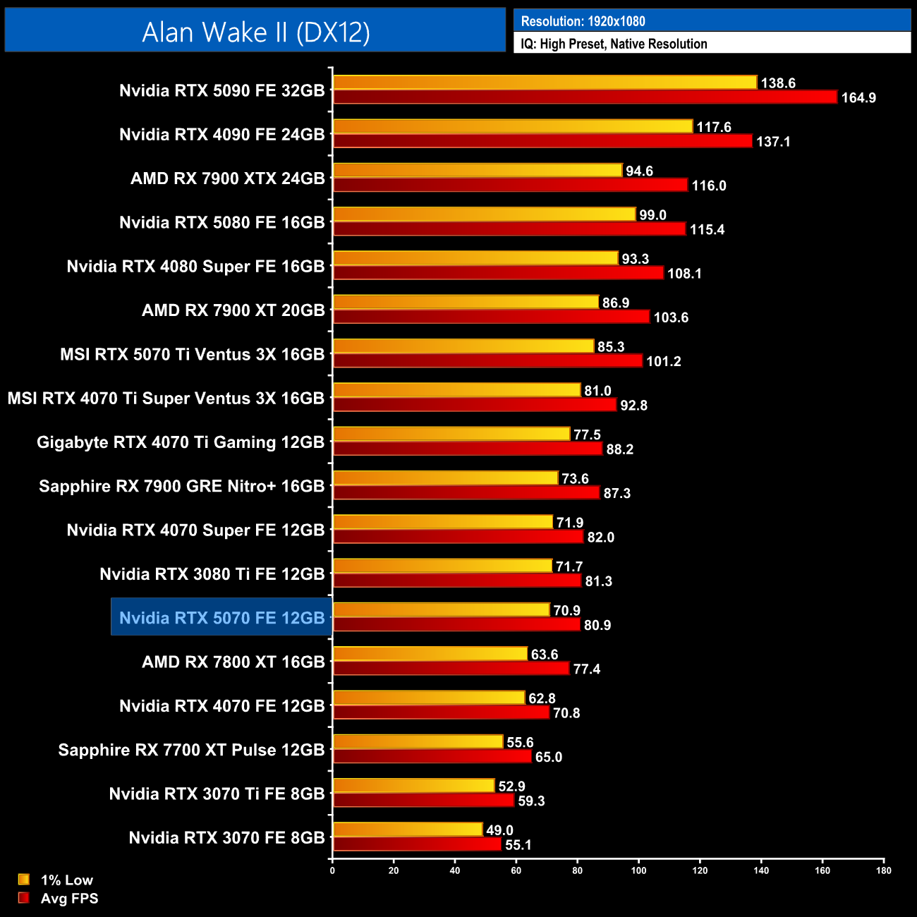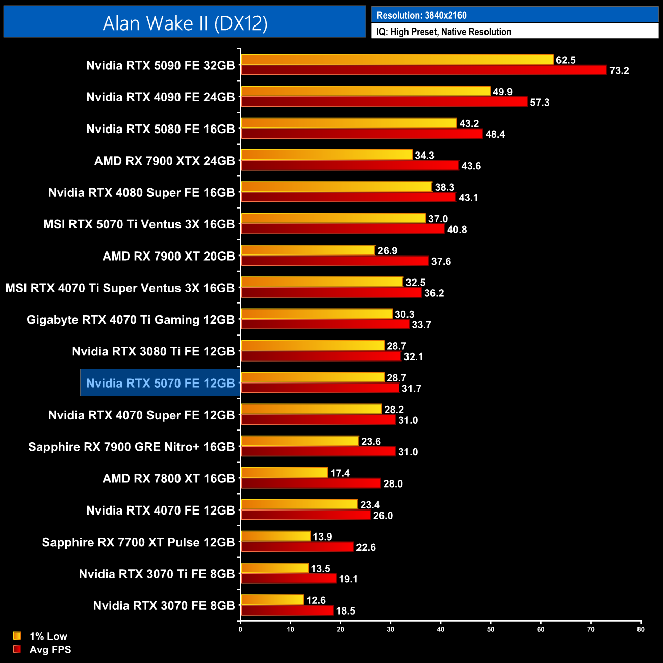 Starting off with Alan Wake 2, at 1440p the RTX 5070 hits 58fps on average, so performance is identical to the RTX 4070 Super, RX 7900 GRE and even the RTX 3080 Ti – all four cards are clustered very tightly together.