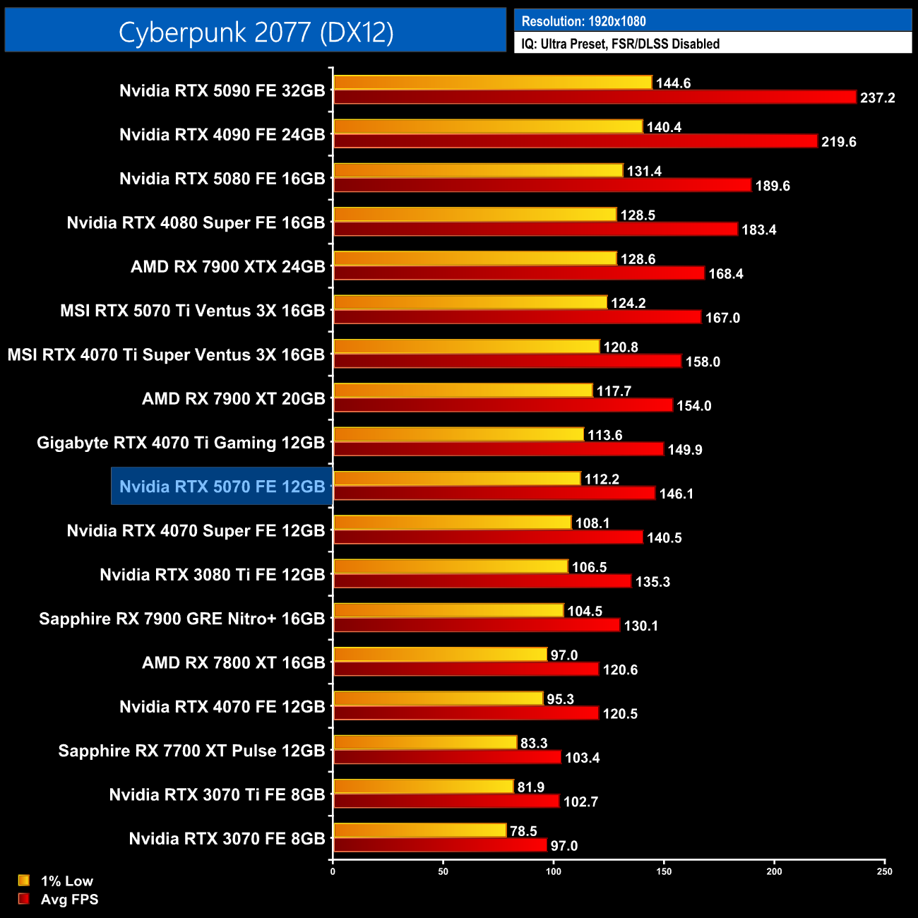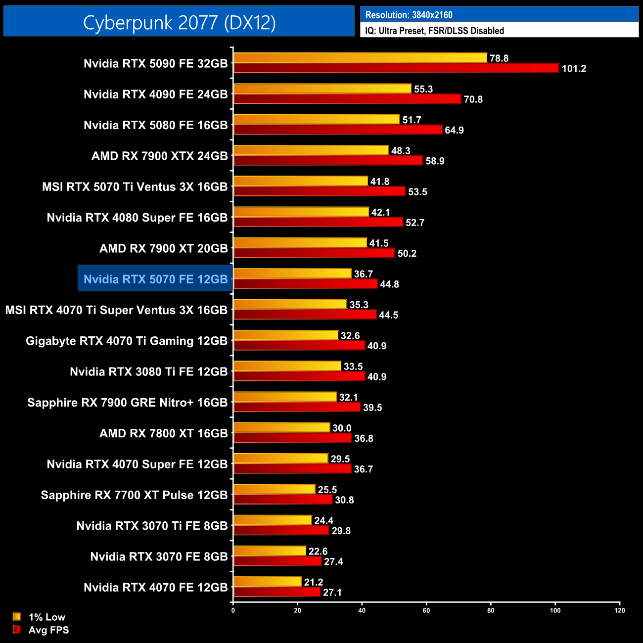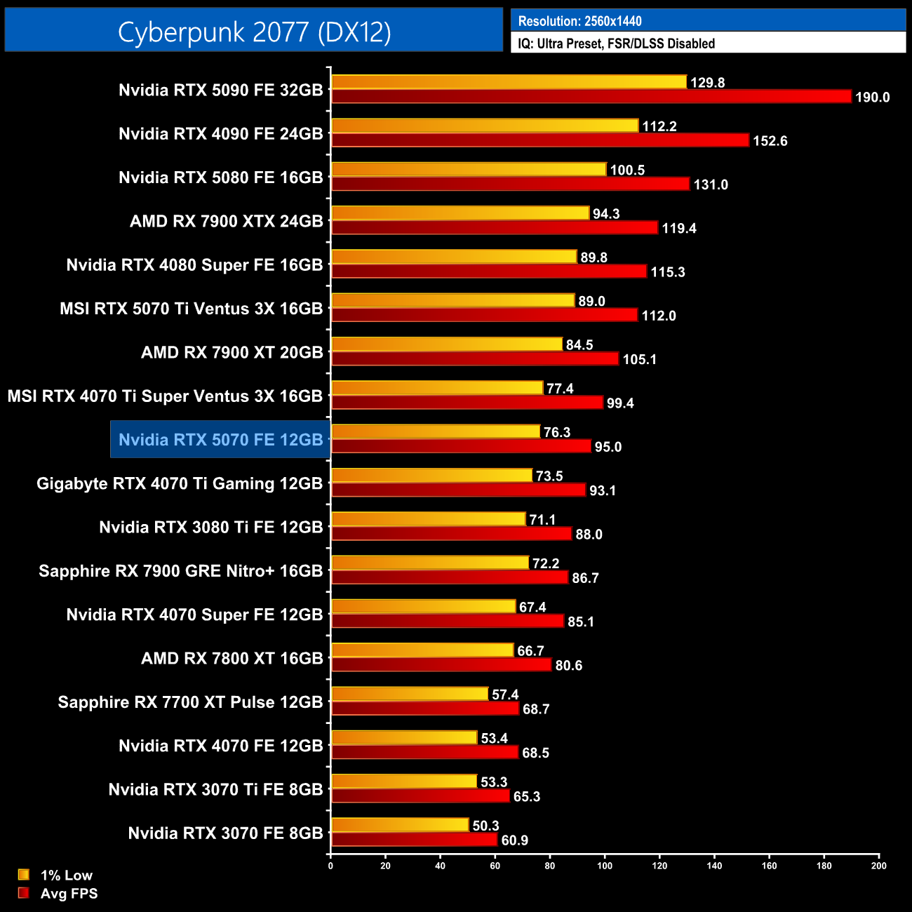 Cyberpunk 2077 has been the one game where the 50 series over-performs, relative to the rest of the games we test, and that's no different for the RTX 5070. At 1440p it's 12% faster than the 4070 Super at 1440p and only a handful of frames behind the 4070 Ti Super.