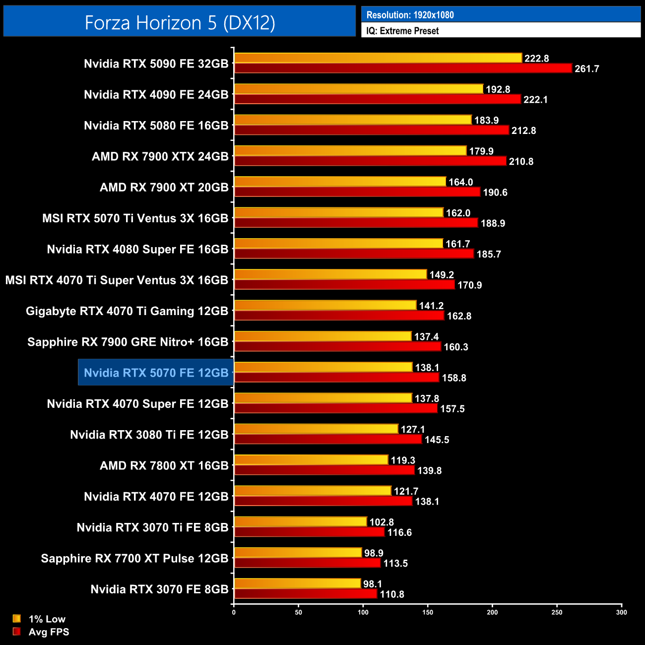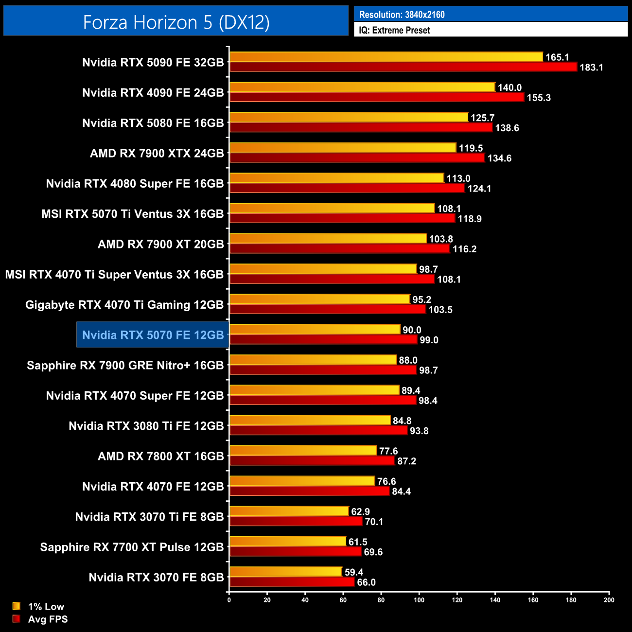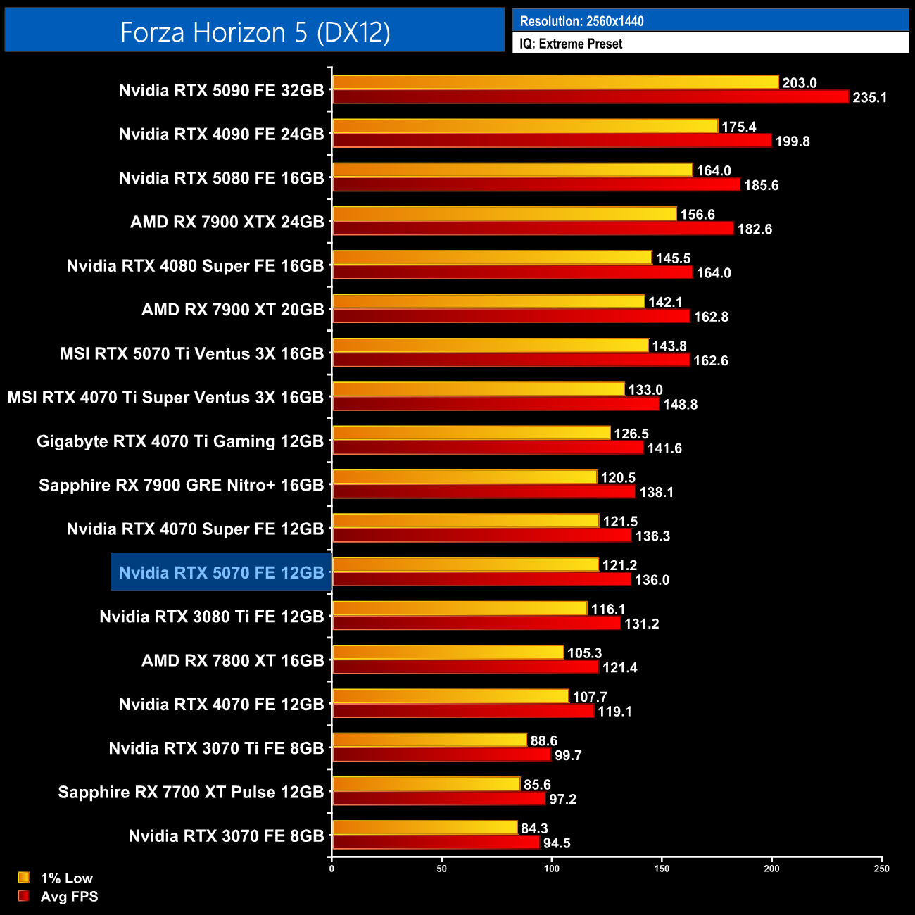 That trend stays the same as we head into Forza Horizon 5 – there's nothing to split the 4070 Super, 7900 GRE and 5070 at 1440p, so it doesn't seem like much progress has been made gen-on-gen…