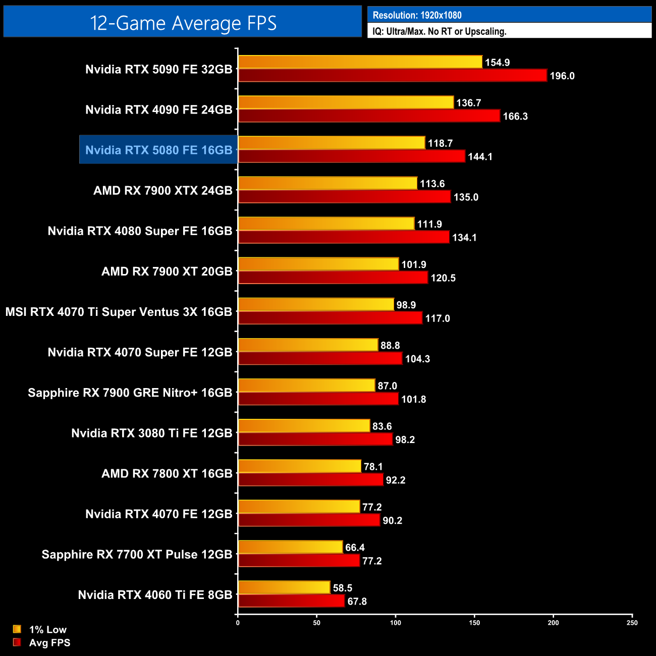 Overall then, across the 12 games tested, at 1440p the RTX 5080 delivered an average frame rate of 110fps, and that makes it 9% faster than the RTX 4080 Super. It's also just 7% faster than the RX 7900 XTX, while it's 15% and 30% slower than the RTX 4090 and RTX 5090, respectively.