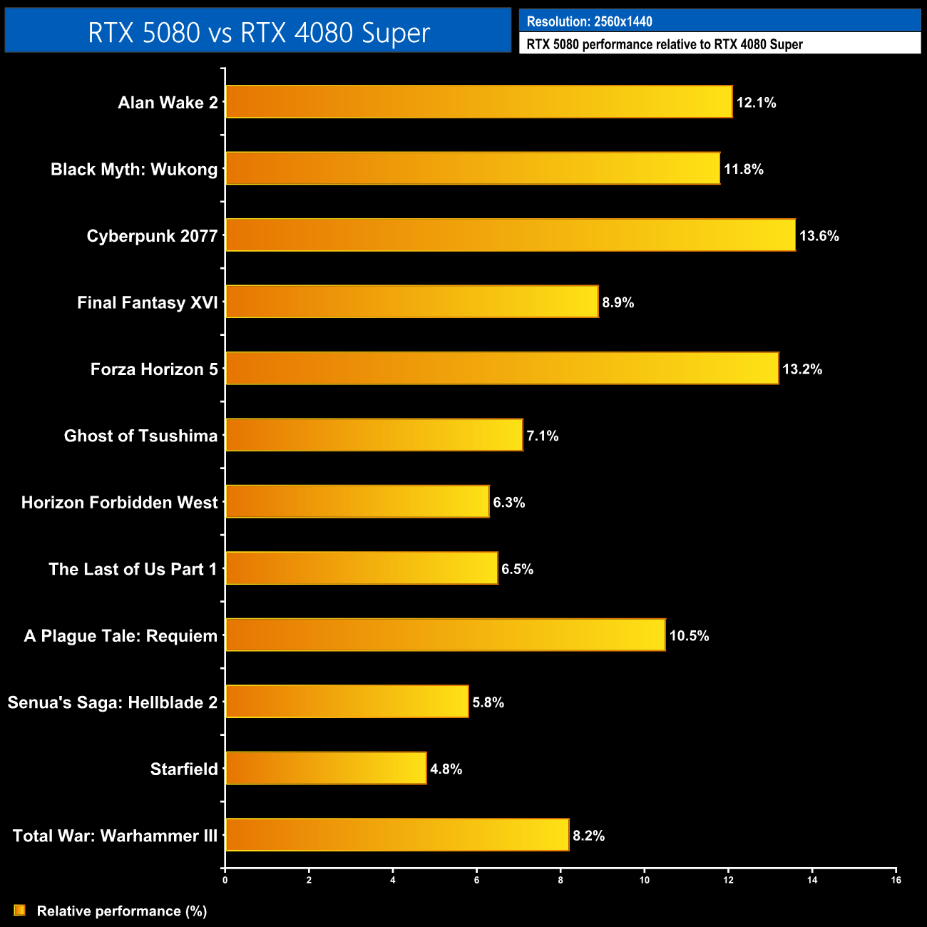 Just to breakdown the relative rasterisation performance versus the 4080 Super, at 1440p we saw gains between 5% up to 14%.