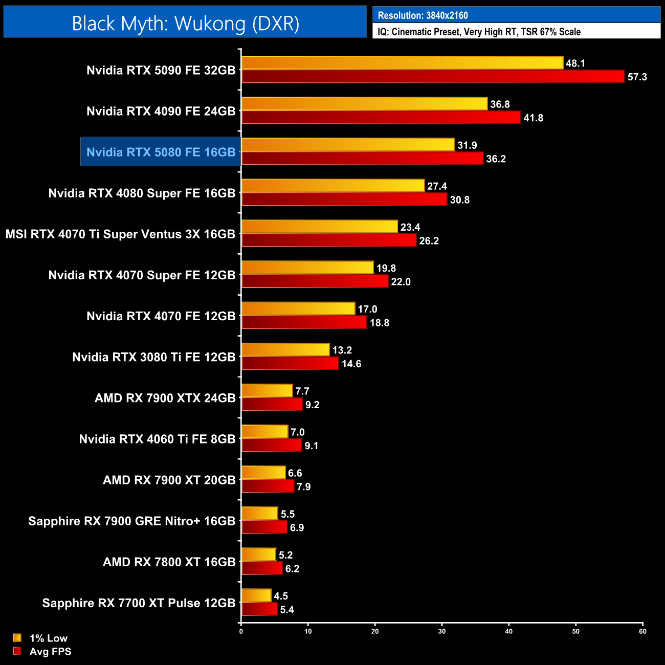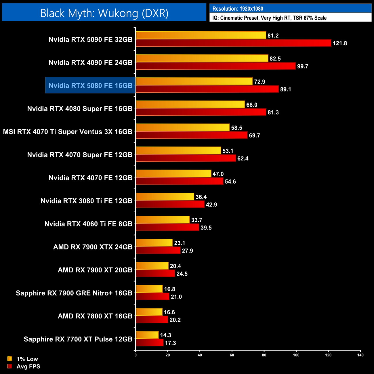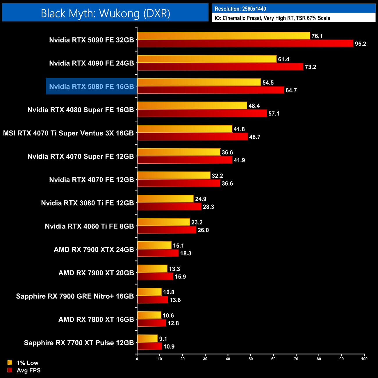 As for Black Myth: Wukong, this one is another punishing title when path tracing is enabled, and at 1440p the 5080 manages 65fps on average, even when using Quality upscaling. That makes it 13% faster than the 4080 Super, but its 12% slower than the 4090.