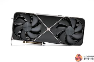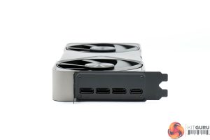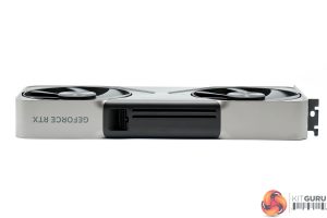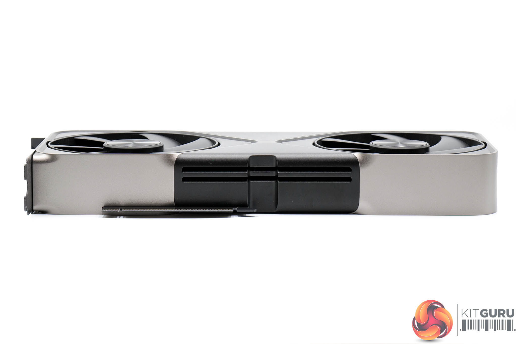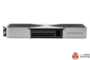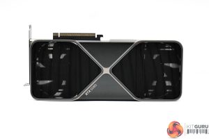 The front side is home to the GeForce RTX logo, which lights up with a white LED once powered on. We also get a look at the back of the card, and you can even see the outline of the two fans coming through the fin stack – that shows just much how of a focus the ‘flow through' design has been for Nvidia when manufacturing this card, as airflow is almost completely unobstructed.