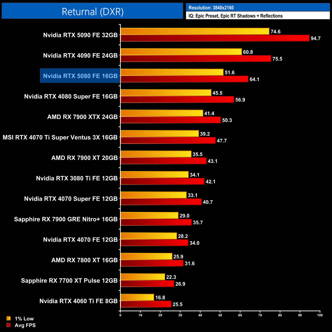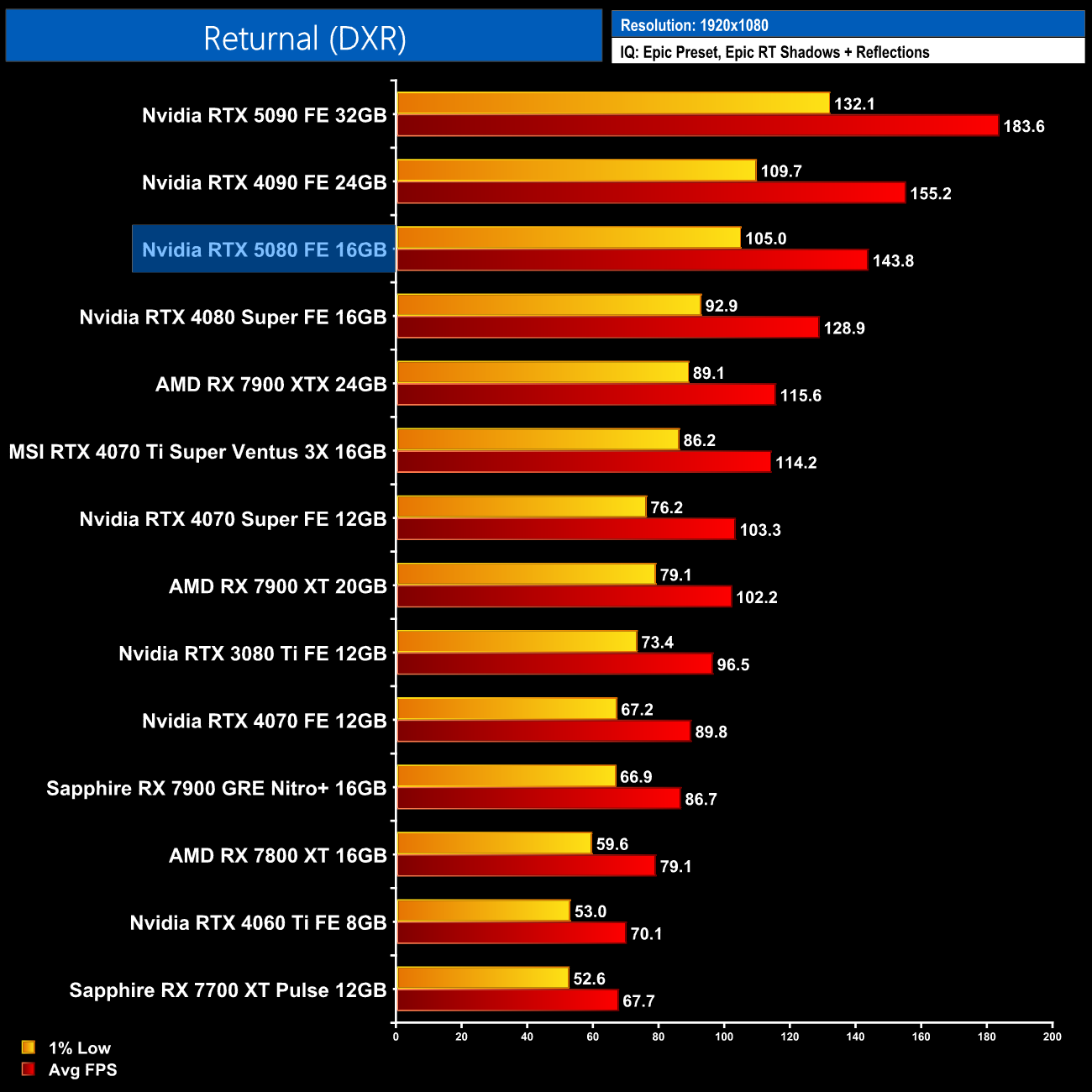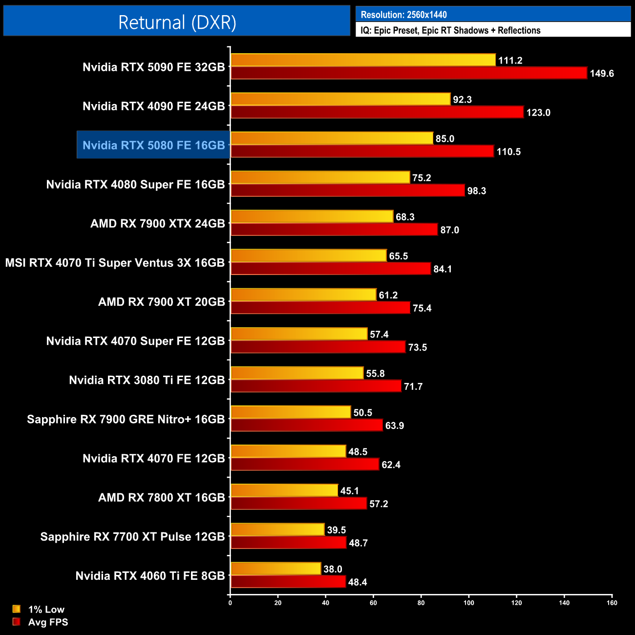 Returnal is a relatively light workout when it comes to ray tracing – at least by modern standards – and at 1440p the RTX 5080 delivers 111fps, putting it 10% behind the 4090 and 12% faster than the 4080 Super.