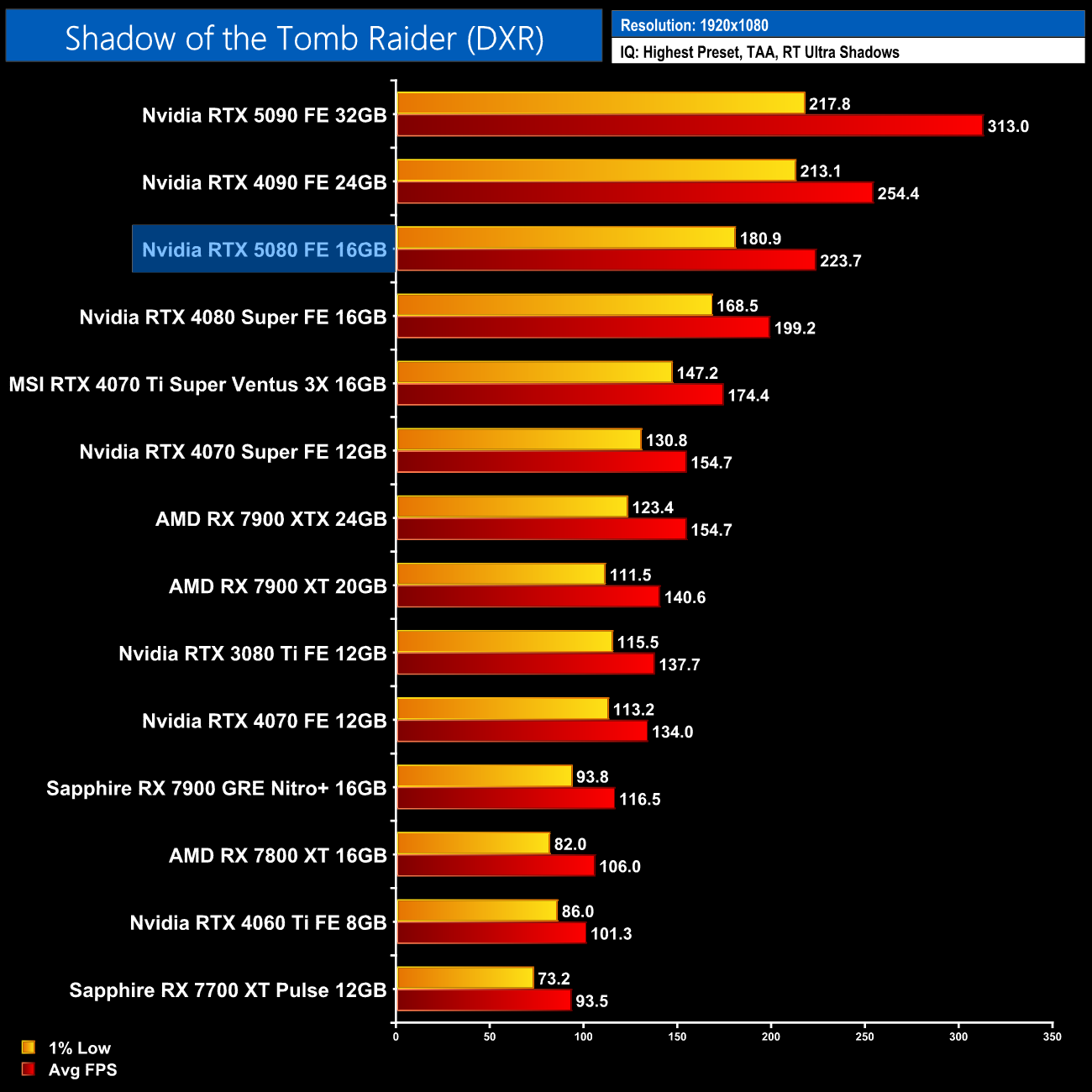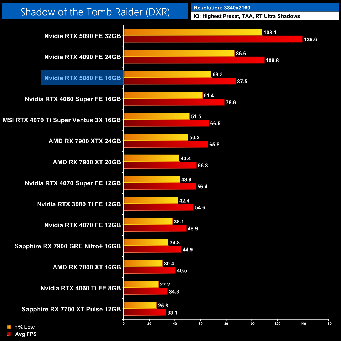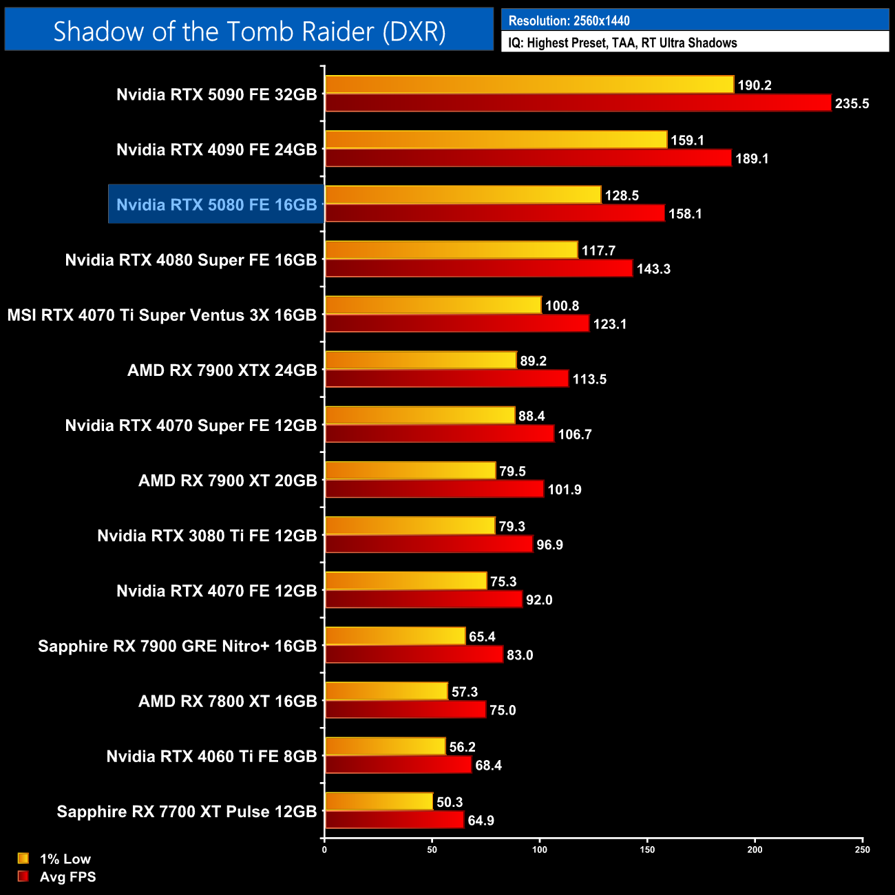 As for Shadow of the Tomb Raider – an oldie but definitely a goodie – at 1440p the RTX 5080 cranks out 158fps with ray tracing maxed out, and that makes it 10% faster than the 4080 Super, while it's 40% ahead of the 7900 XTX.