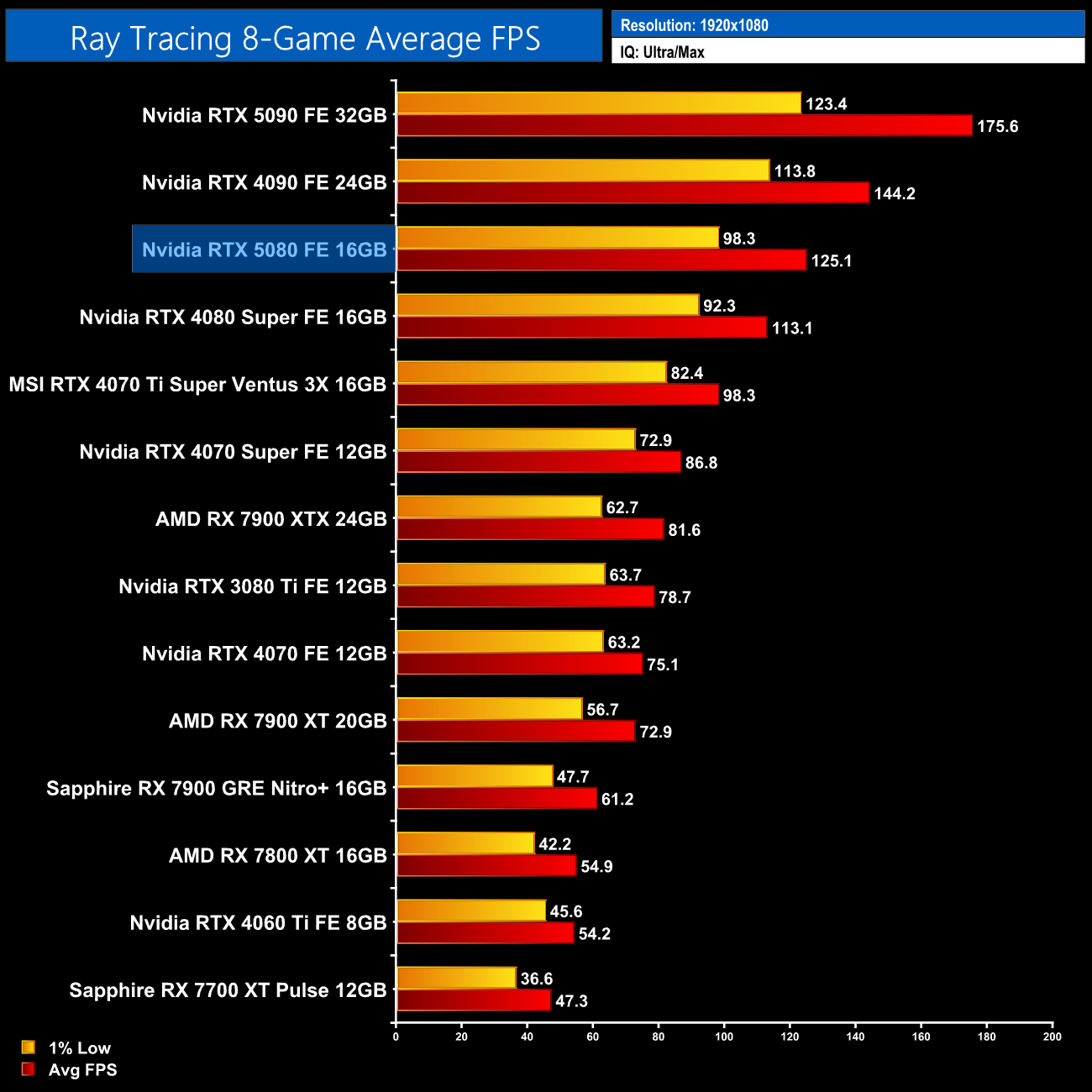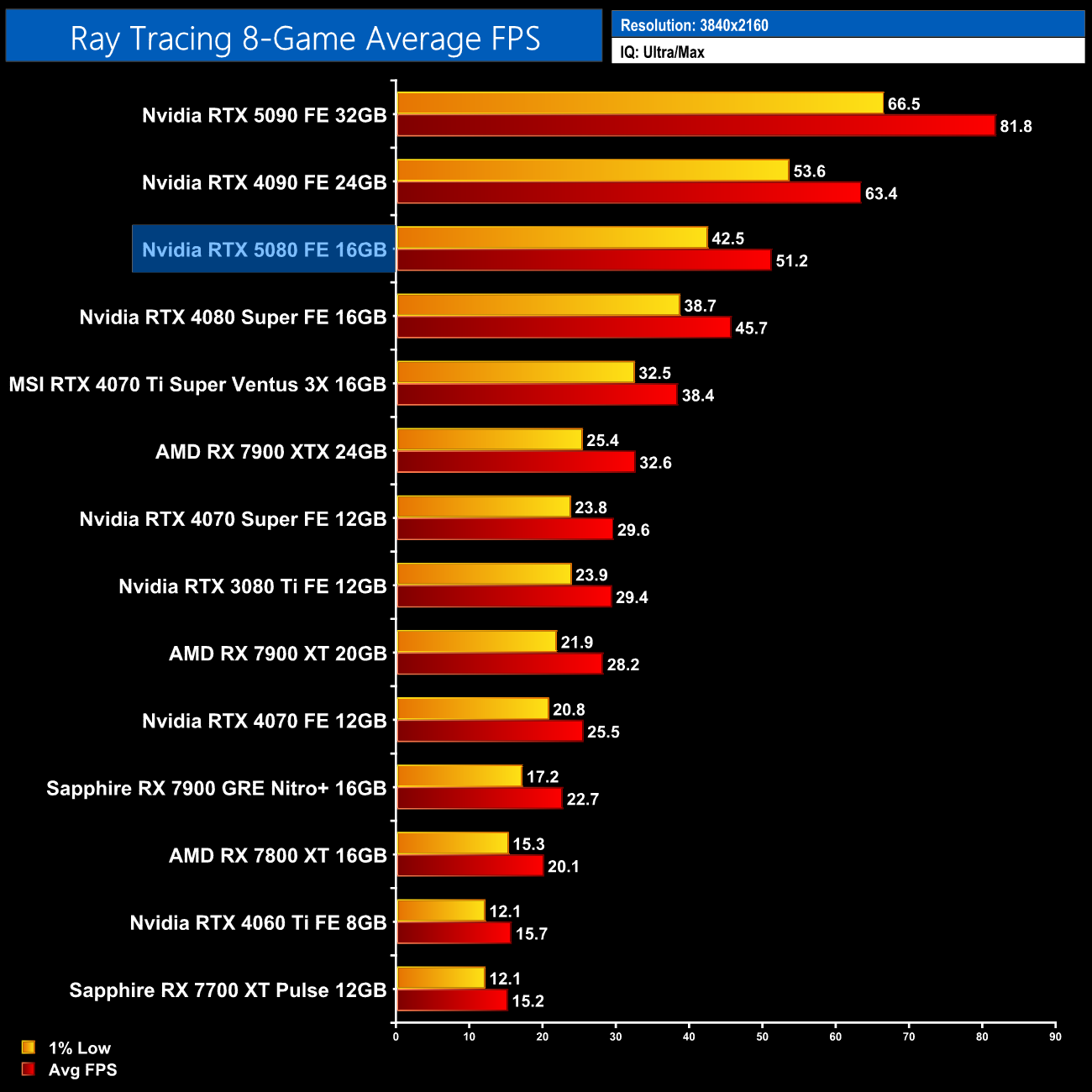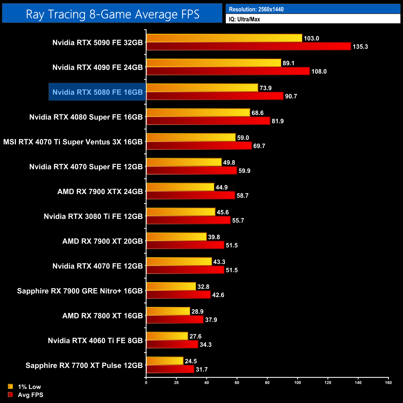 Overall then, averaged over the eight ray traced games tested, the RTX 5080 comes in 11% faster than the 4080 Super at 1440p. It's miles ahead of AMD's RX 7900 XTX, with a 55% advantage there, but it's still 16% slower than the RTX 4090.