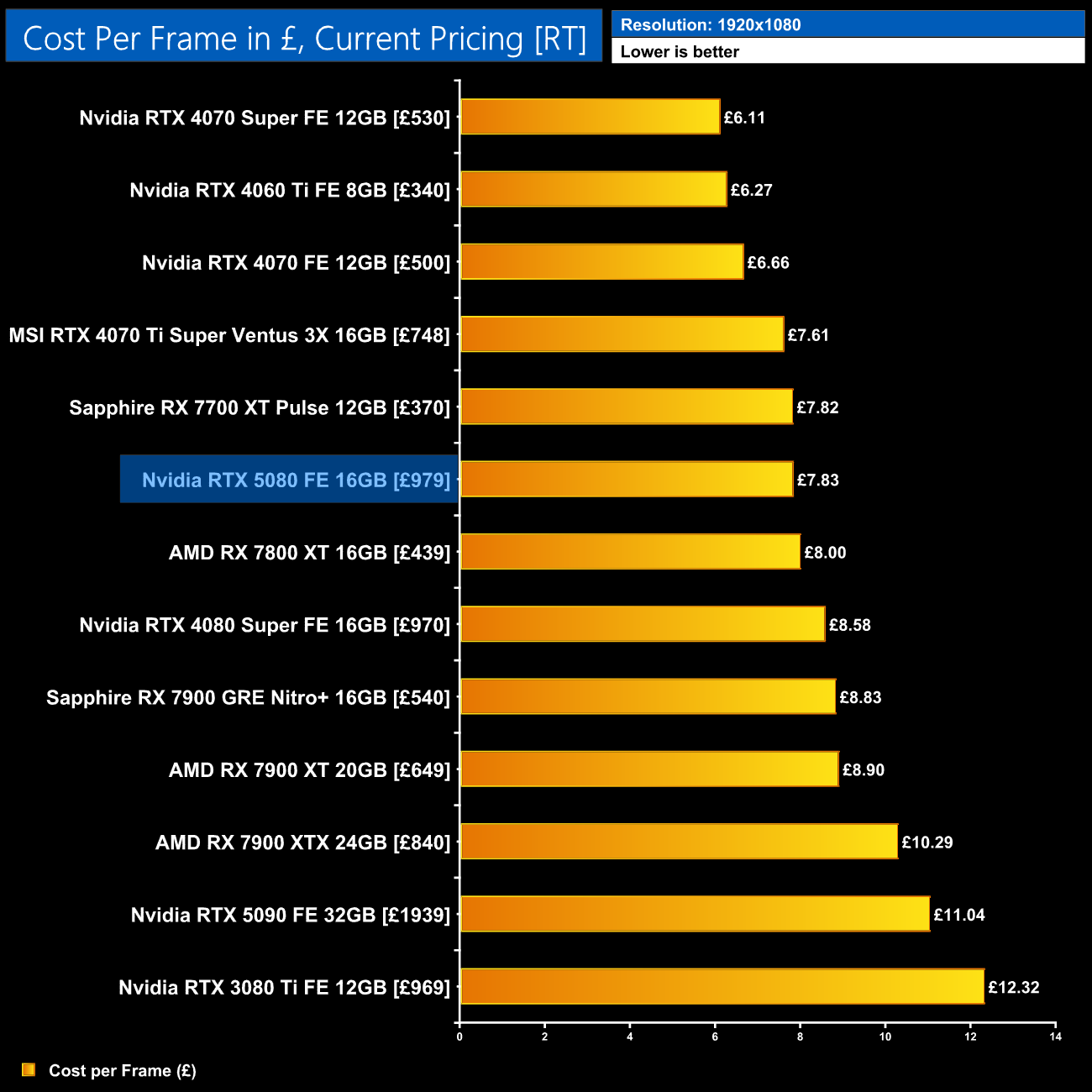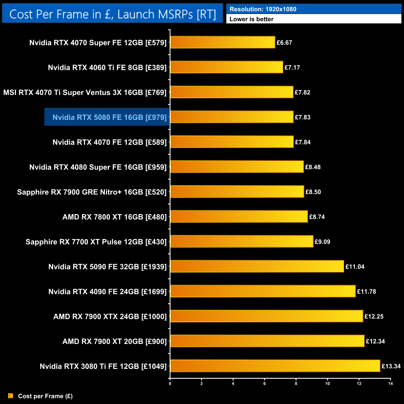 Things aren't quite so impressive when looking at the ray traced cost per frame data using current street pricing, with the 4070 Super retaking the lead, but the RTX 5080 is still in second place, offering marginally better value than the RTX 4070 Ti Super.