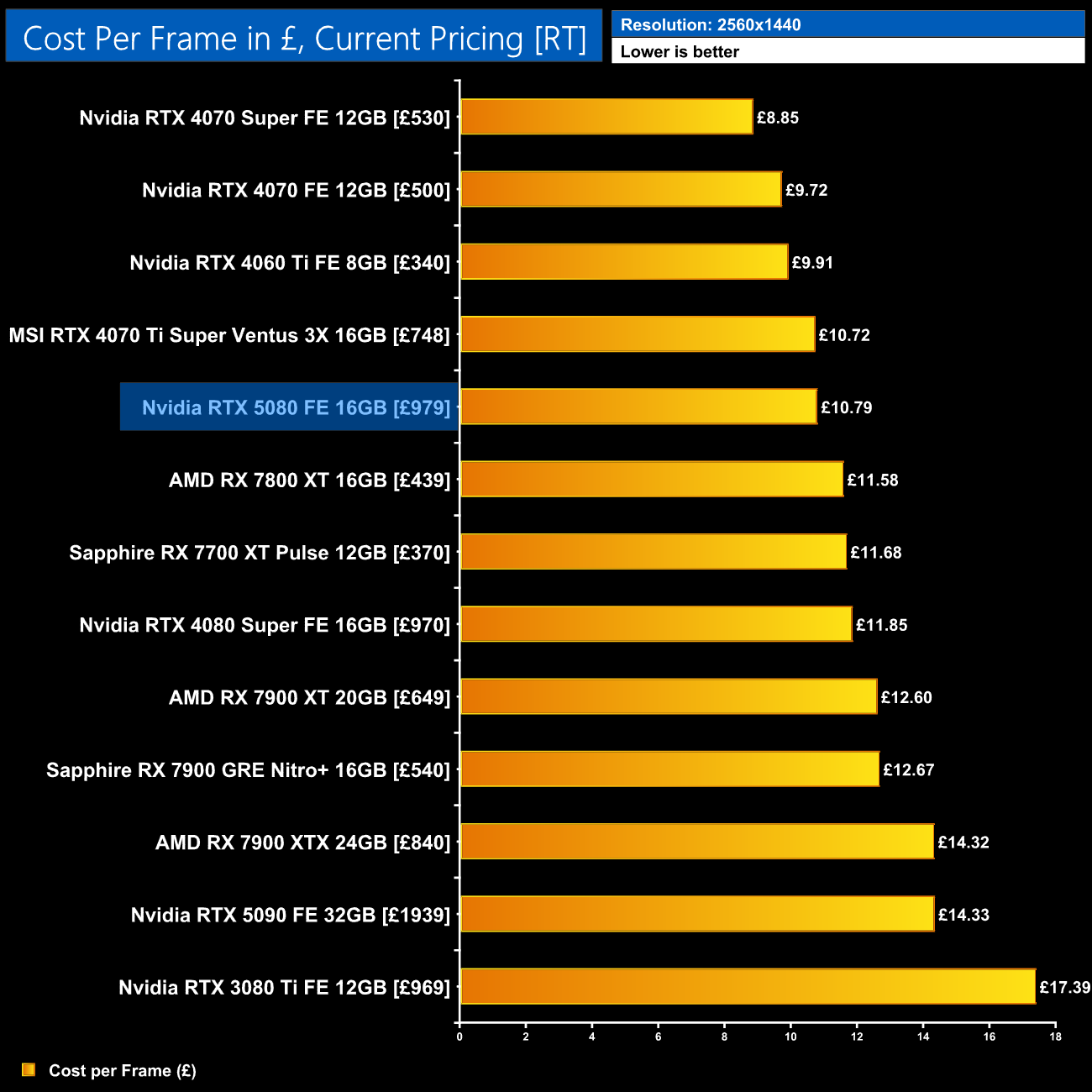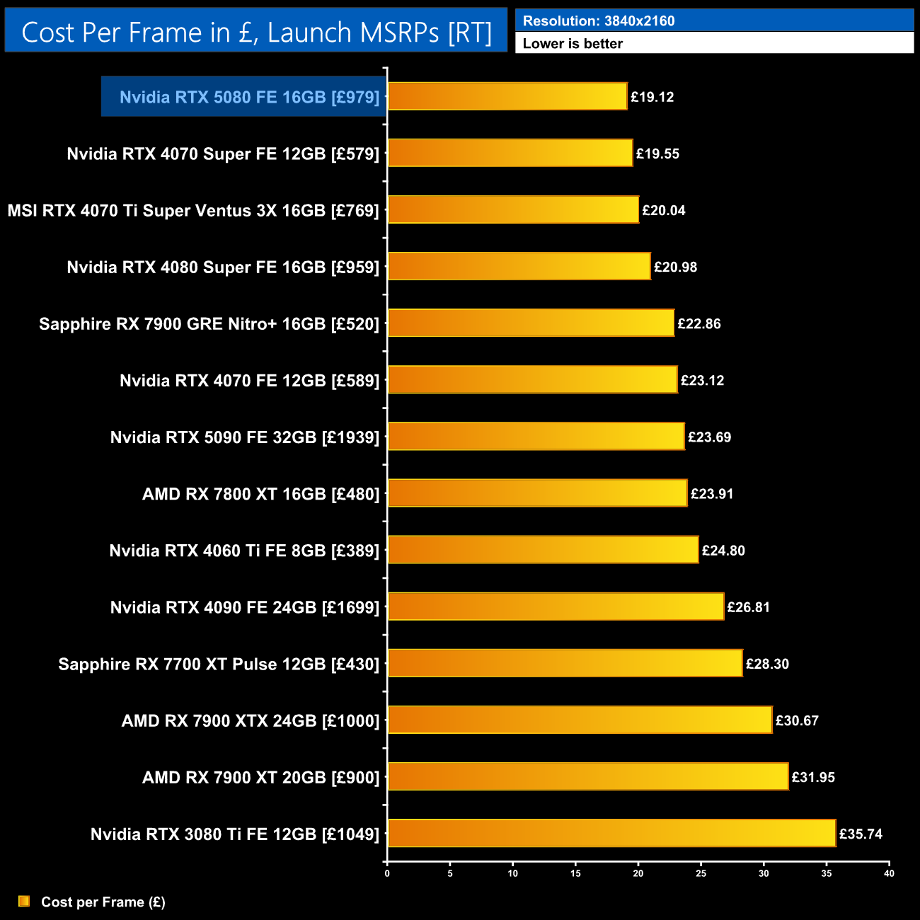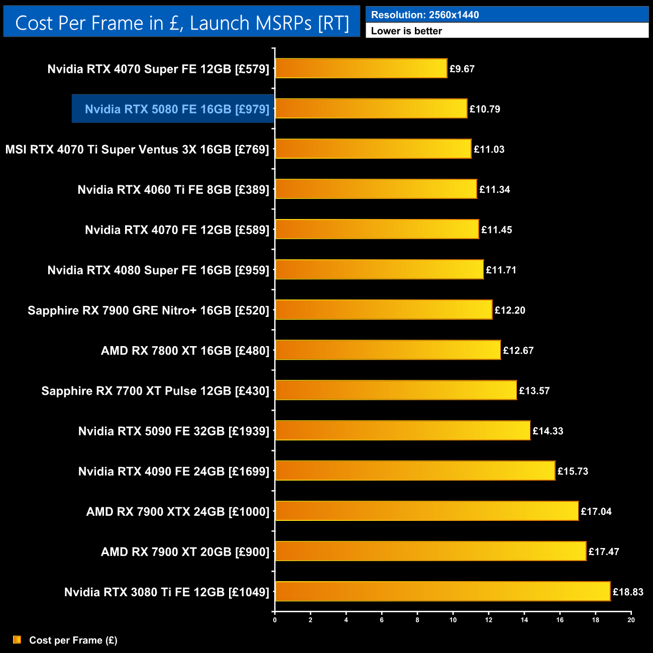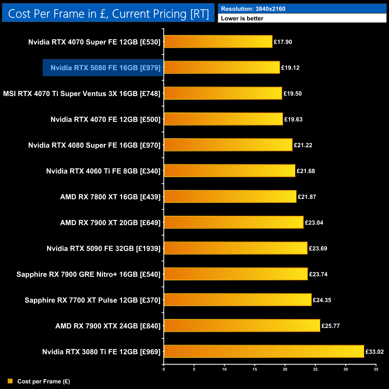 Cost per frame for ray tracing performance looks much more favourable for the RTX 5080, given it sits top of the chart – though only just, as it's just 2% better value than the RTX 4070 Super. Compared to the 4080 Super, we're looking at another 9% improvement to cost per frame.