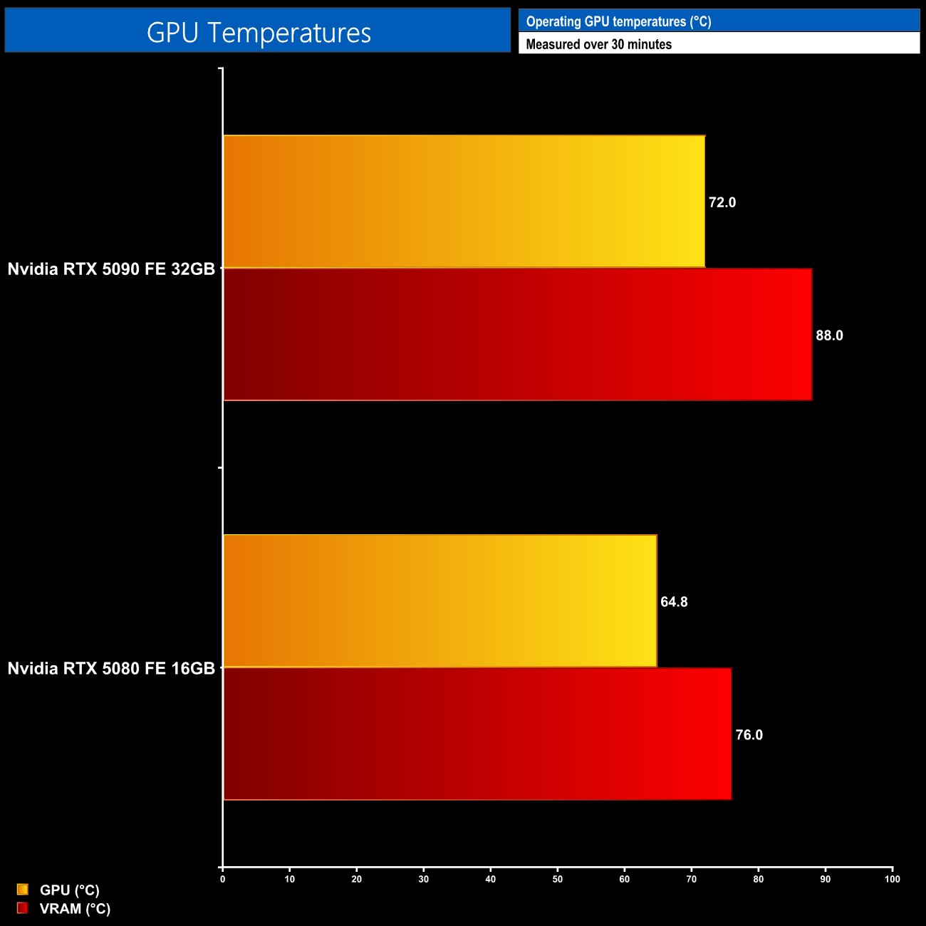 Despite rocking a few internal changes, such as the lack of the 3D Vapour Chamber, the RTX 5080 Founders Edition cooler is still more than a match for this 360W GPU, and temperatures hit just below 65C over our thirty minute stress test. VRAM, meanwhile, was slightly warmer at 76C, but still nothing to worry about. It's be interesting to see what performance would be like if Nvidia had used the same exact cooler for the 5080 as with the 5090, but even with a few cut backs, this is more than good enough.