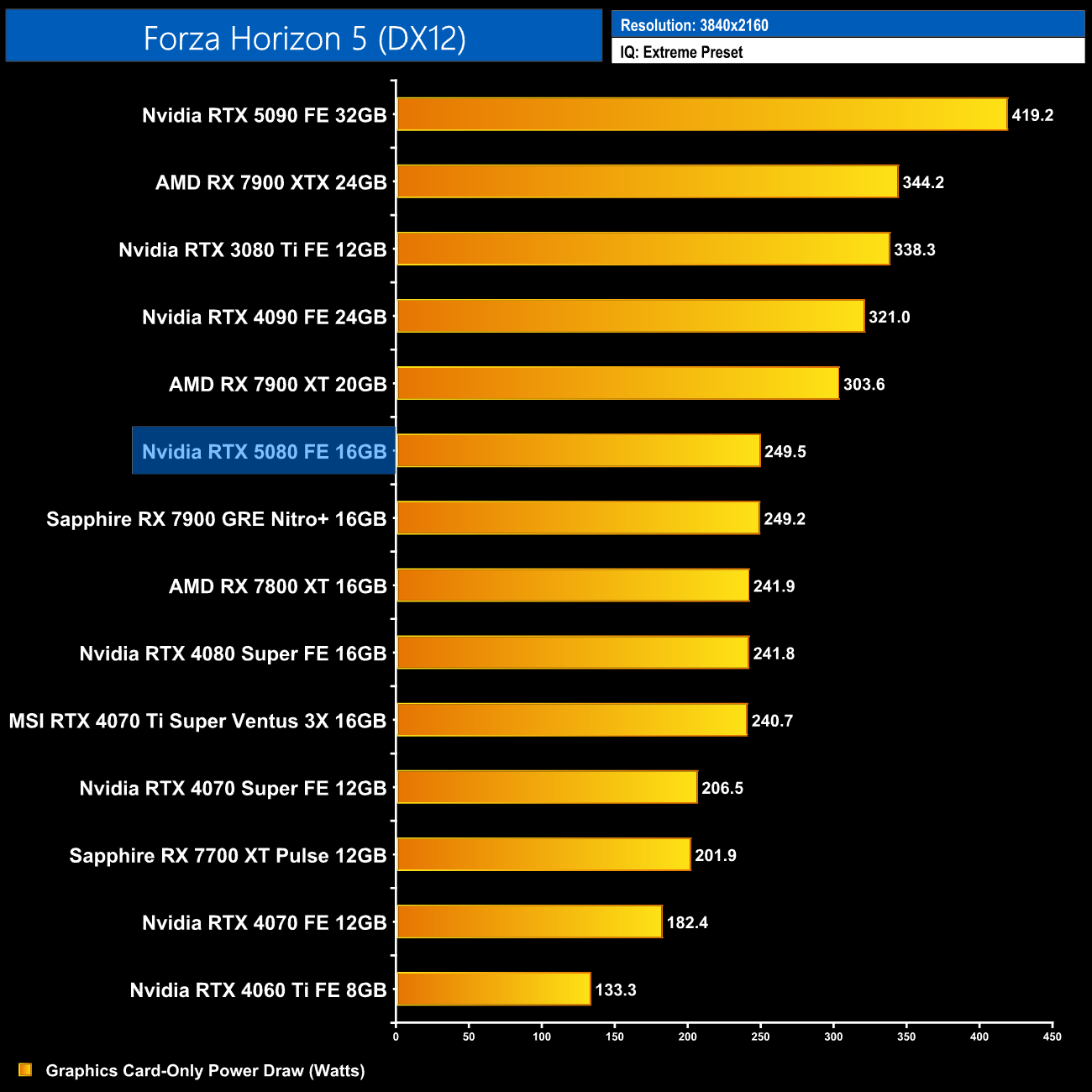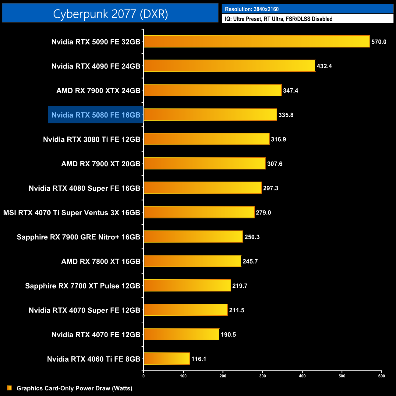 Even at 4K, the RTX 5080 doesn't really come close to its 360W TGP rating. There's a couple of games which see higher power – like Cyberpunk 2077 and A Plague Tale: Requiem – but eight of the twelve games tested saw power draw below 300W. On average, power is just 6W higher than the RTX 4080 Super in my testing, which bodes well for when we come to look at performance per Watt over the next few pages.