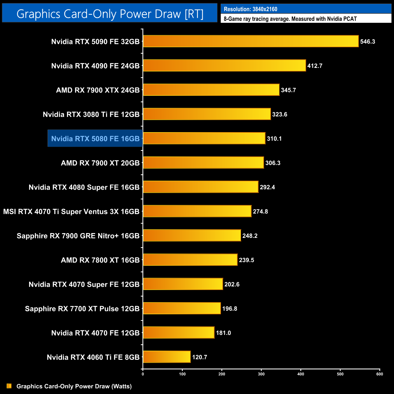 Here we present power draw figures for the graphics card-only, on a per-game basis for all twelve games we tested at 2160p (4K). This is measured using Nvidia's Power Capture Analysis Tool, also known as PCAT. You can read more about our updated power draw testing methodology HERE.