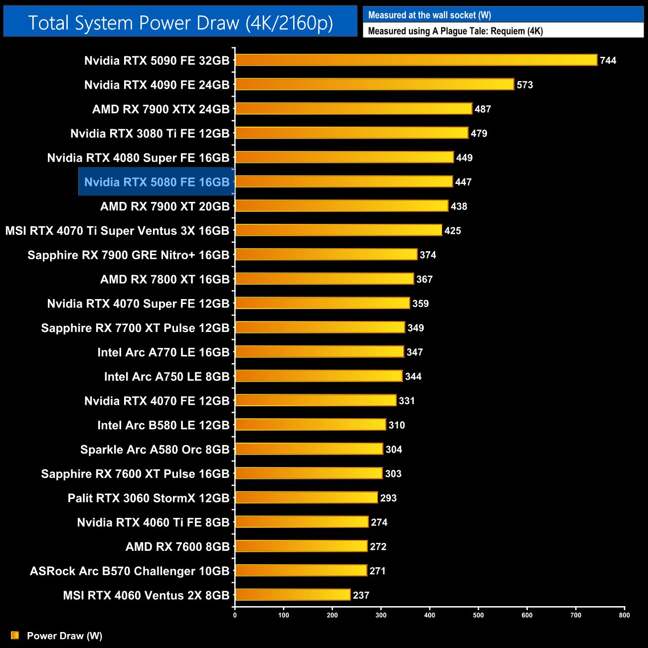 We measure system-wide power draw from the wall while running A Plague Tale: Requiem for 30 minutes (4K resolution).
