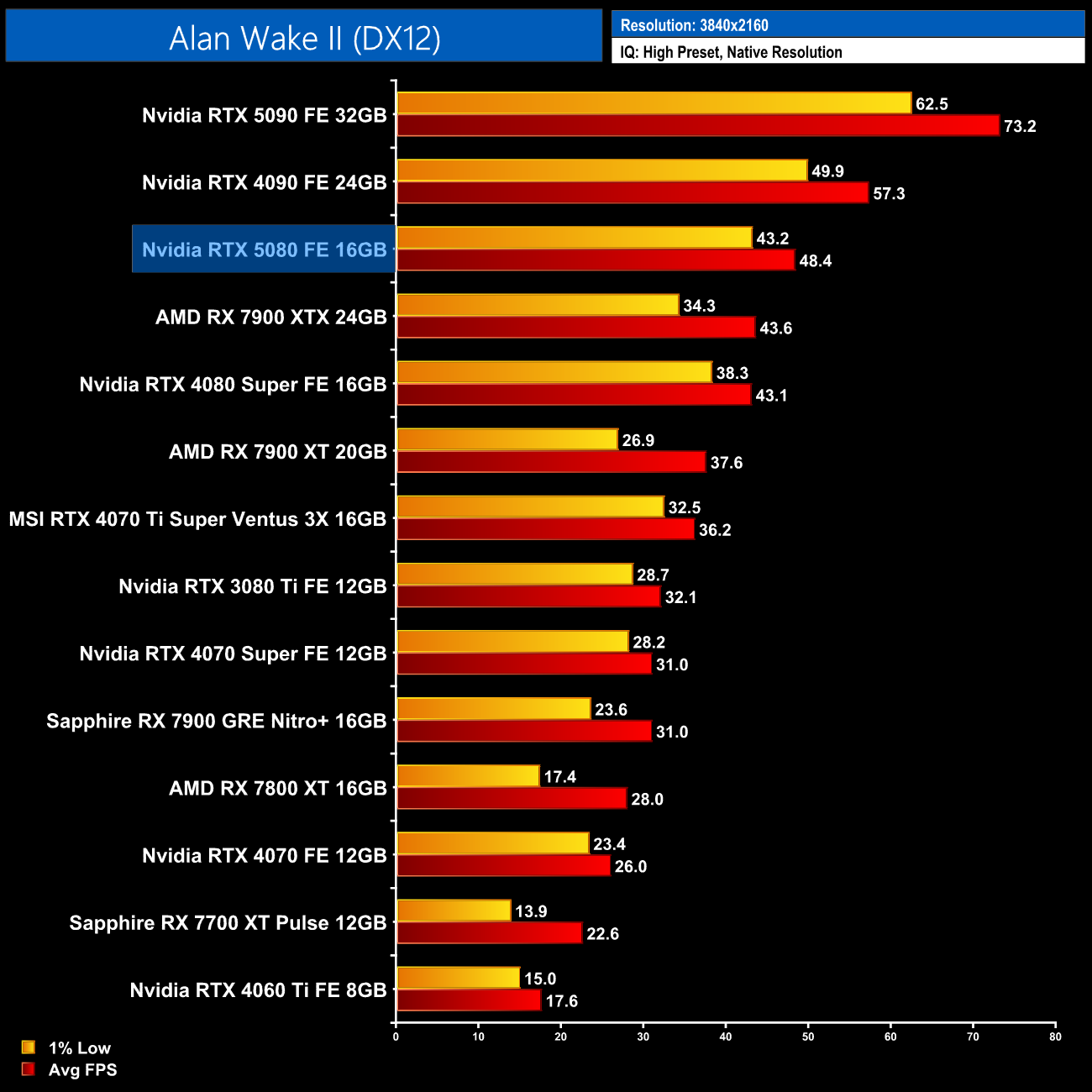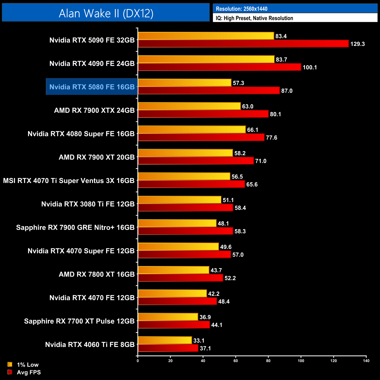 Kicking off the benchmarks with Alan Wake 2, as mentioned in the RTX 5090 review, we're still experiencing frametime issues with the new Blackwell GPUs, something I'd expect to be fixed soon with a driver update. However, looking at average frame rate, the RTX 5080 delivers 87fps at 1440p, putting it 9% ahead of AMD's RX 7900 XTX, while it's 13% faster than the RTX 4080 Super.